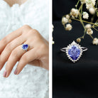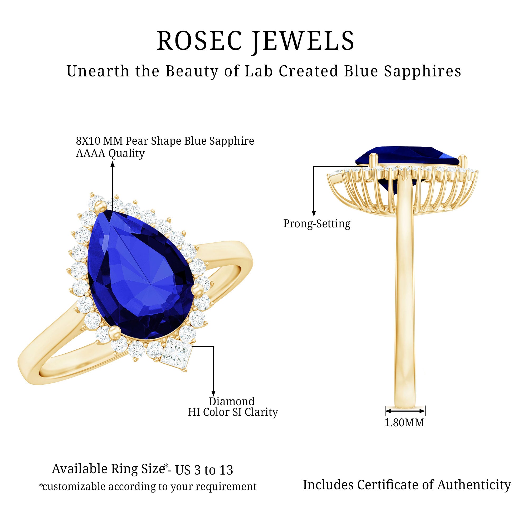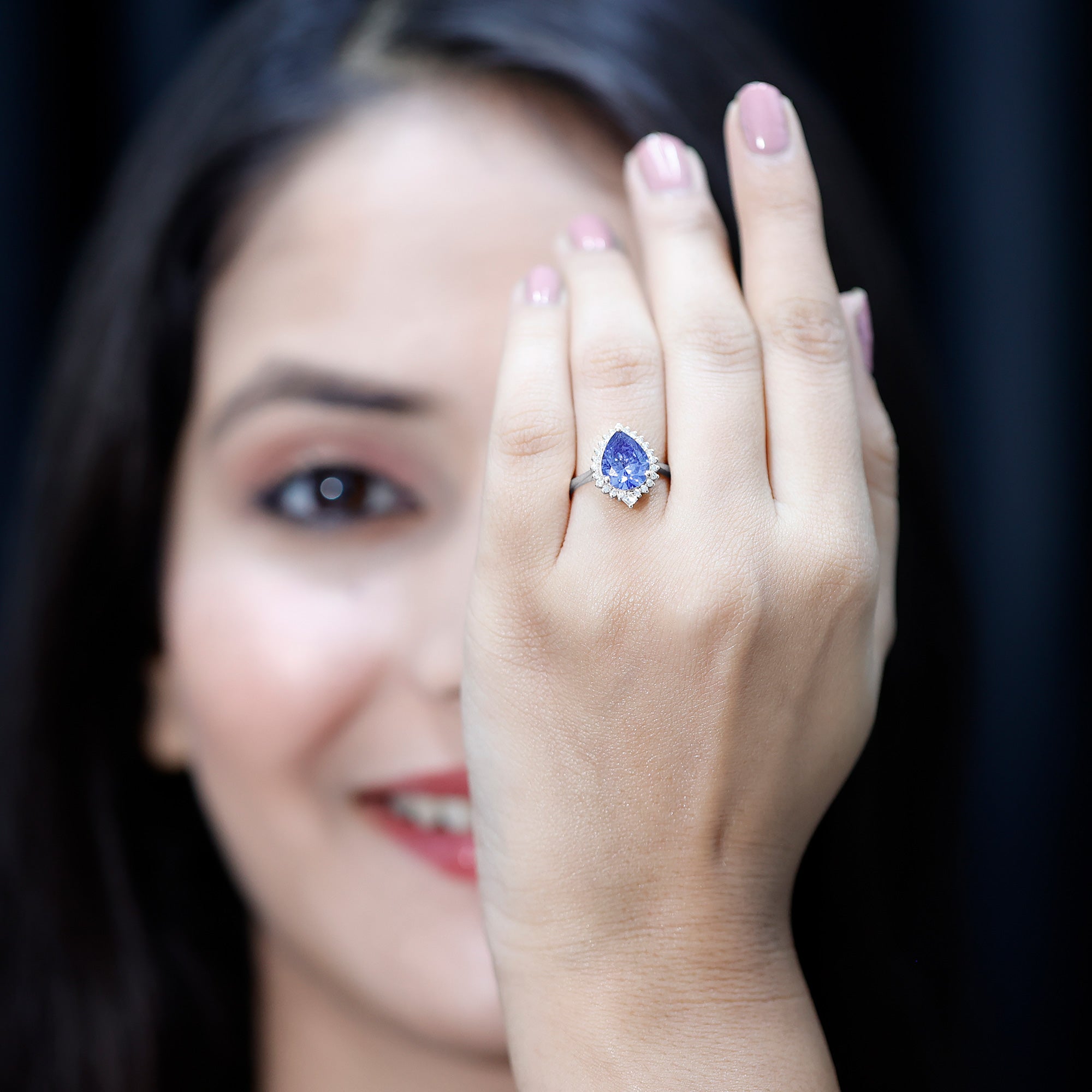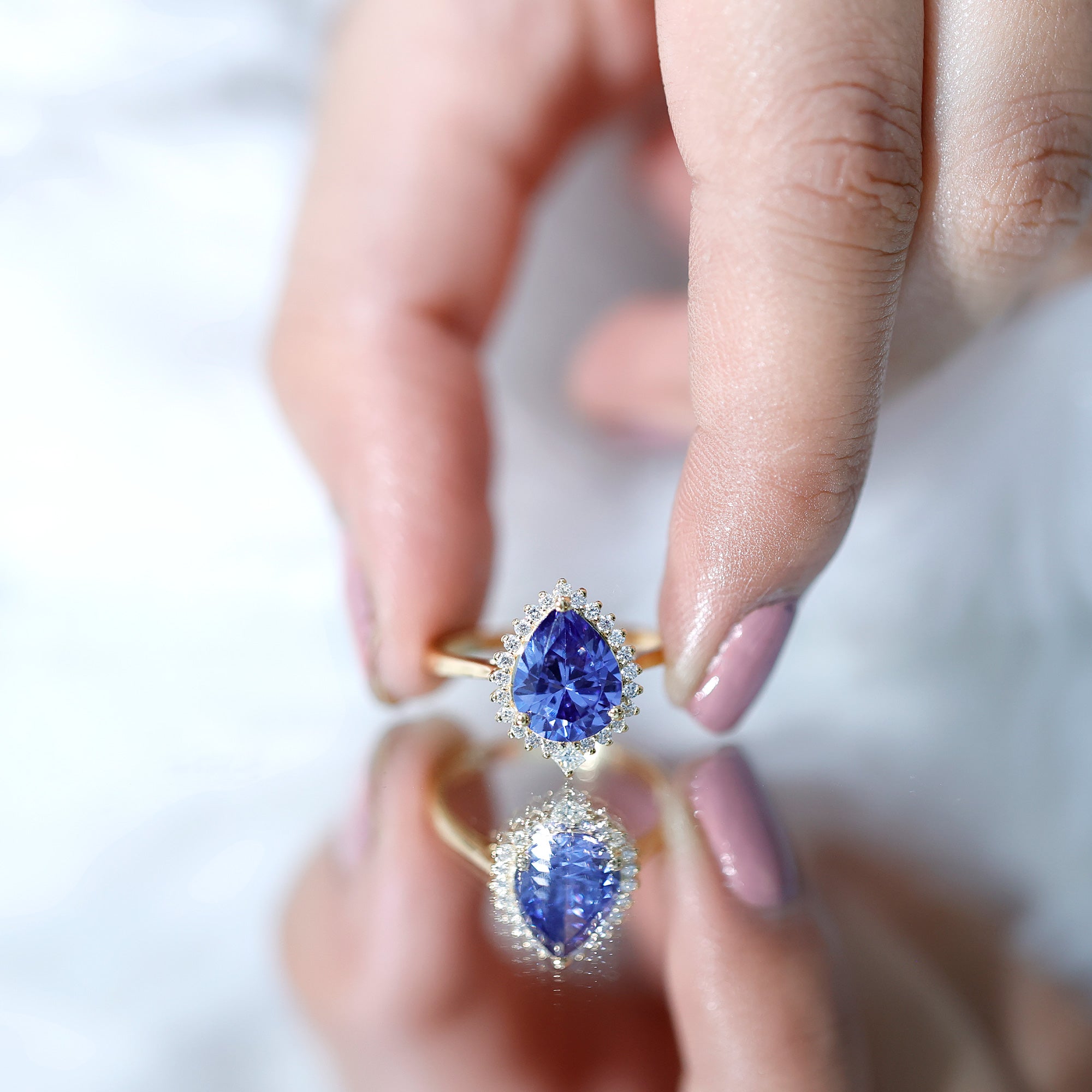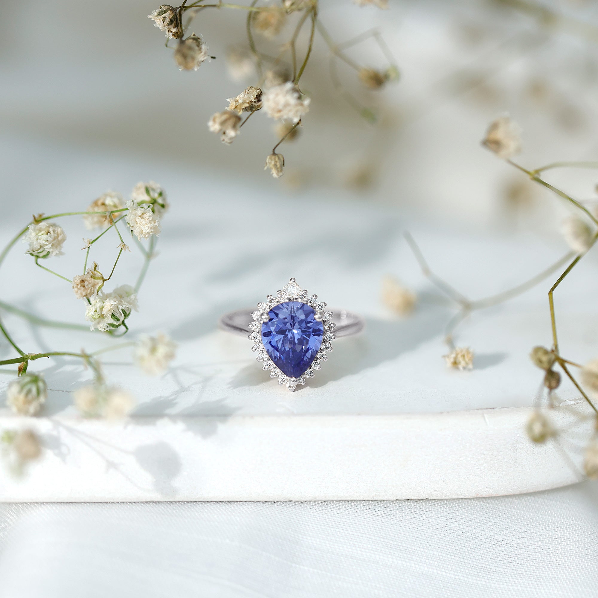 The perfect ring is an eloquent way to convey emotions to your better half. This beautiful ring will leave her on cloud nine, as the Created Blue Sapphire Engagement Ring effortlessly captures their attention. Adorned with a Pear Cut Created Blue Sapphire surrounded by a Diamond Halo, it exudes a glistening allure. This ring is an excellent choice for cocktail and engagement jewelry, a timeless symbol of love and celebration.