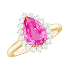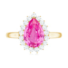 This stunning Teardrop Ring will surely capture everyones attention. Featuring a pear-cut created pink sapphire surrounded by round Diamond stones in a halo style, this ring exudes glamour and brilliance. Whether youre dressing up for a special occasion or want to elevate your everyday style, this dazzling piece is the perfect choice to leave a lasting impression and showcase your unique style.