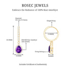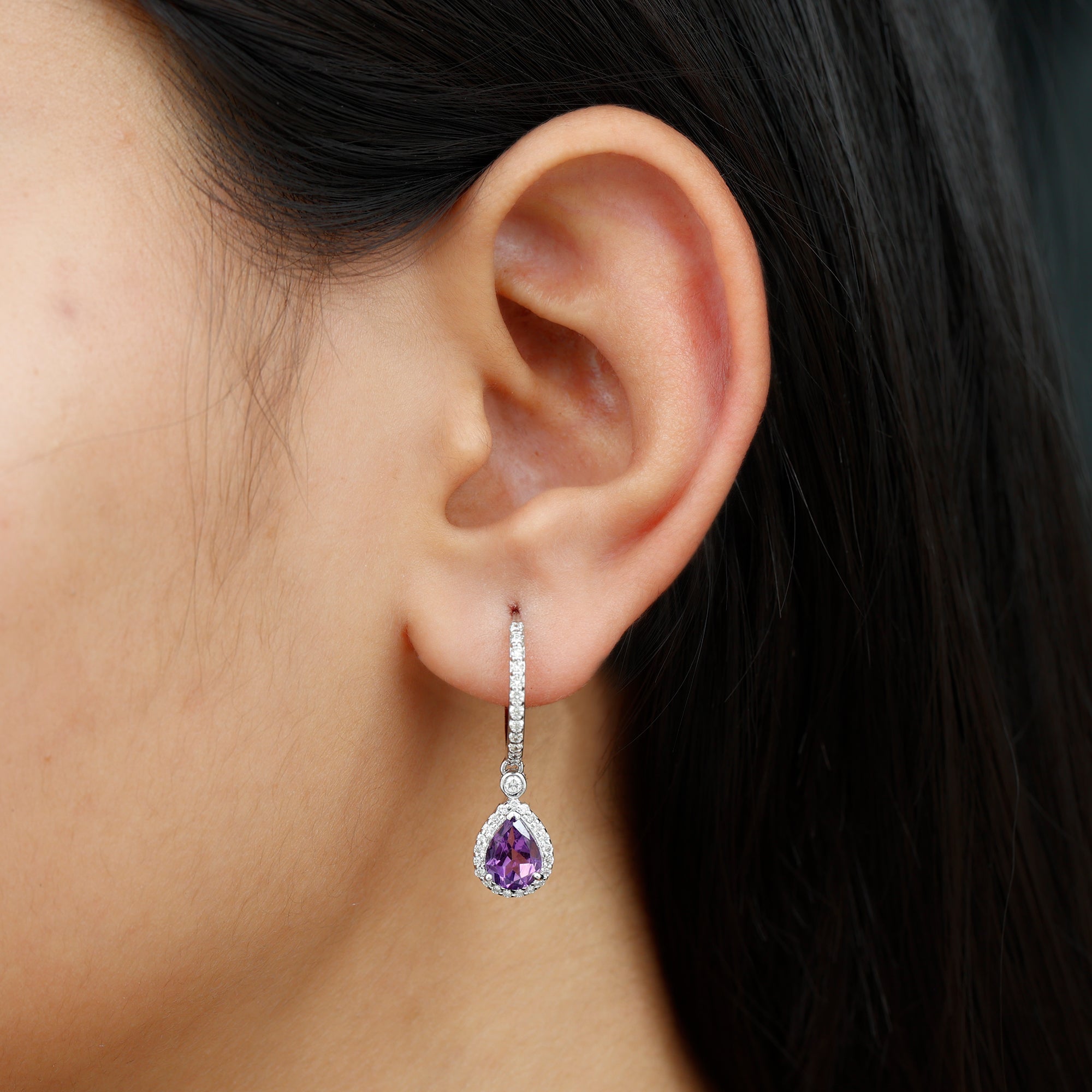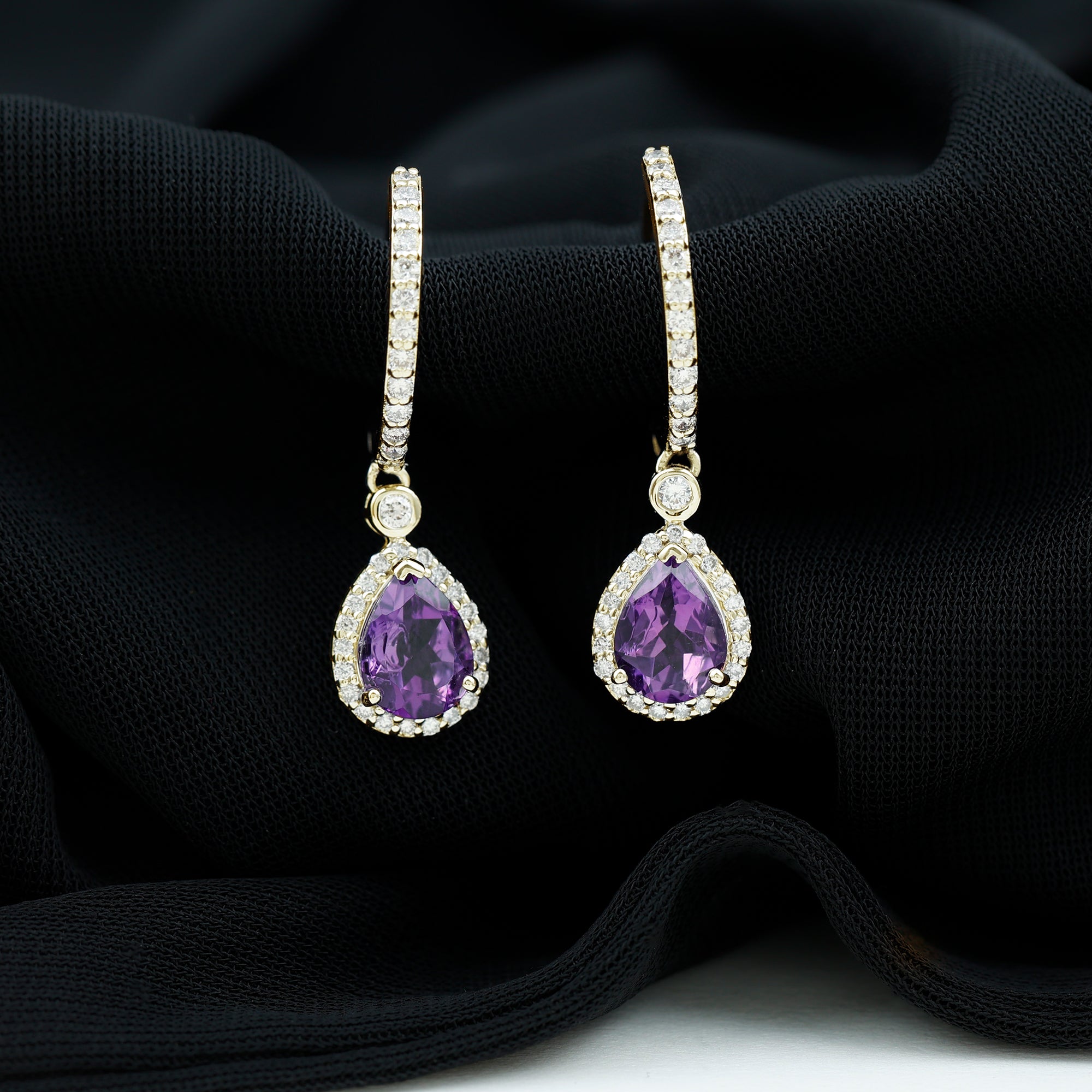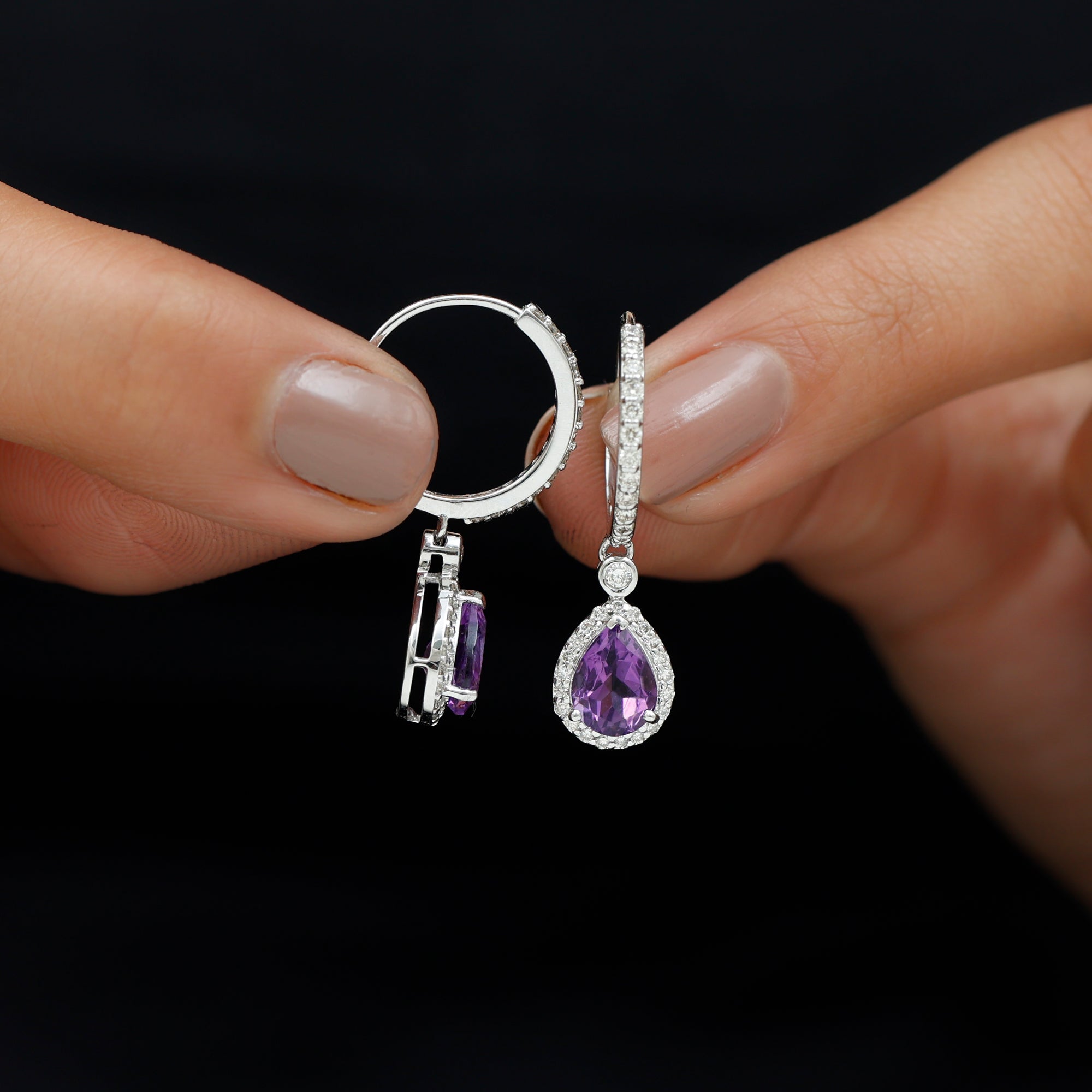 Pear Cut Amethyst Hoop Drop Earrings with Diamond Halo