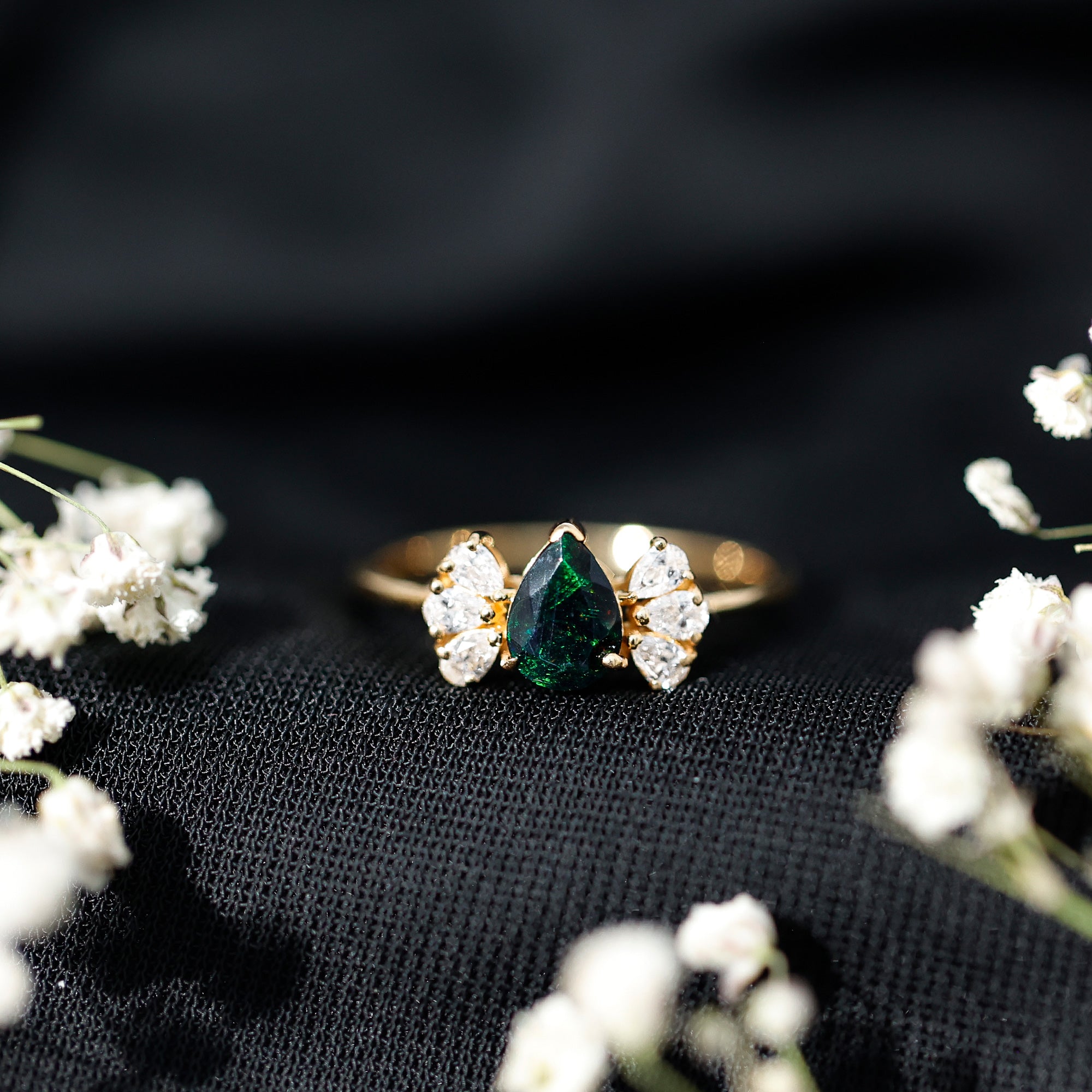 Pear Cut Black Opal Solitaire Engagement Ring with Diamond Trio