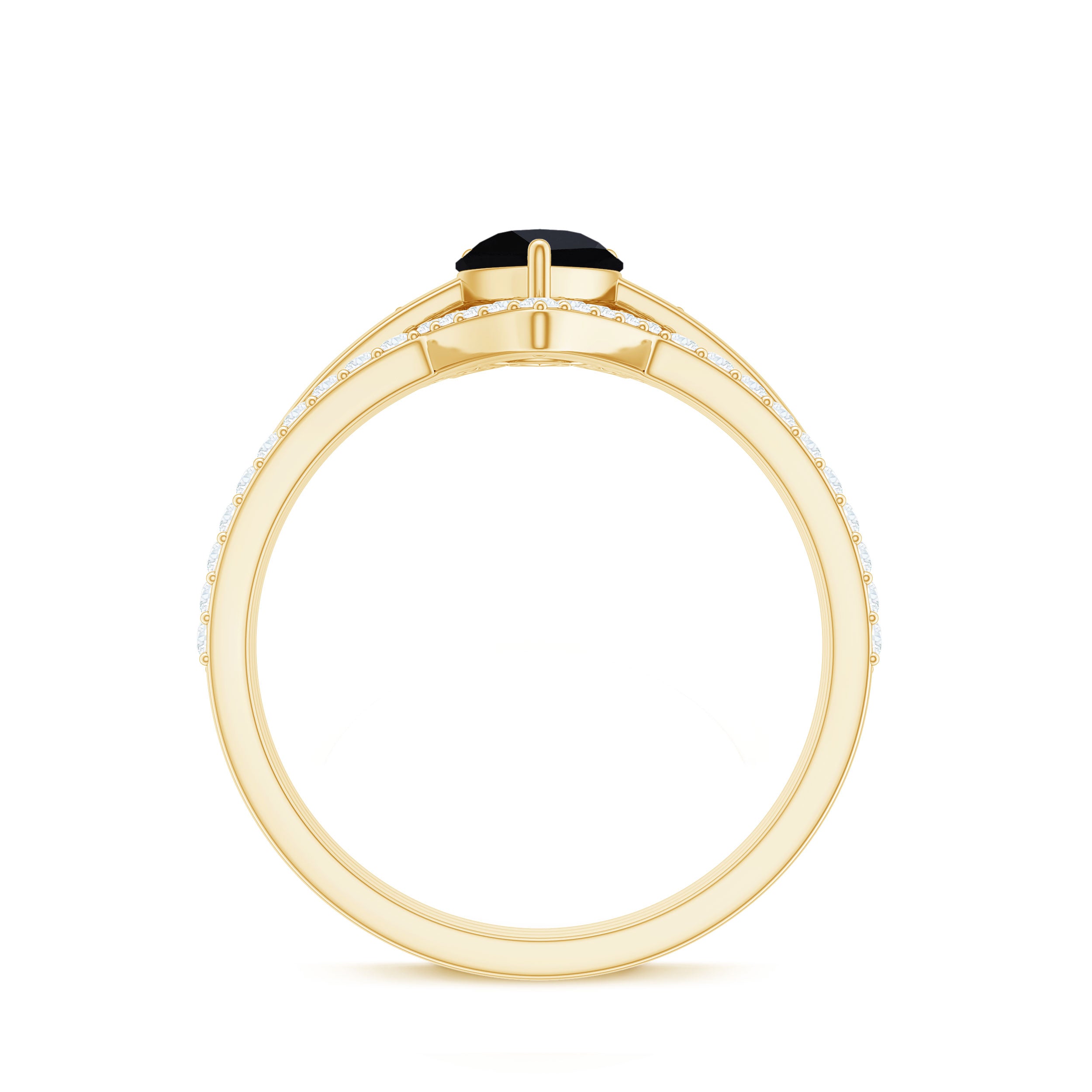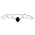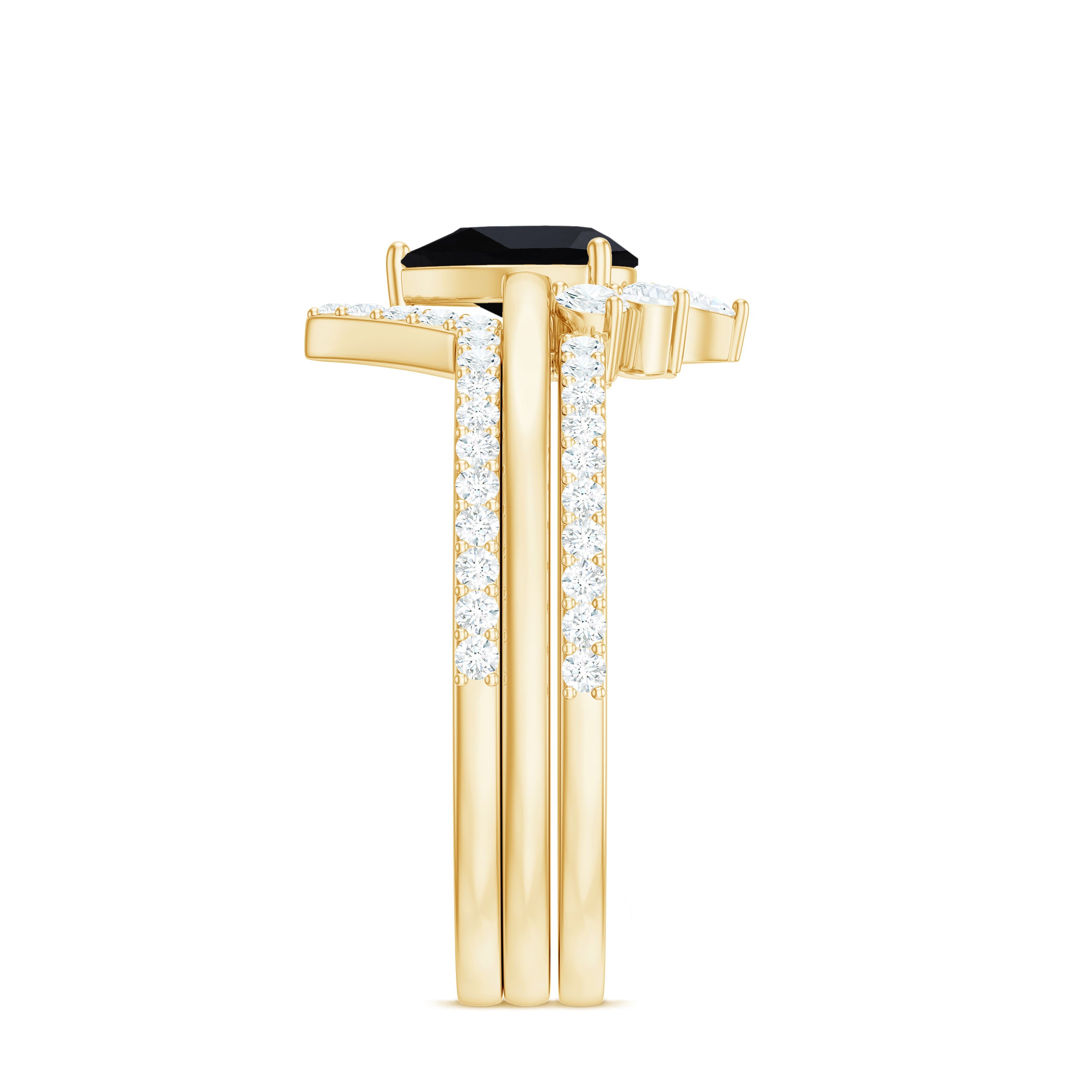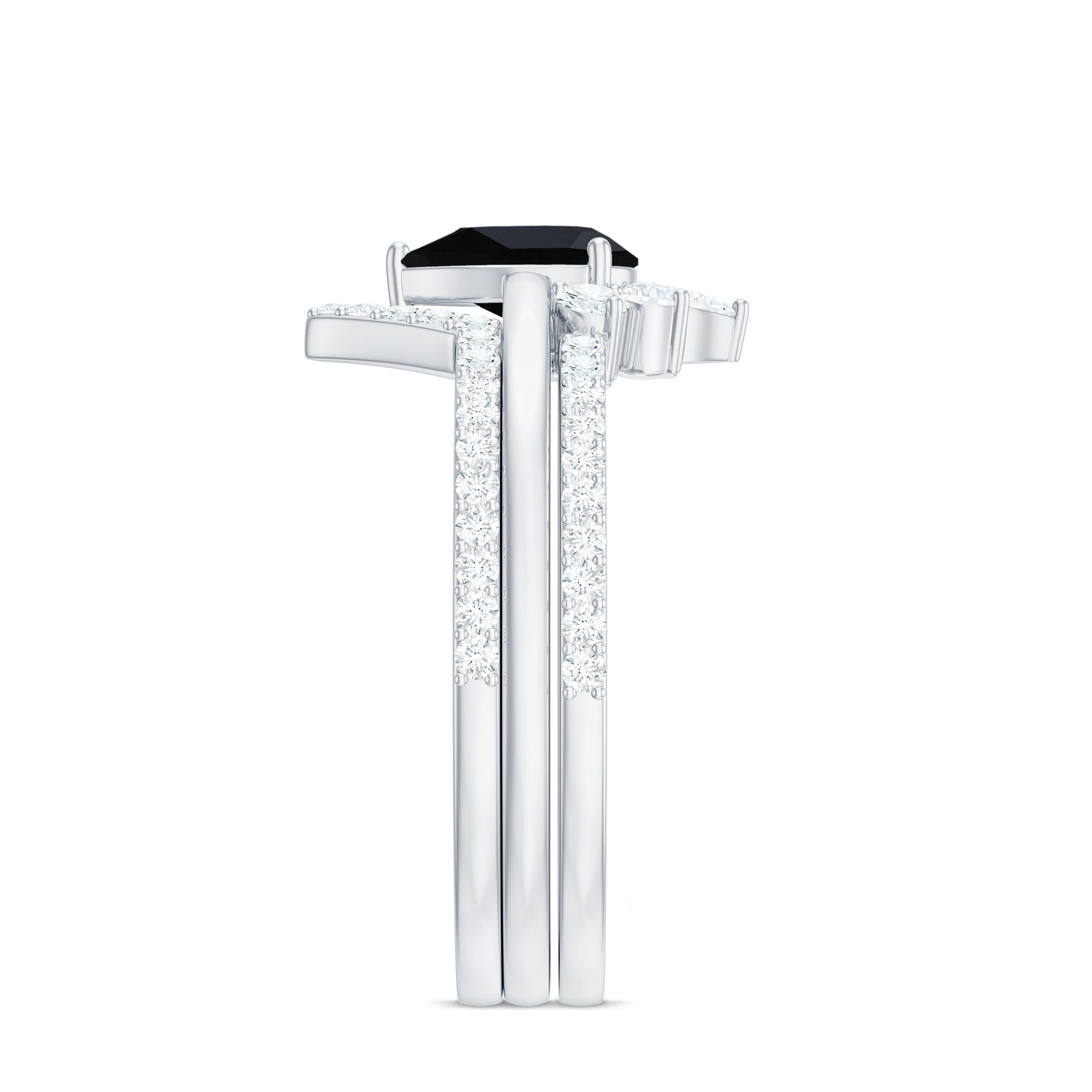 Make her big day even more memorable with this stunning Three Ring Set adorned with pear cut Black Spinel set as Solitaire in one ring with two enhancer featuring round moissanite stones. This Bridal Ring Set is a splendid choice for any woman, exuding elegance and sophistication. Surprise your lady with this exquisite moissanite ring set and let it be a cherished piece shell treasure forever, representing the beauty of your love on her big day.