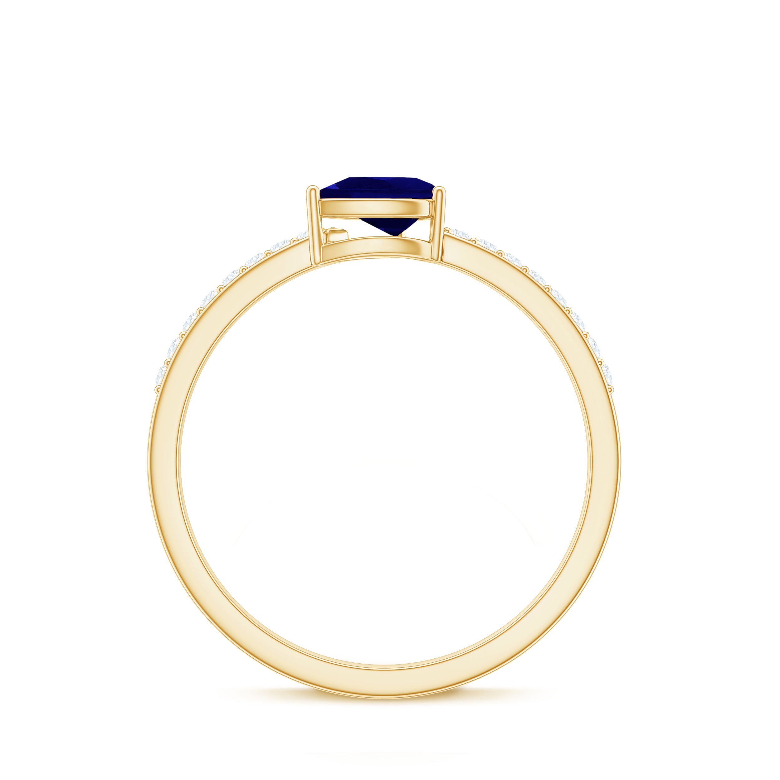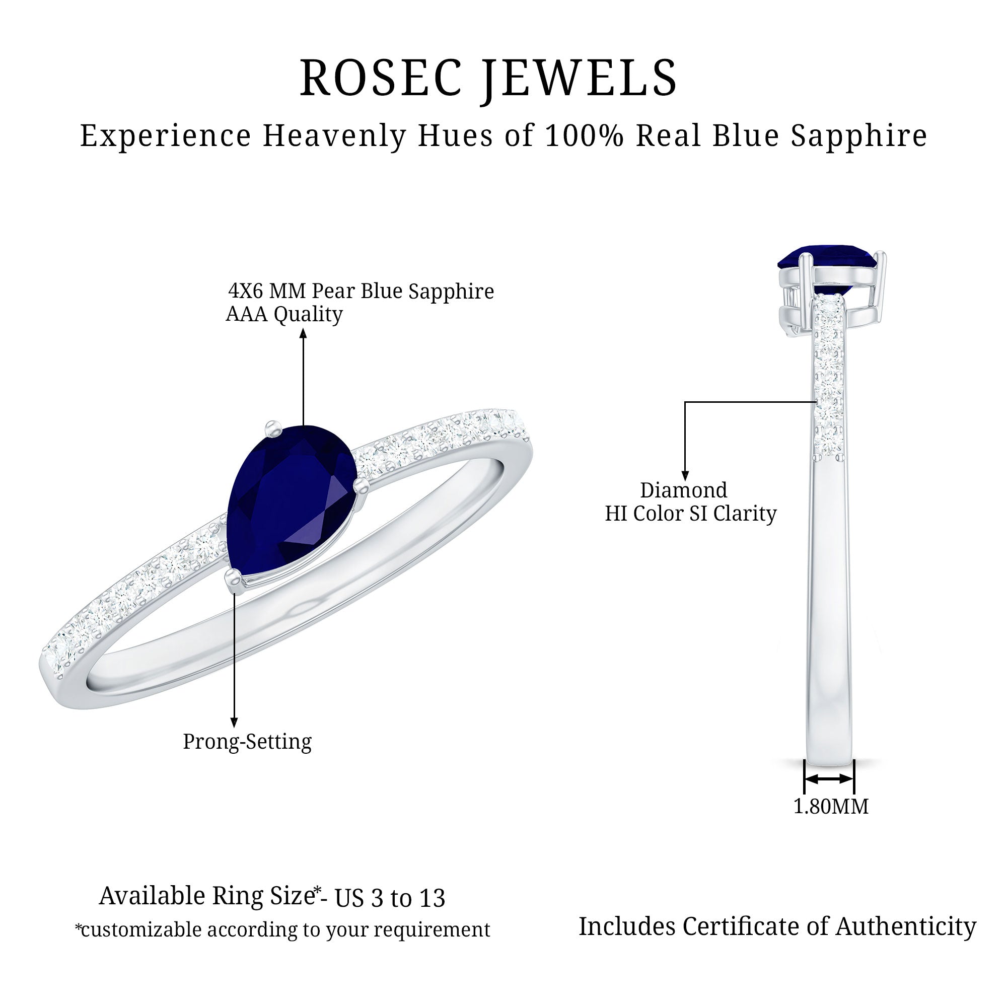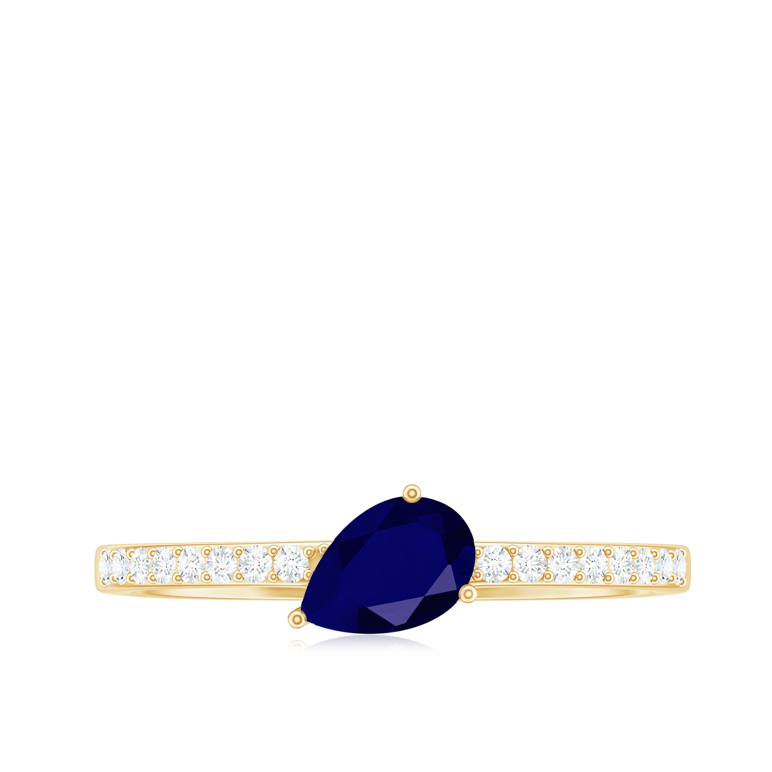 This exquisite Solitaire Promise Ring serves as a profound symbol of your enduring commitment. At its center, a breathtaking Pear Cut Blue Sapphire takes the spotlight, beautifully cradled within a secure Prong Setting. Alongside, the graceful presence of Round Shape Diamonds on either side enhances the allure with their delicate Pave Setting.