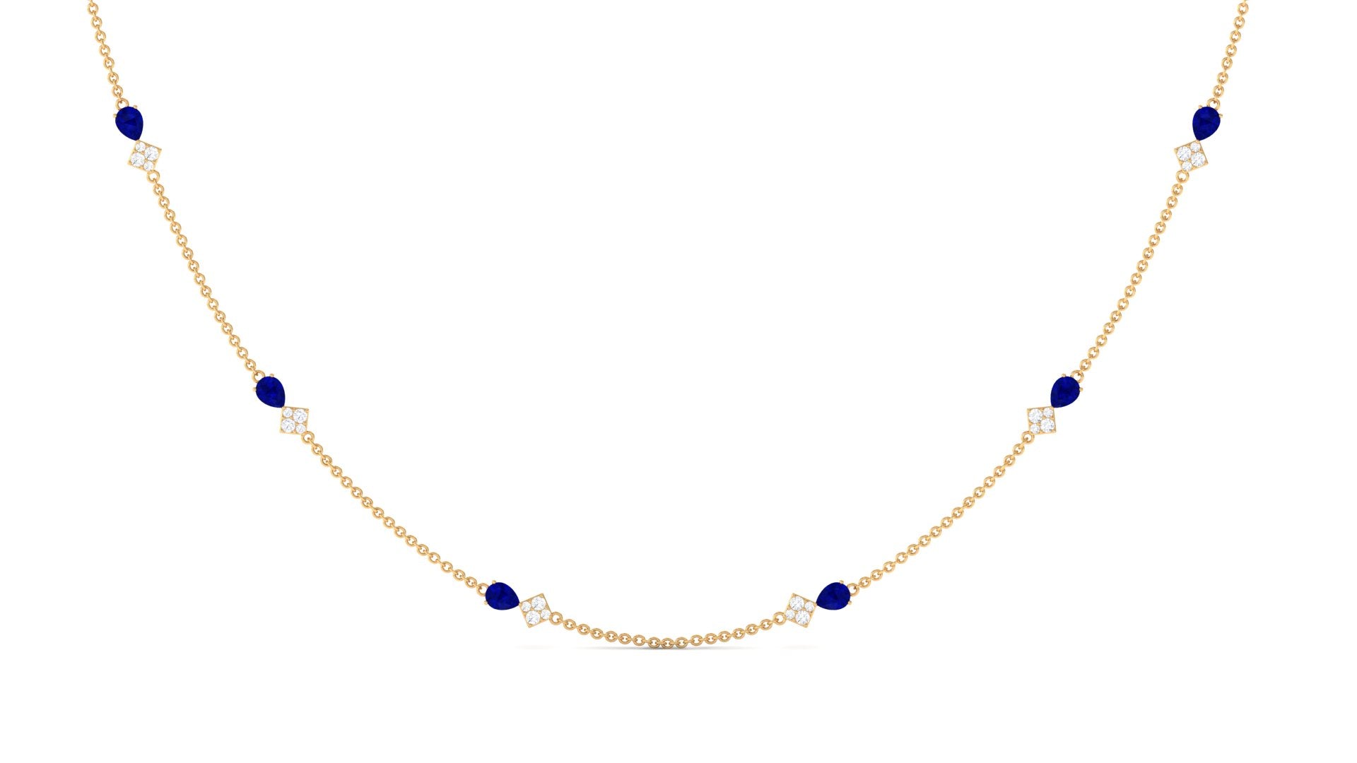 Add a touch of glamour to your outfit with this stunning necklace featuring a pear-cut Created Blue Sapphire in a prong setting, surrounded by Diamond stones. The gold station chain adds a touch of elegance, and the necklace is made from solid gold, making it a perfect piece of jewelry to celebrate and honor someone special.