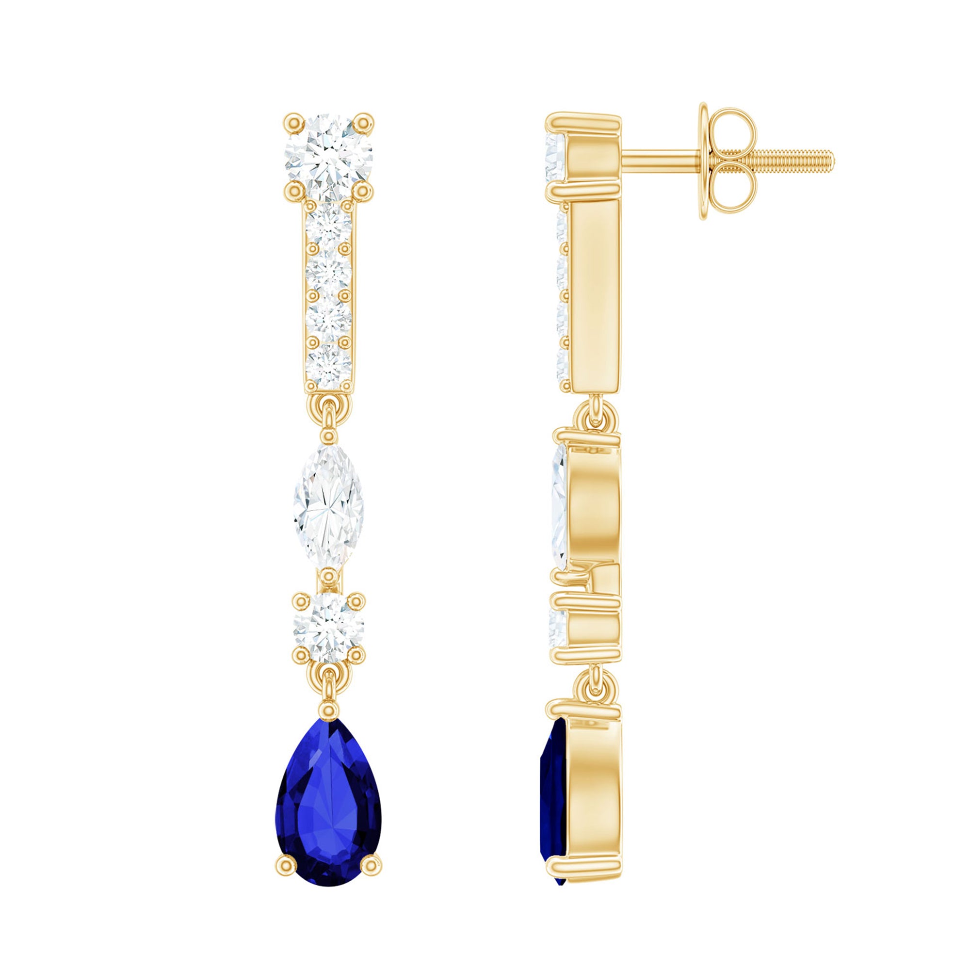 Pear Cut Created Blue Sapphire and Moissanite Long Dangle Earrings