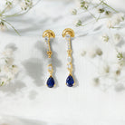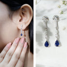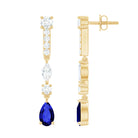 Experience the elegance of our dangle earrings, featuring a pear-shaped created blue sapphire, round and marquise cut moissanite. These exquisite gems are complemented by a metal strip adorned with sparkling moissanite stones, adding a touch of sophistication to the design. With its timeless appeal, these long dangle earrings serve as the perfect classic accessory for any occasion. Crafted with exceptional quality, they are designed to be your everyday companion, ensuring unmatched longevity and durability.