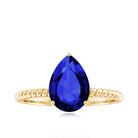 Experience the brilliance of this solitaire ring, showcasing a resplendent pear-cut created blue sapphire in a prong setting with bezel set hidden moissanite, radiating an immense and captivating glow. The addition of a metal twisted shank introduces a unique element to the otherwise minimalist design, making this ring a truly exceptional and eye-catching piece.