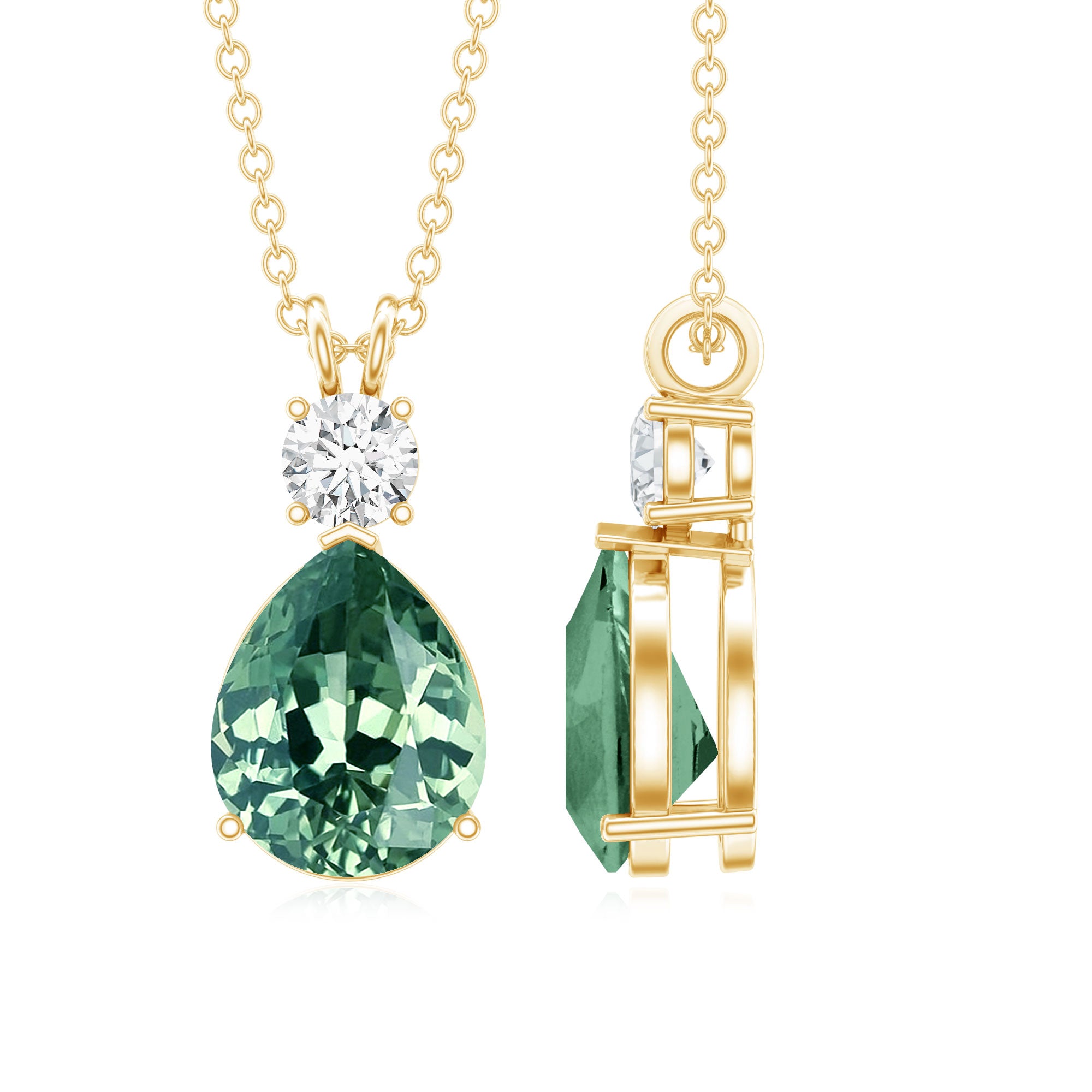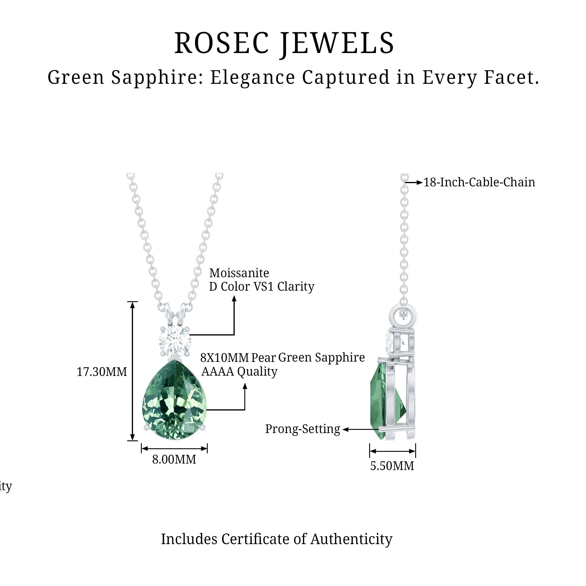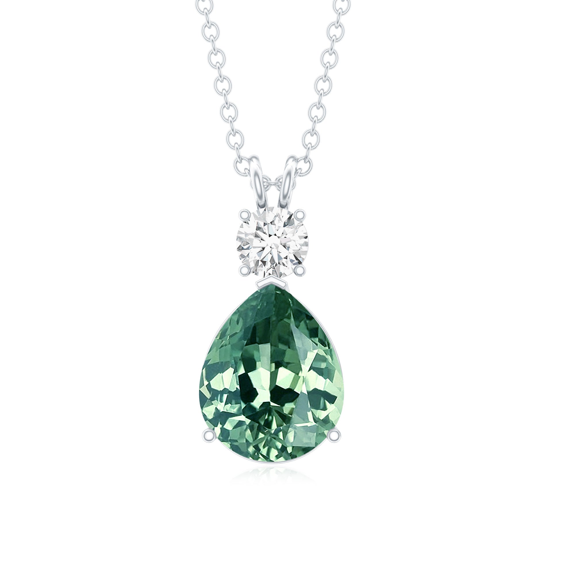 Level up your fashion game by donning this Drop Pendant Necklace embedded with Pear Shape Created Green Sapphire secured in 3 Prong Setting while Round Moissanite studded on the top.