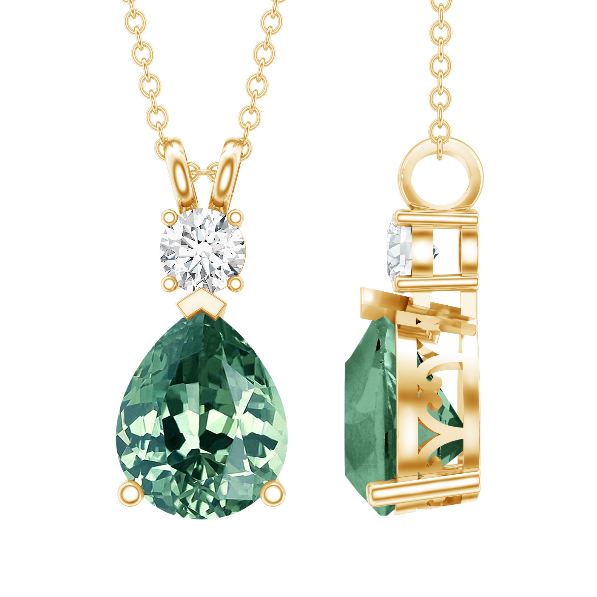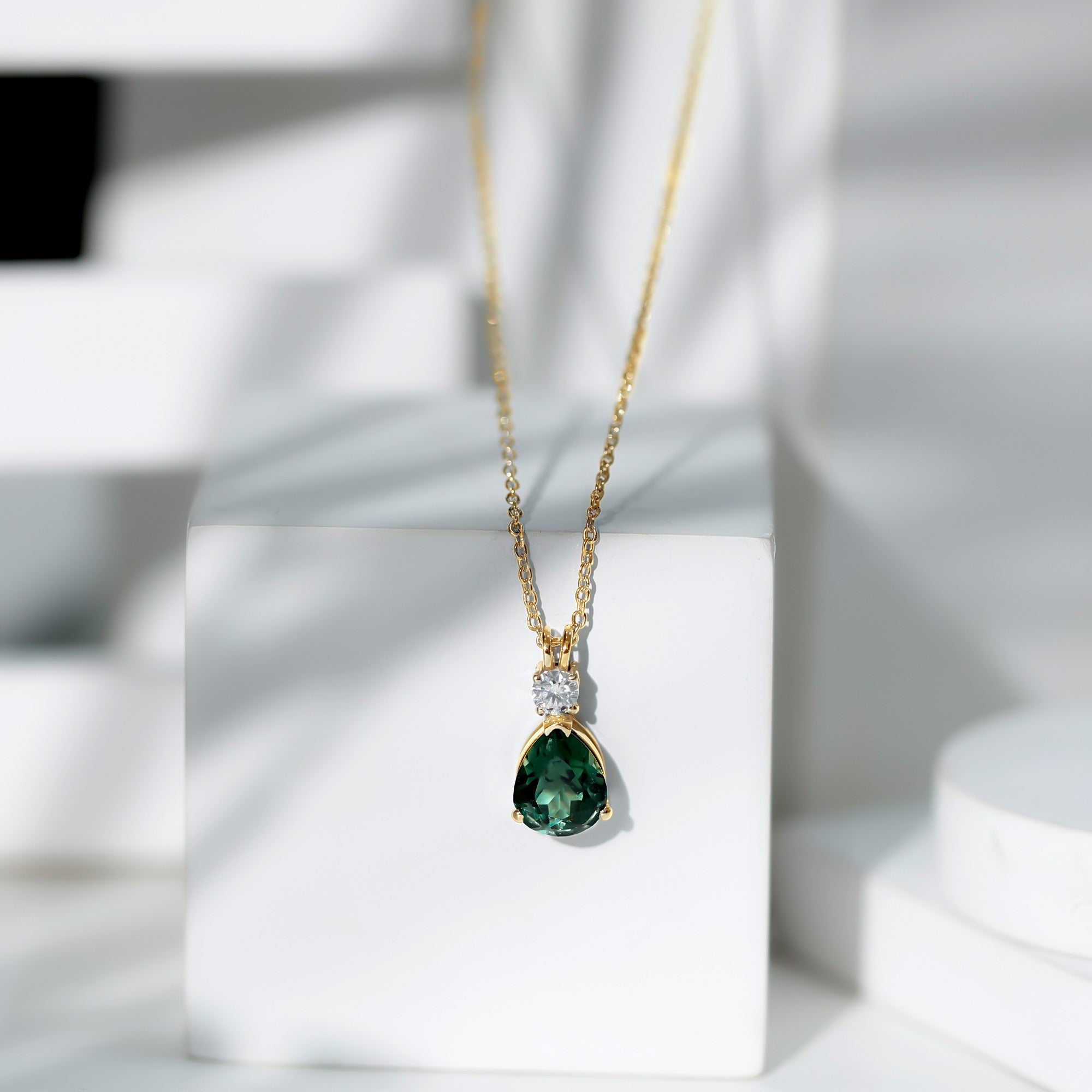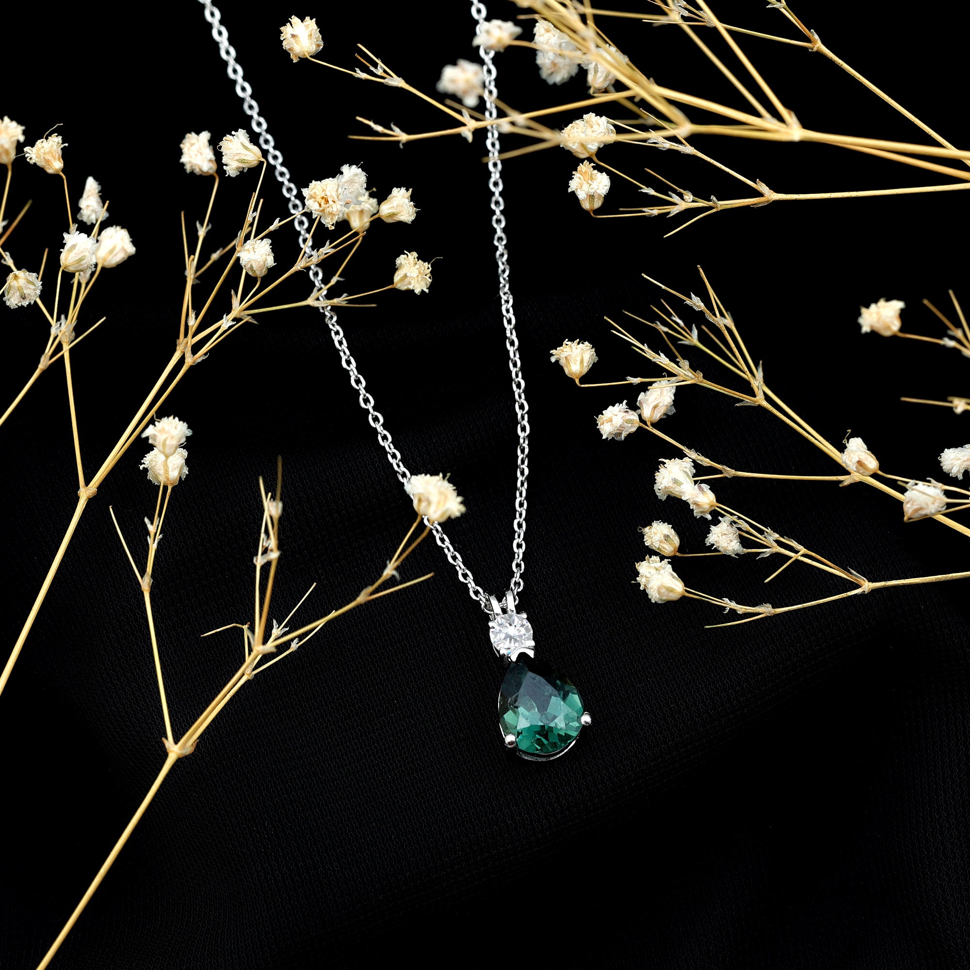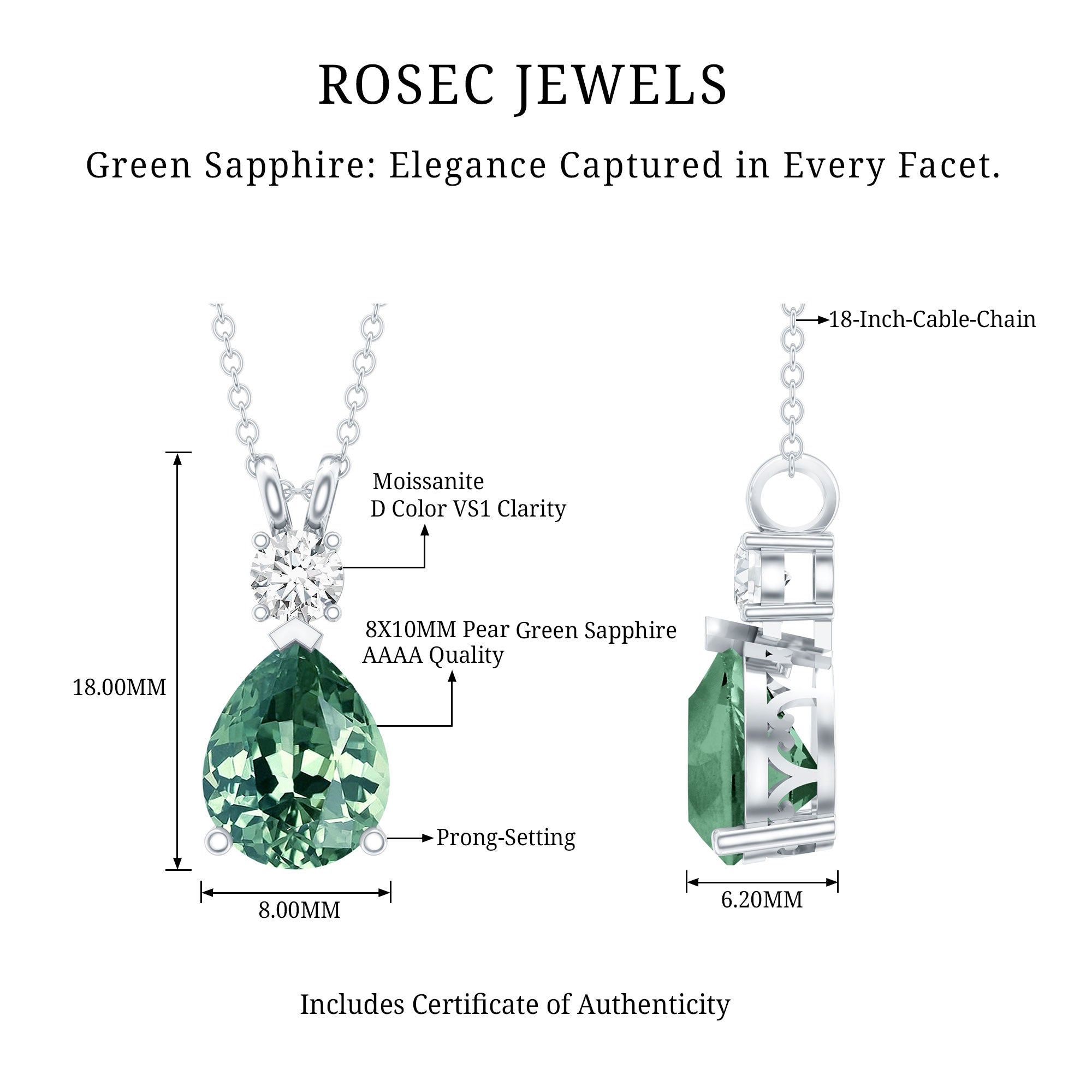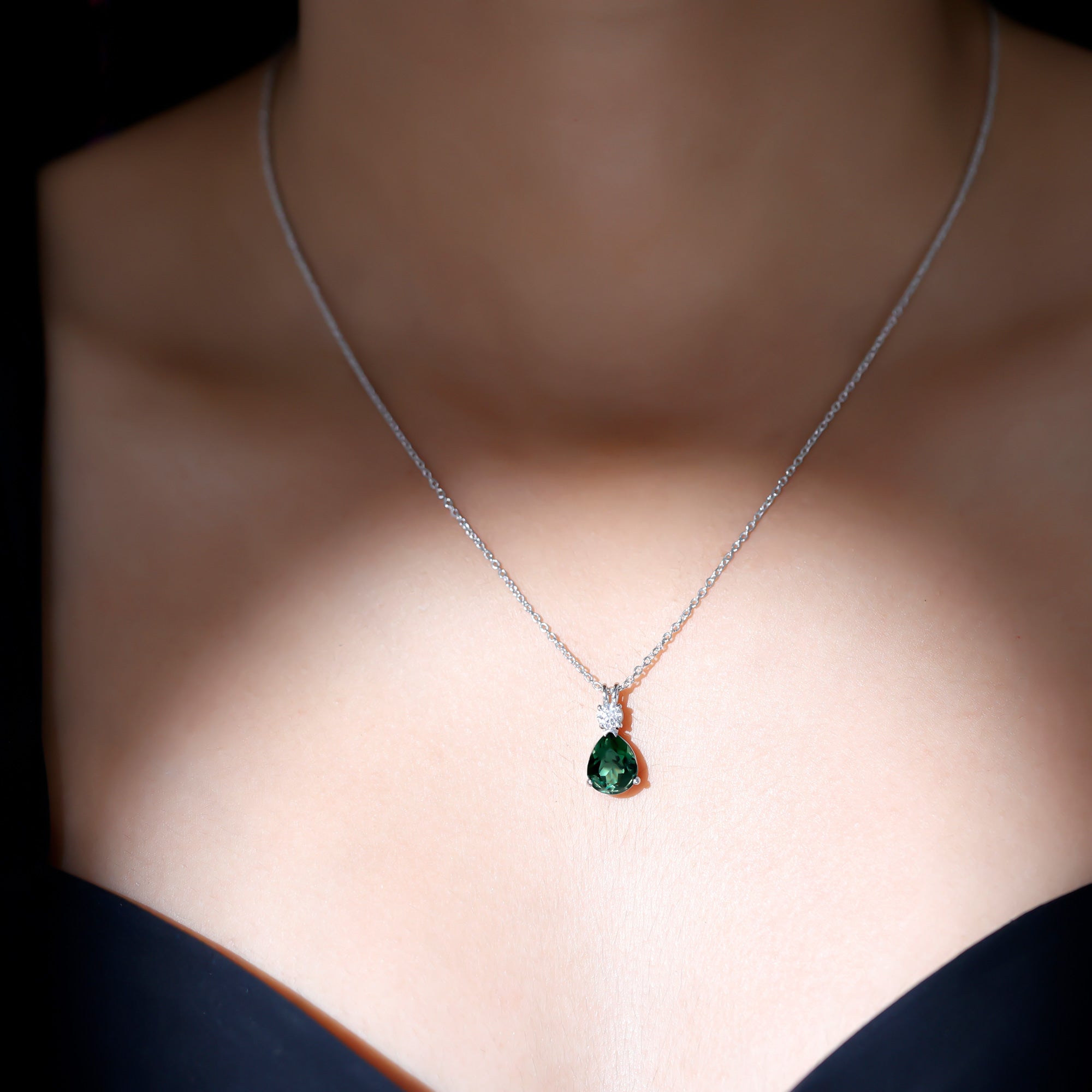 Experience allure with this Teardrop Pendant, featuring a Pear Cut Created Green Sapphire adorned with a shimmering Moissanite stone on top. The captivating combination of created green sapphire and sparkling moissanite creates an elegant piece of jewelry, perfect for special occasions or as a cherished gift for a loved one.