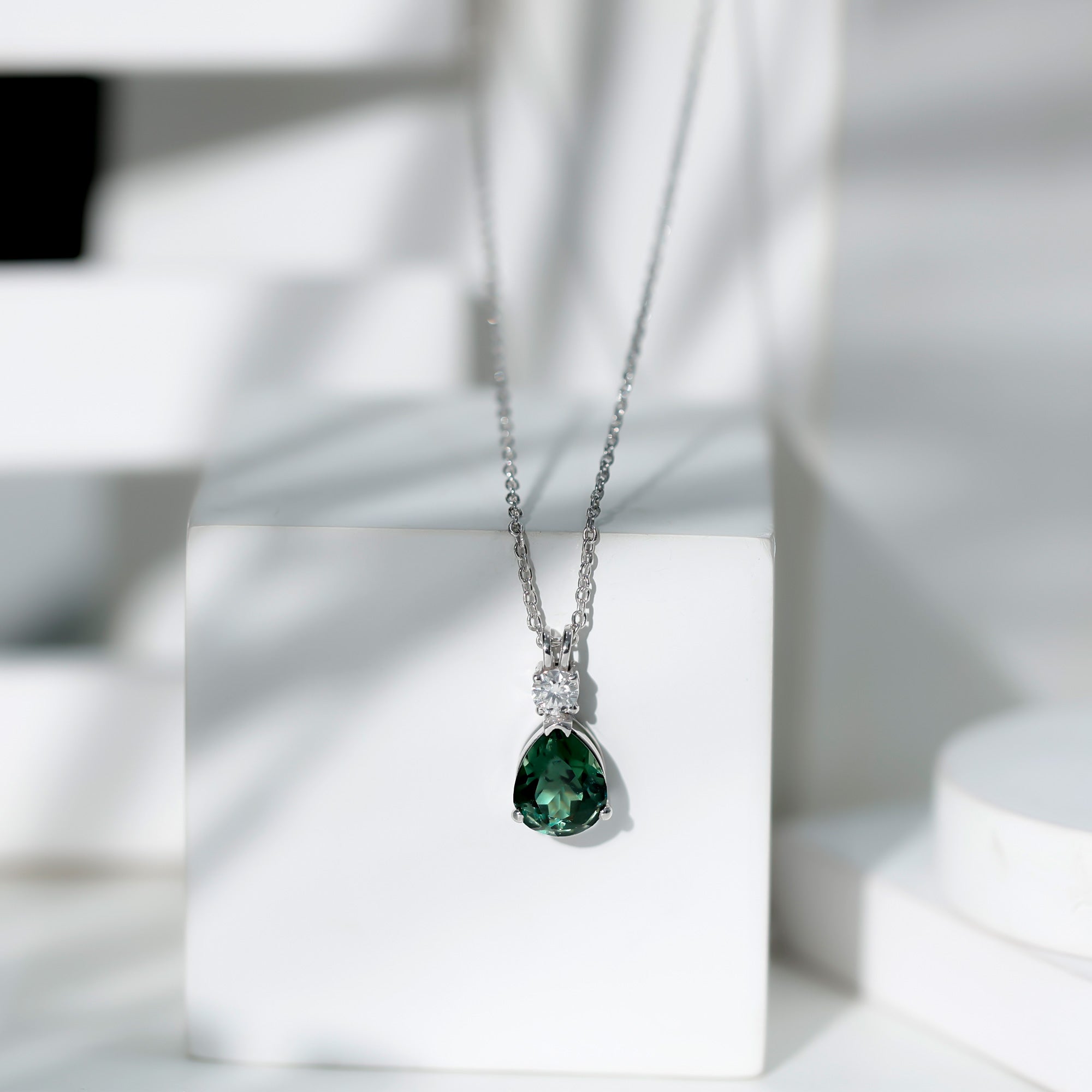 Pear Cut Created Green Sapphire Drop Pendant with Moissanite