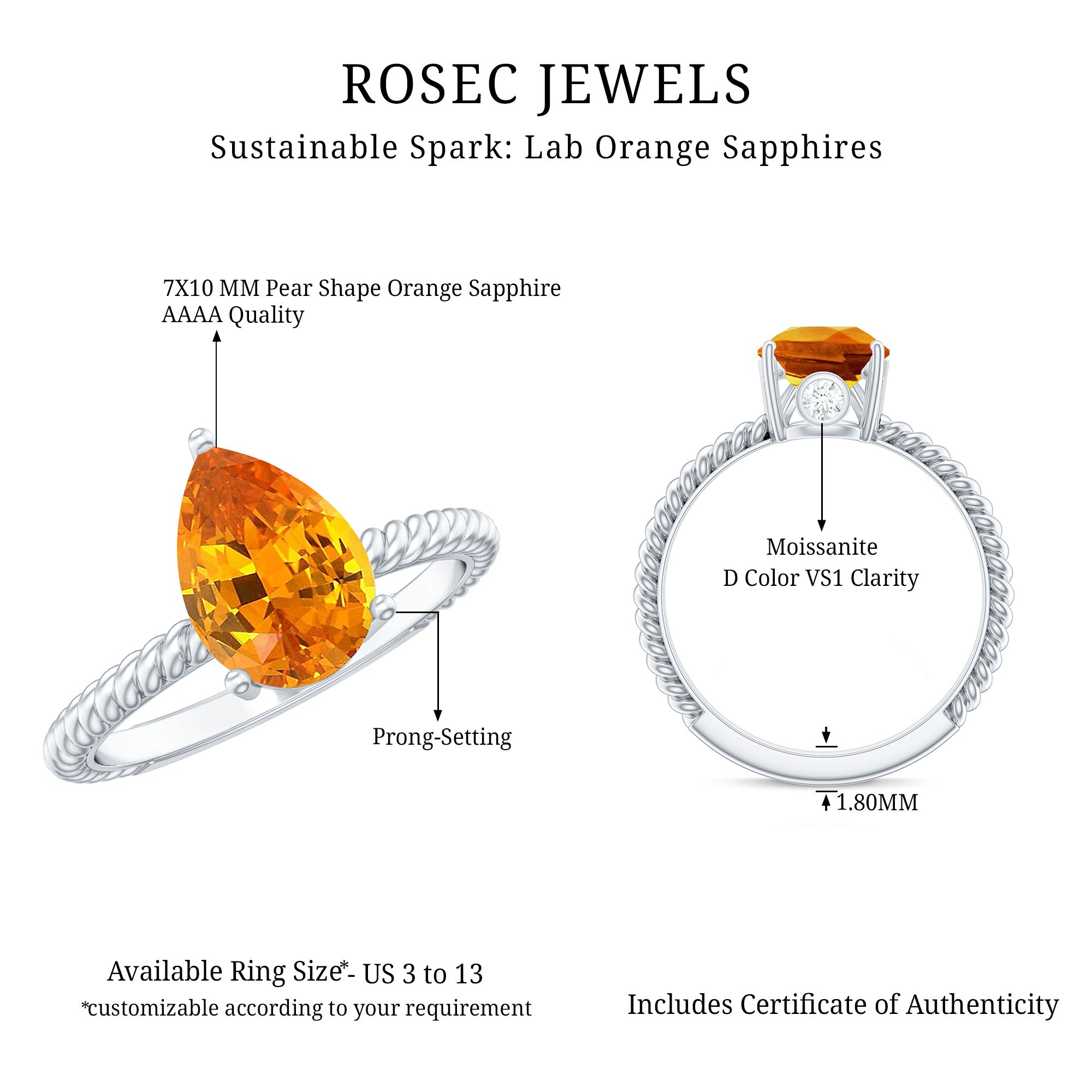 The elegant Solitaire Engagement Ring is embellished with Pear Shaped Lab Created Orange Sapphire secured in 3 Prong Setting while dainty Round Shape Moissanite studded on the bridge of the ring. You can style this Created Orange Sapphire Ring with your everyday or party attires to make everyone a fan of your style.