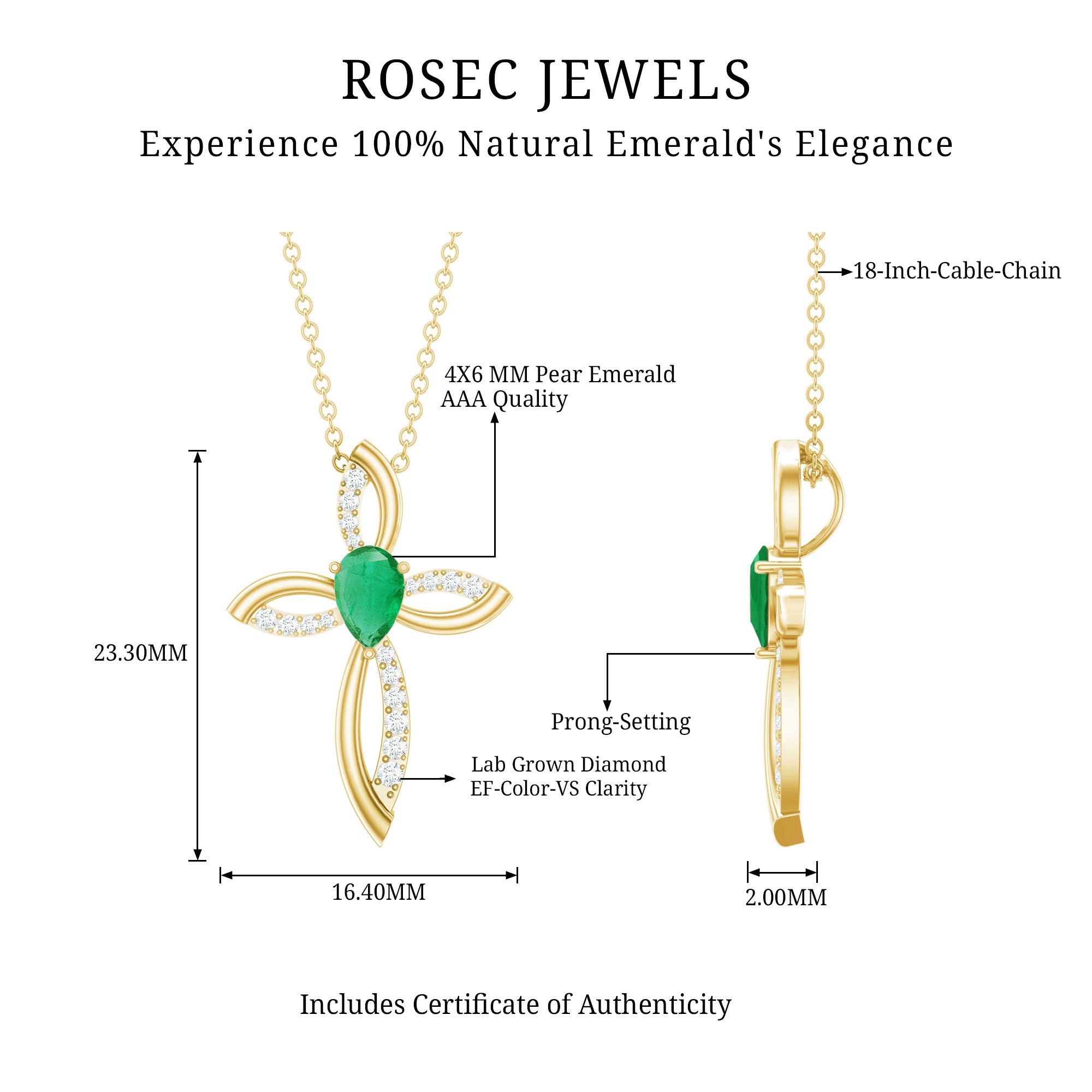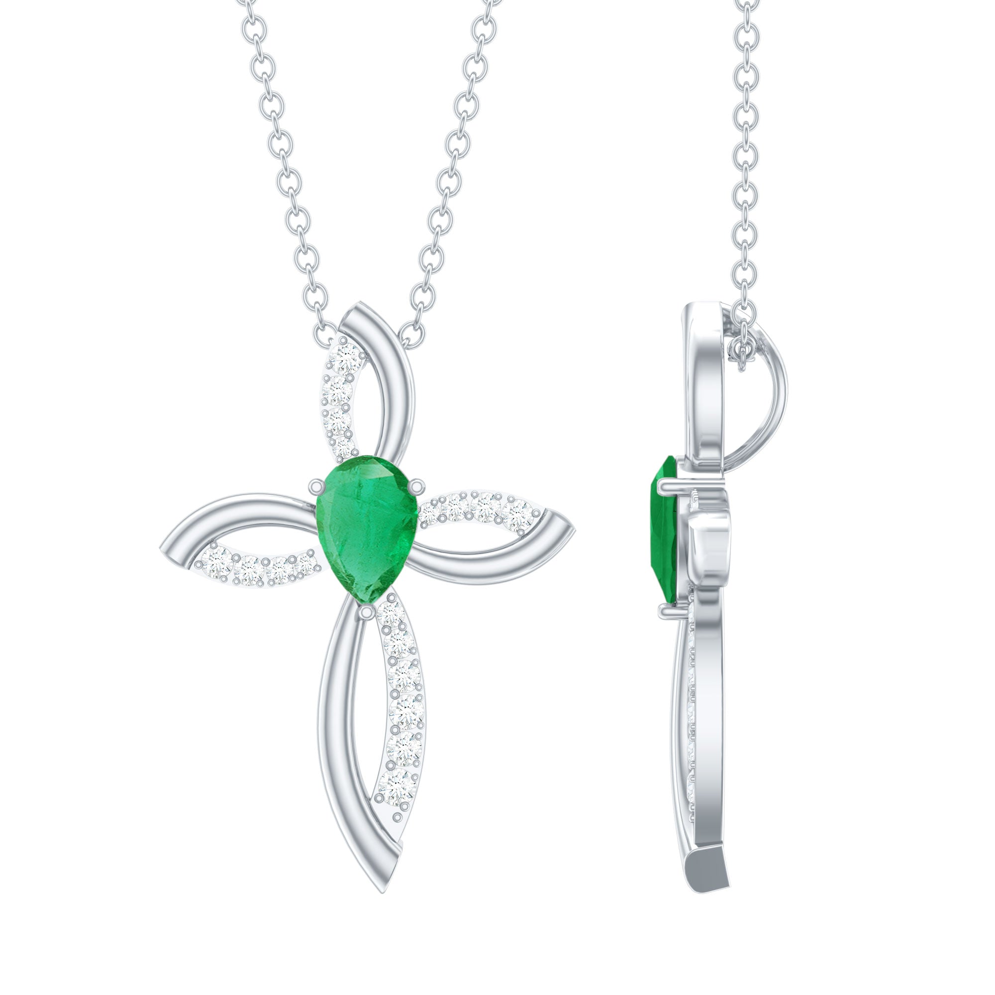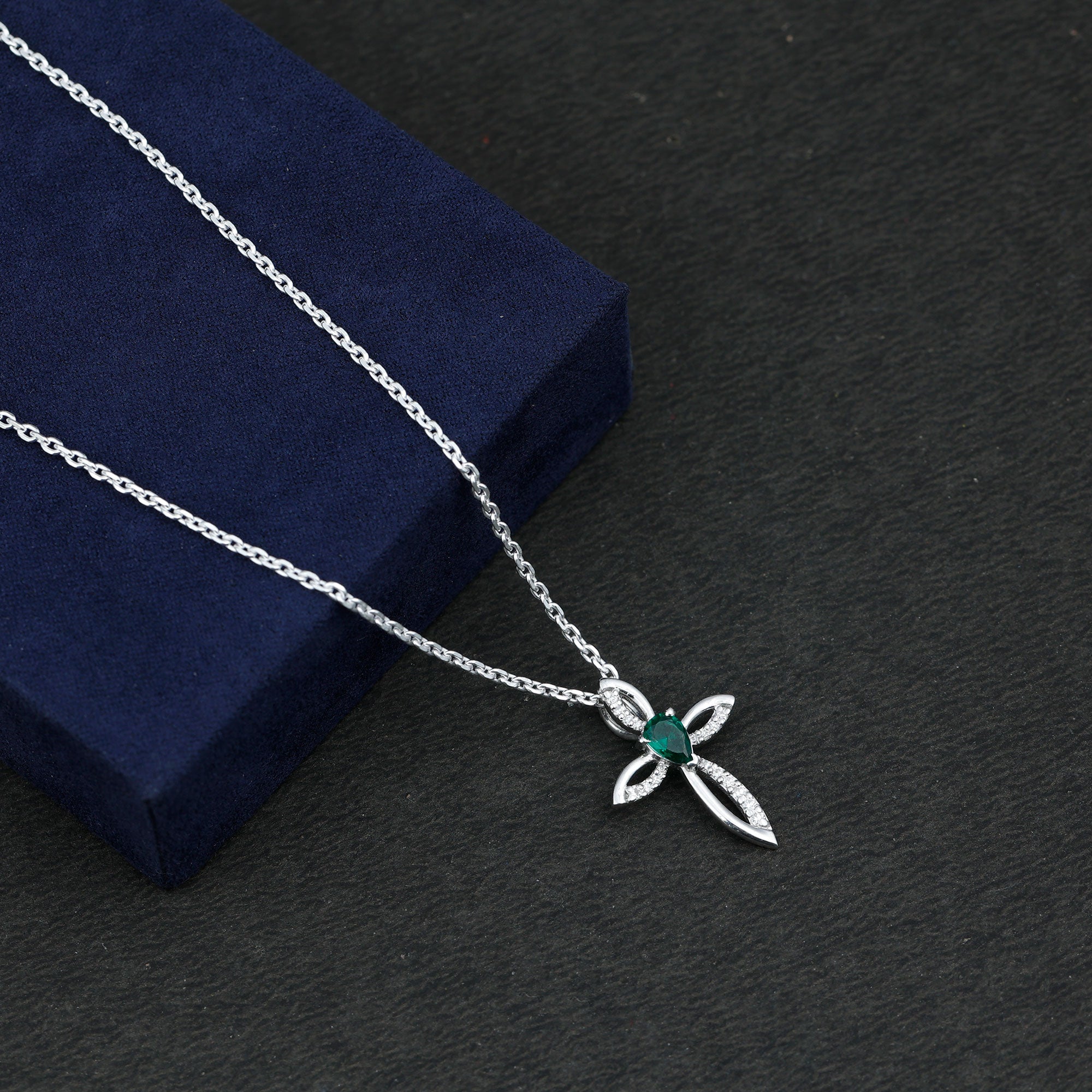 Looking for a unique gift for her that not only adds grace but also celebrates her faith, Rosec Jewels got you this Emerald Cross Necklace. This features a 4X6 MM Pear Shape Emerald set in prong setting in the center of a cross-shaped metallic frame decorated with small round cut lab grown diamonds. Comes with a certificate of Authenticity, this Emerald and Diamond Necklace is a classic piece of jewelry, praised by everyone who sees it. Give your blessings and show your never-ending love to your special one in the form of this Christian Pendant, it expresses every emotion when words are not enough. Whether you are heading to the office, dressing up for a special occasion, or simply elevating your everyday style, this Cross Infinity Necklace will give you the perfect look.