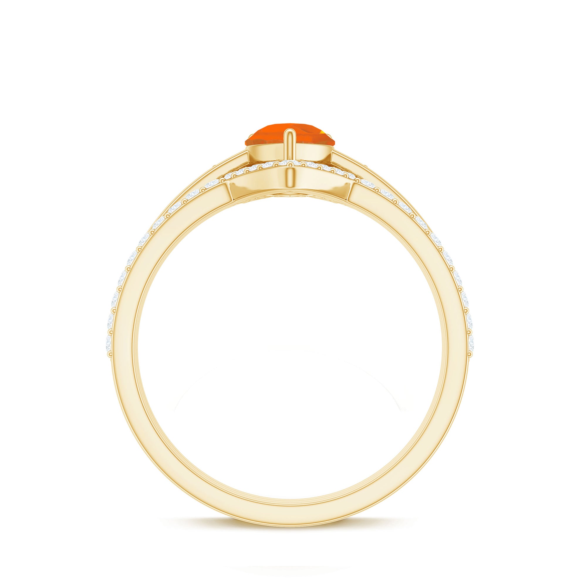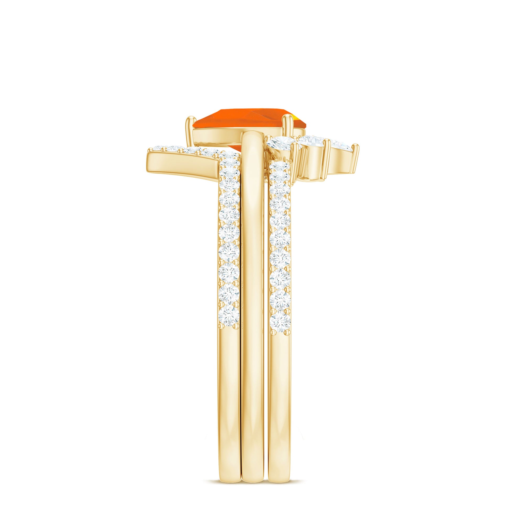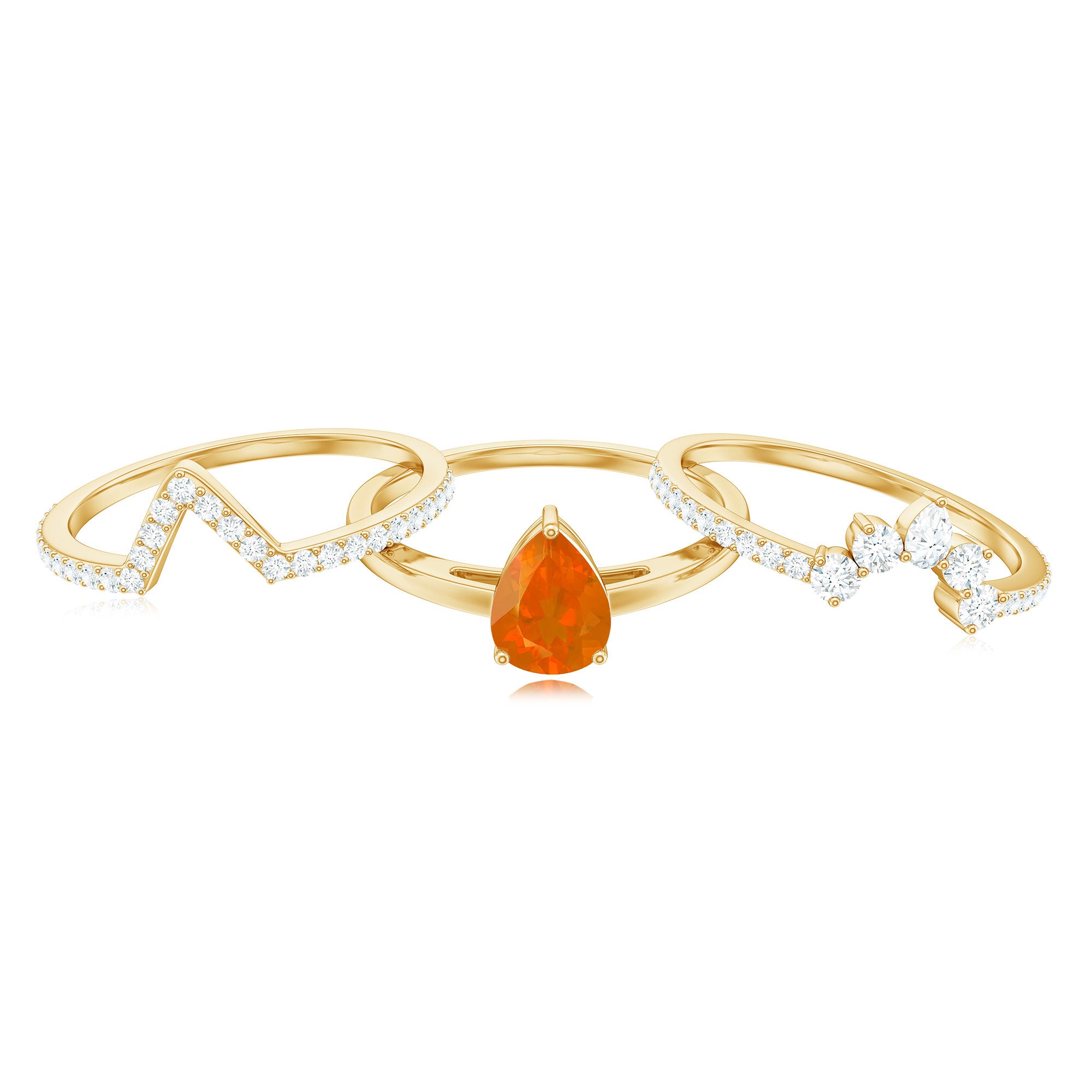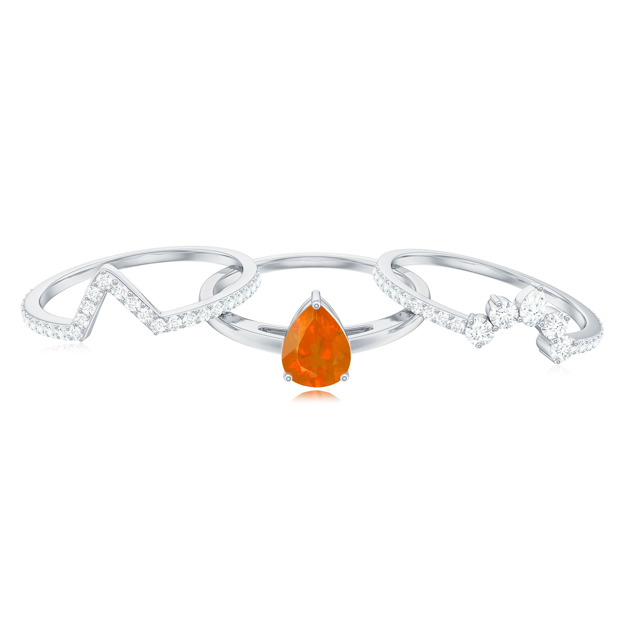 Make her big day even more memorable with this stunning Three Ring Set adorned with pear cut Fire Opal set as Solitaire in one ring with two enhancer featuring round moissanite stones. This Bridal Ring Set is a splendid choice for any woman, exuding elegance and sophistication. Surprise your lady with this exquisite moissanite ring set and let it be a cherished piece shell treasure forever, representing the beauty of your love on her big day.