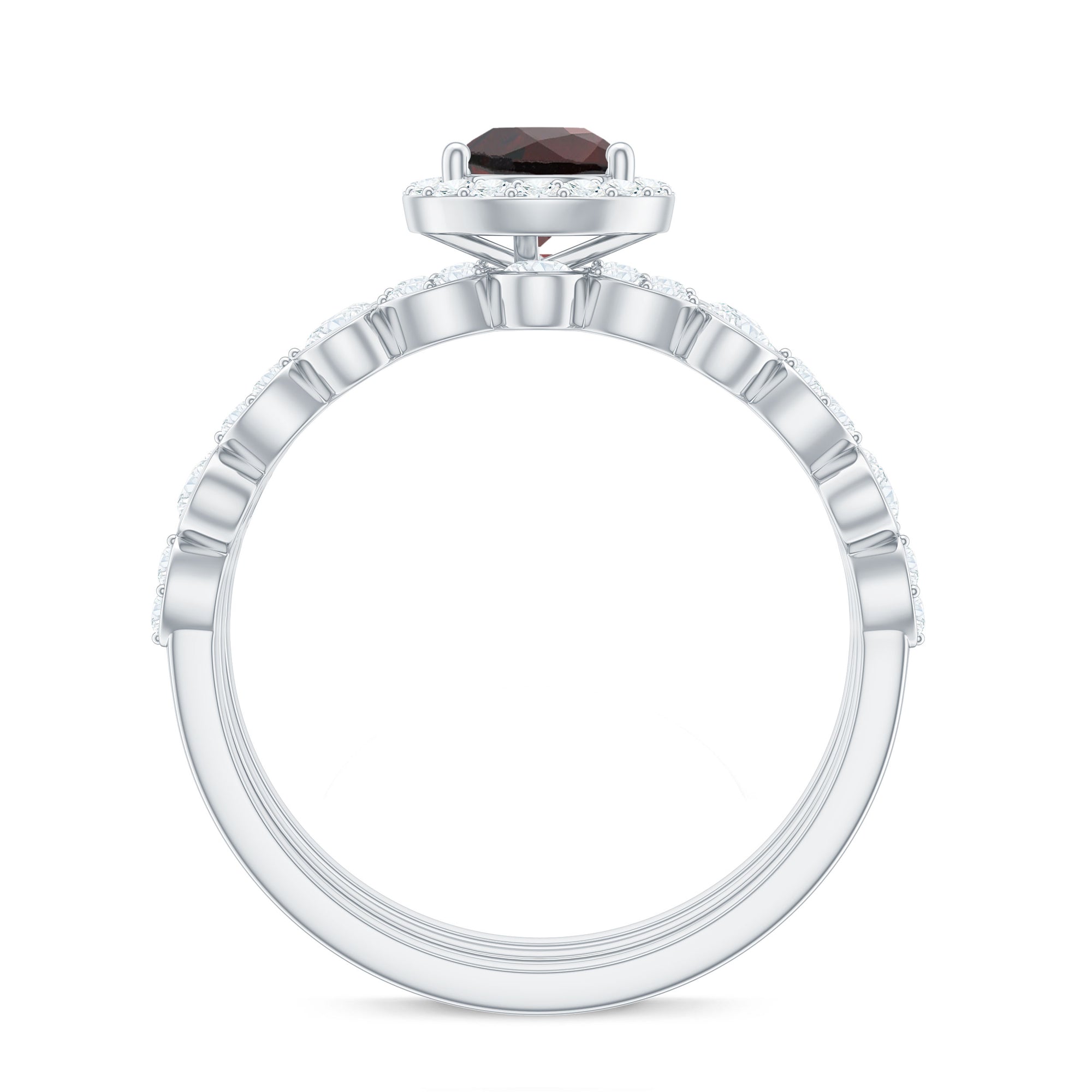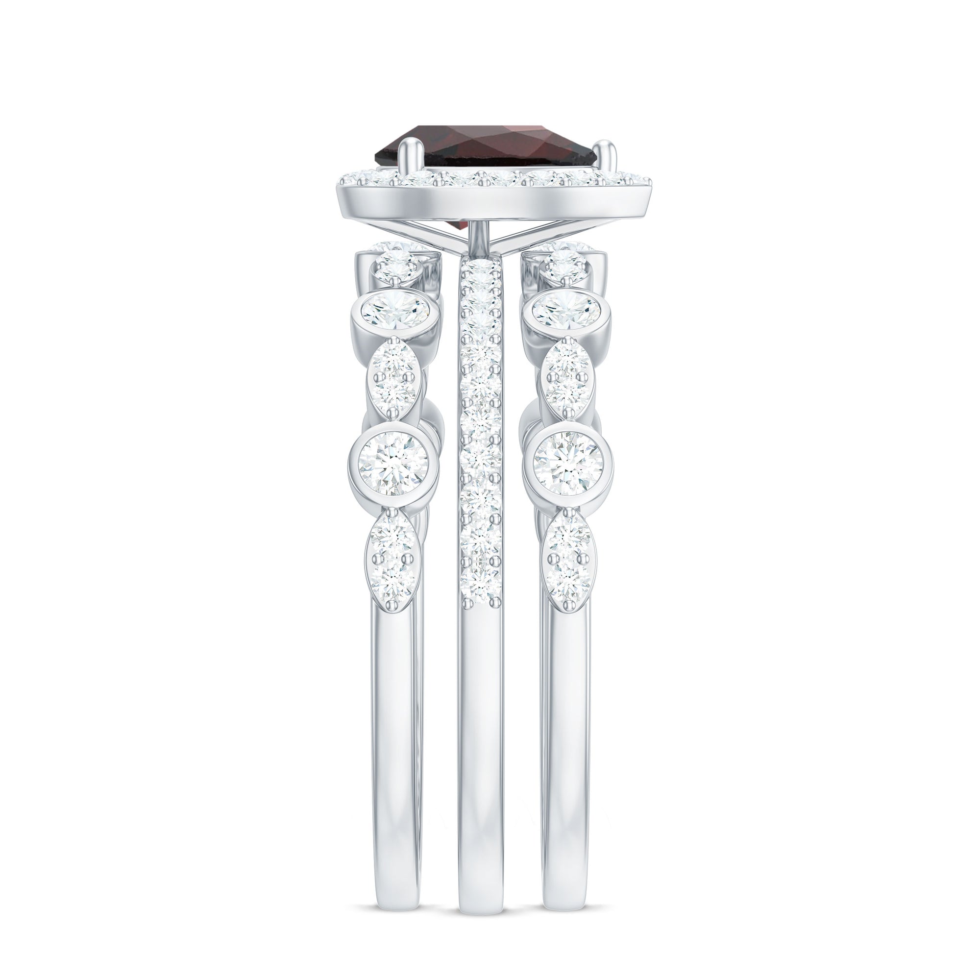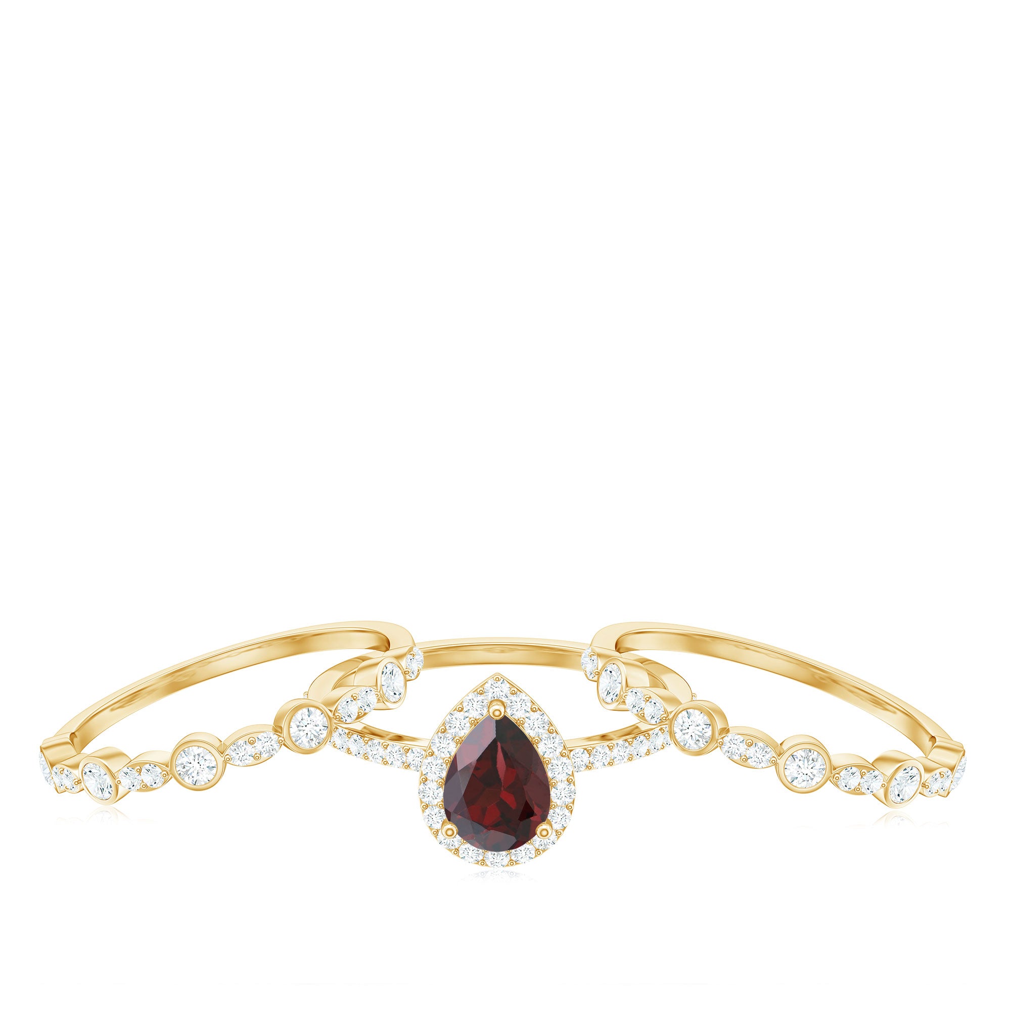 Make a stunning statement on your special day with this mesmerizing 3 Piece Wedding Ring Set, crafted to celebrate love in its most radiant form. At the center of the set shines a 5X7 mm Pear Shape Garnet set in Prong Setting, glowing with a deep red hue that symbolizes devotion and connection. Framed by a sparkling Moissanite Halo and elegant Side Stones, the Teardrop Engagement Ring captures light beautifully, creating a breathtaking shimmer with every movement. Completing the ensemble are two uniquely designed Wedding Bands, each adorned with Round Shape Moissanite stones that enhance the brilliance of AAA Quality Garnet and create a perfectly balanced, luxurious look. Together, the three rings stack gracefully, forming a romantic, eye-catching design that feels both modern and timeless. This Pear Shaped Engagement Ring Set is crafted with care, offered in a variety of sizes to ensure a seamless and comfortable fit for the one you cherish. Presented in a signature jewelry box, this Garnet Wedding Ring Set becomes a treasured reminder of promises made, dreams shared and love that endures. Elegant, meaningful and full of radiant charm, this trio is the perfect way to say forever with unmistakable beauty.