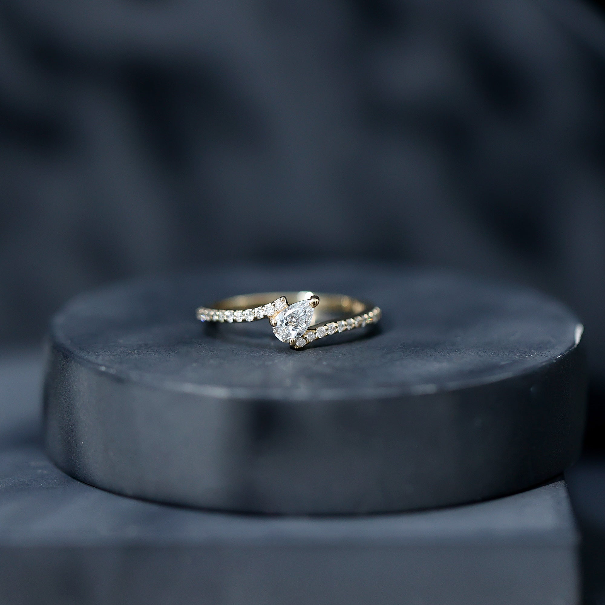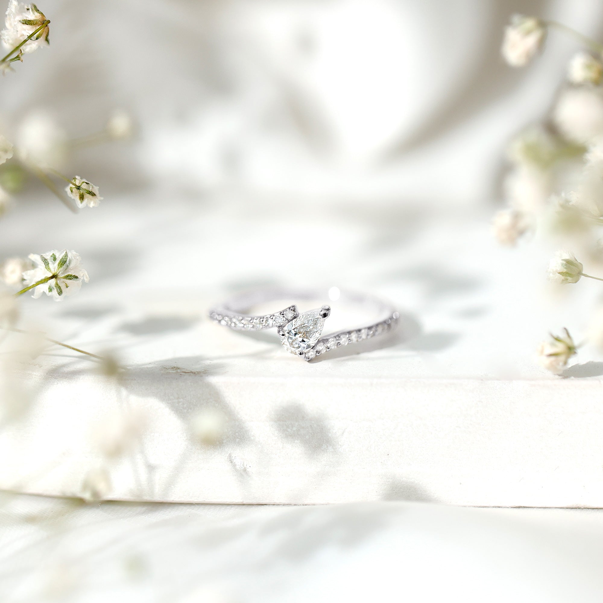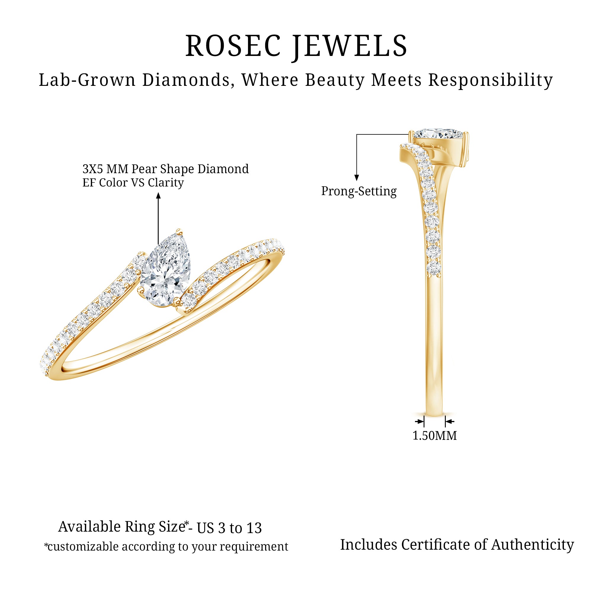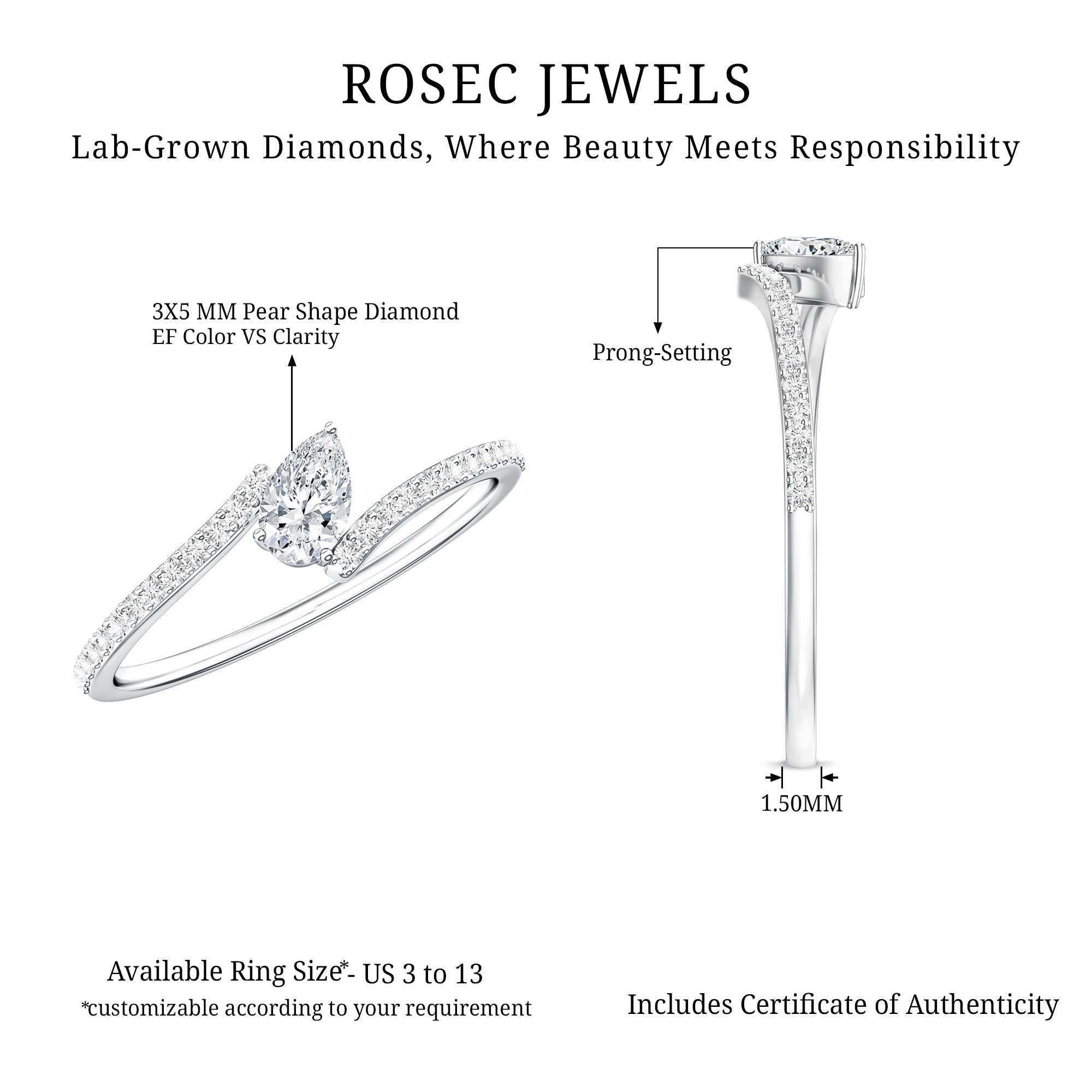 This stunning Pear Shaped Promise Ring beautifully combines classic design with a growing commitment. Show your deepening love with this Diamond Promise Ring for Her, which features a simple yet lasting design, gracefully complemented by a unique diamond-studded bypass shank that symbolizes the wonderful journey of two souls coming together. This delightful Commitment Ring showcases a 3X5 MM pear cut lab-grown diamond set in prong setting at a slightly tilted angle. Emphasizing the clarity and brilliant cut of an EF-VS Quality Lab Grown Diamond, it truly shines with stunning beauty, making it ideal for an unconventional romance. Celebrate your commitment with this Diamond Bypass Ring, whose elegant design draws attention while keeping a subtle and enchanting glow. This beautiful Lab Grown Diamond Ring will elevate any outfit, adding a touch of sophisticated shine and elegance. Additionally, it is available in various metal colors and purity options, allowing you to choose what best suits your style.