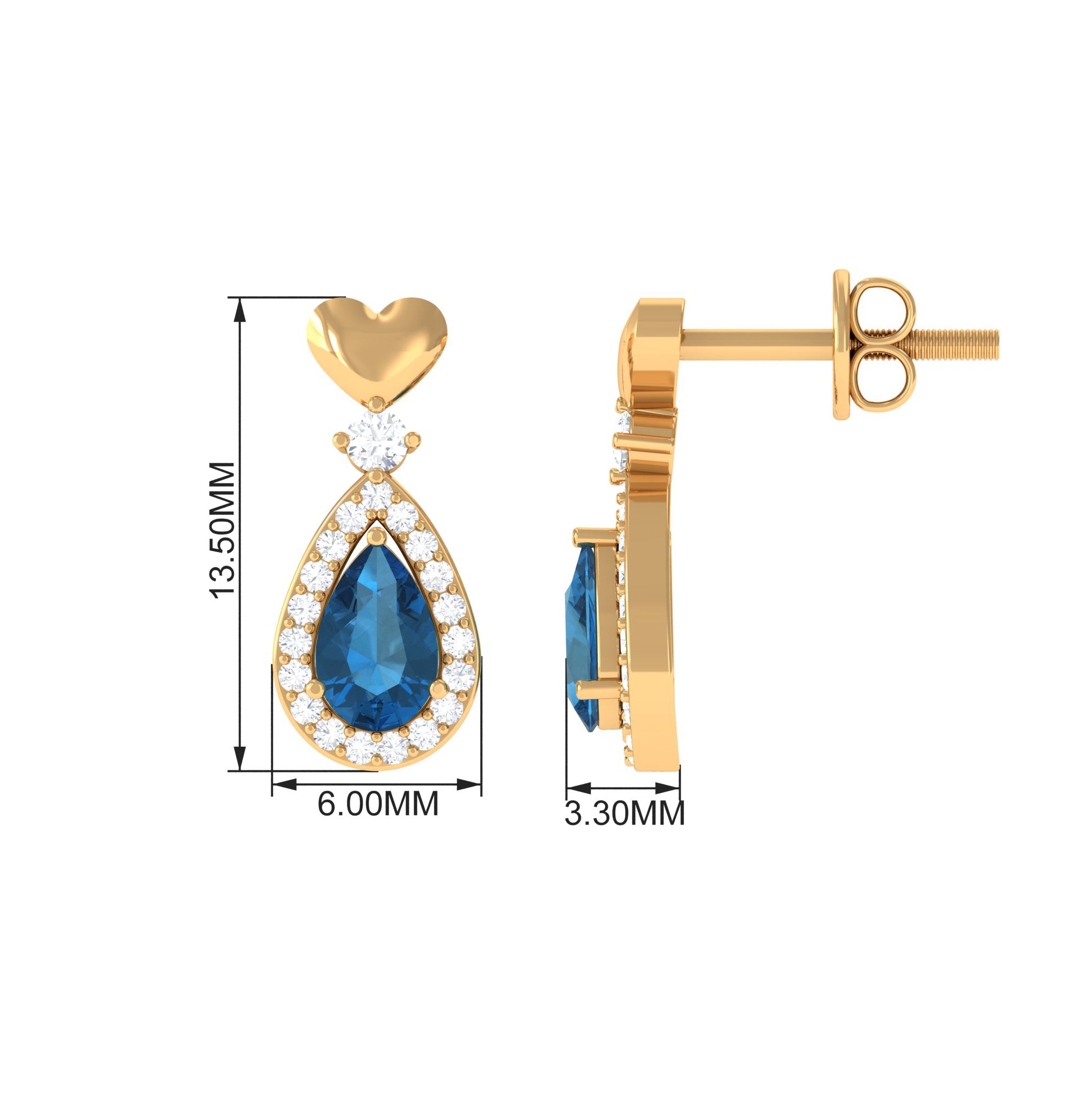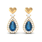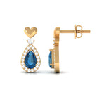 These elegantly designed drop earrings highlight a pear shape London Blue Topaz enclosed in a sparkly halo of Diamond for an unmatched aura. A round Diamond on the top accentuates the shimmering pear motif and completes its exquisite look. For a playful touch, the base of the teardrop earring pair features a shiny heart motif. The pair comes with screw back closures that make them a comfortable option.