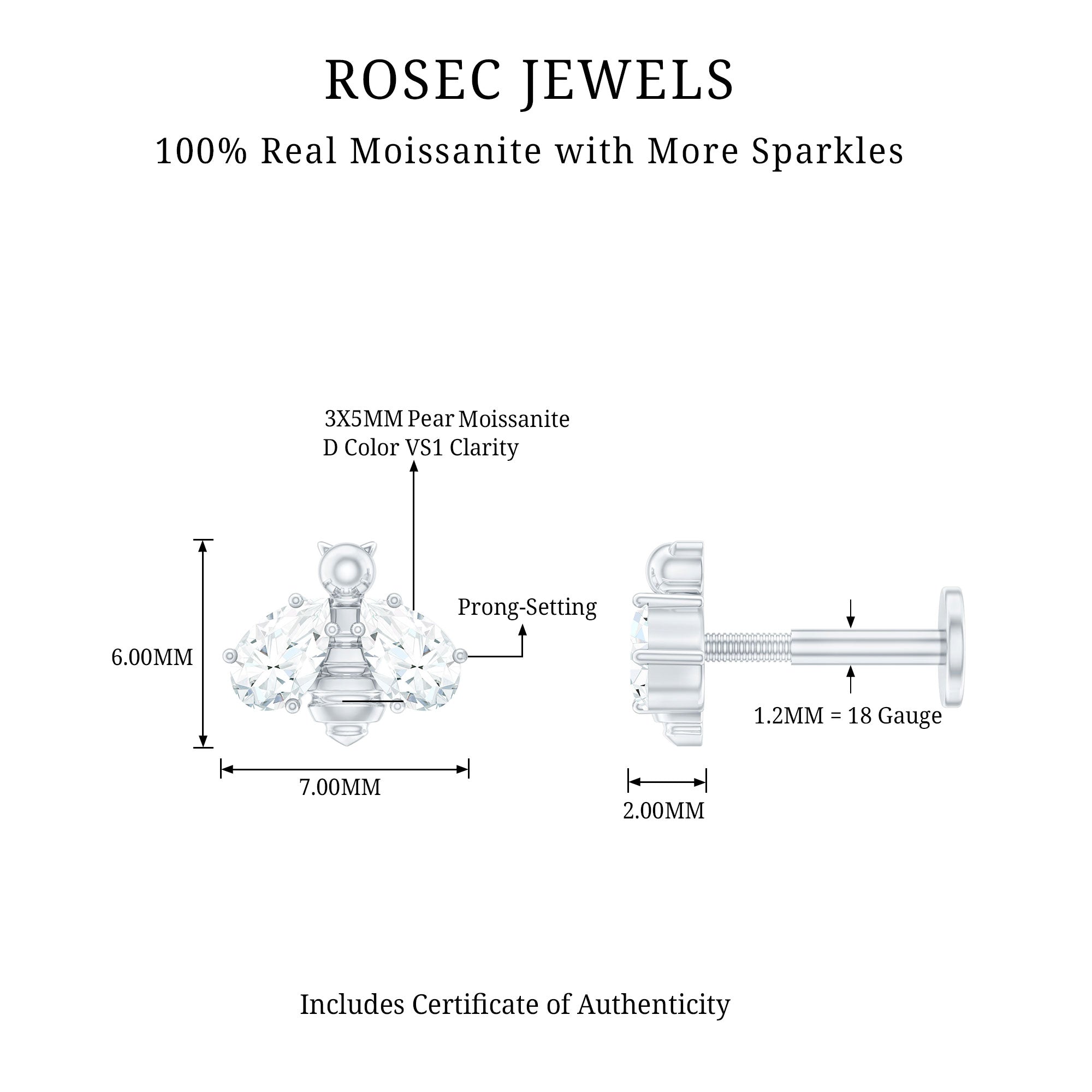 Make a lasting impression with our Moissanite Bumble Bee Earring, sure to turn heads wherever you go. Features beautiful Pear Cut Moissanite stones arranged in a bumble bee design, making it the perfect body jewelry to pair with both casual and dressy outfits. This Moissanite Earring can be worn on various piercings, including Cartilage, Helix, or Upper Lobe, and can be secured using either a Flat Back Closure for maximum comfort. Wear it solo for a simple sparkle or pair it with other studs and hoops to craft a fun ear stack. This adorable Bee Stud Earring adds a charming touch that is both playful and elegant. Whether you are getting dressed for a special event or just want to add a bit of shine to your daily look, this piece will instantly elevate your style. Plus, this Moissanite Cartilage Earring makes a thoughtful gift for your wife, girlfriend, daughter, mother, or friend who loves cute and meaningful jewelry. It comes in a lovely box, perfect for gifting or keeping safe.