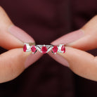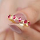 This half eternity band showcases pear-cut ruby securely nestled in a prong setting, accompanied by dainty round Diamond stones stubbed on the metal bar. A lavish jewelry piece for special occasions, this Ruby Eternity Band Ring offers extensive customization options to suit your preferences.