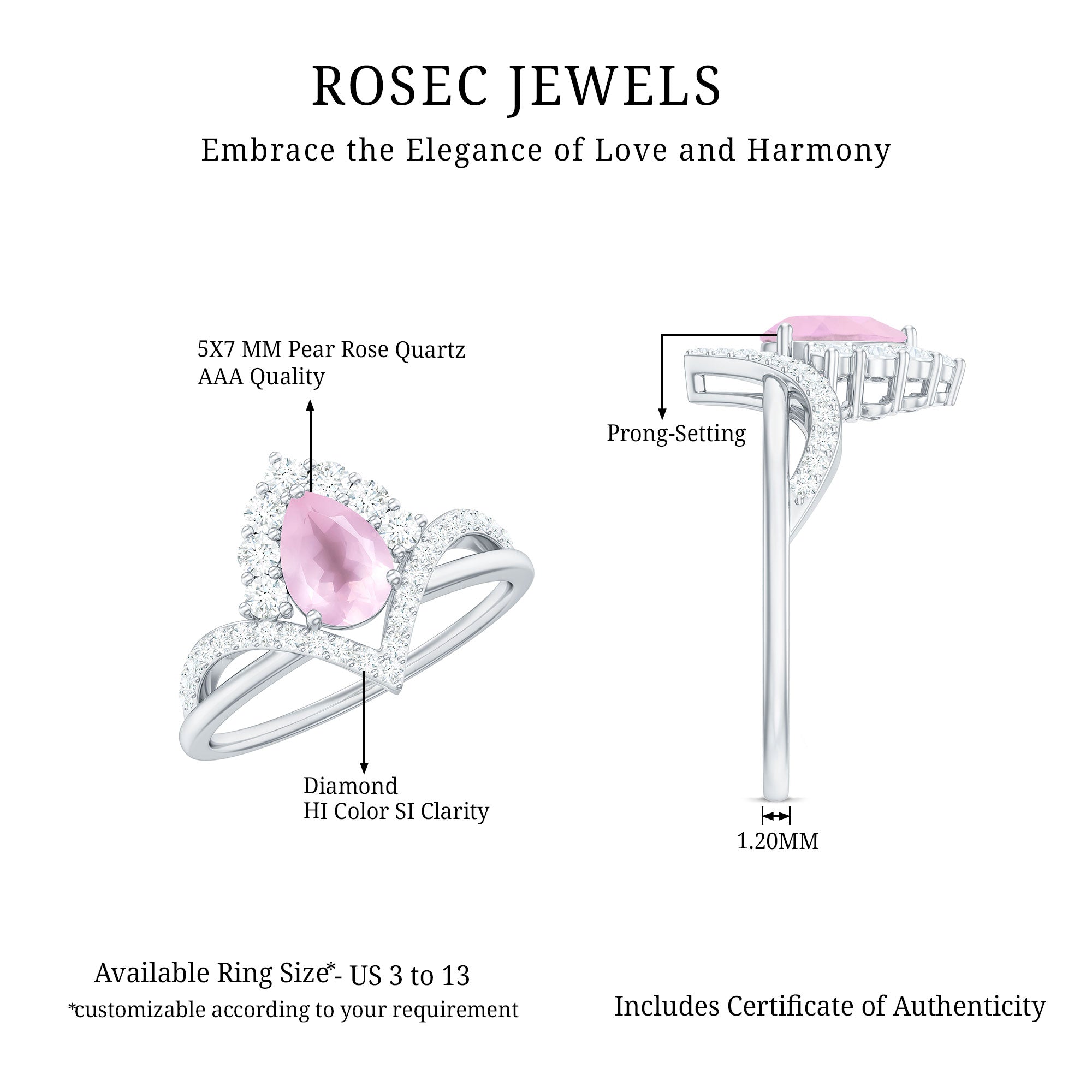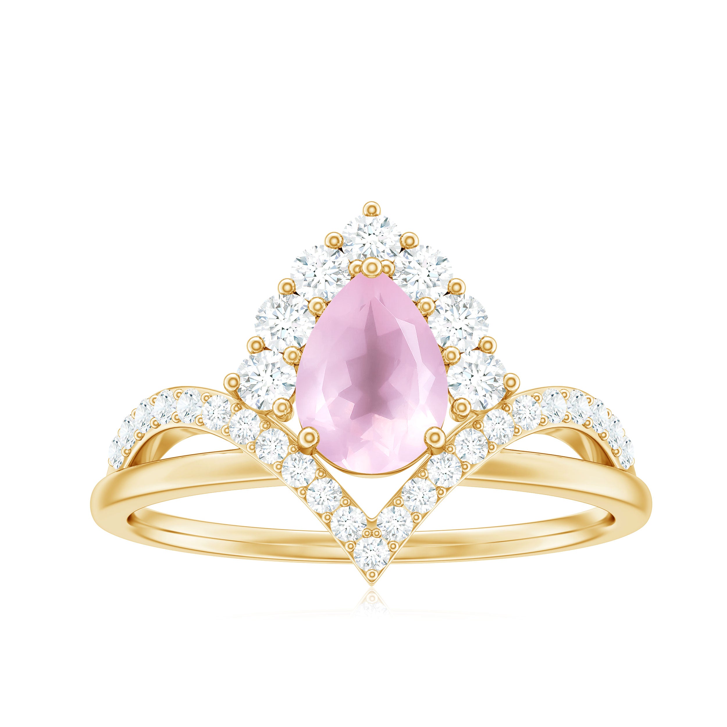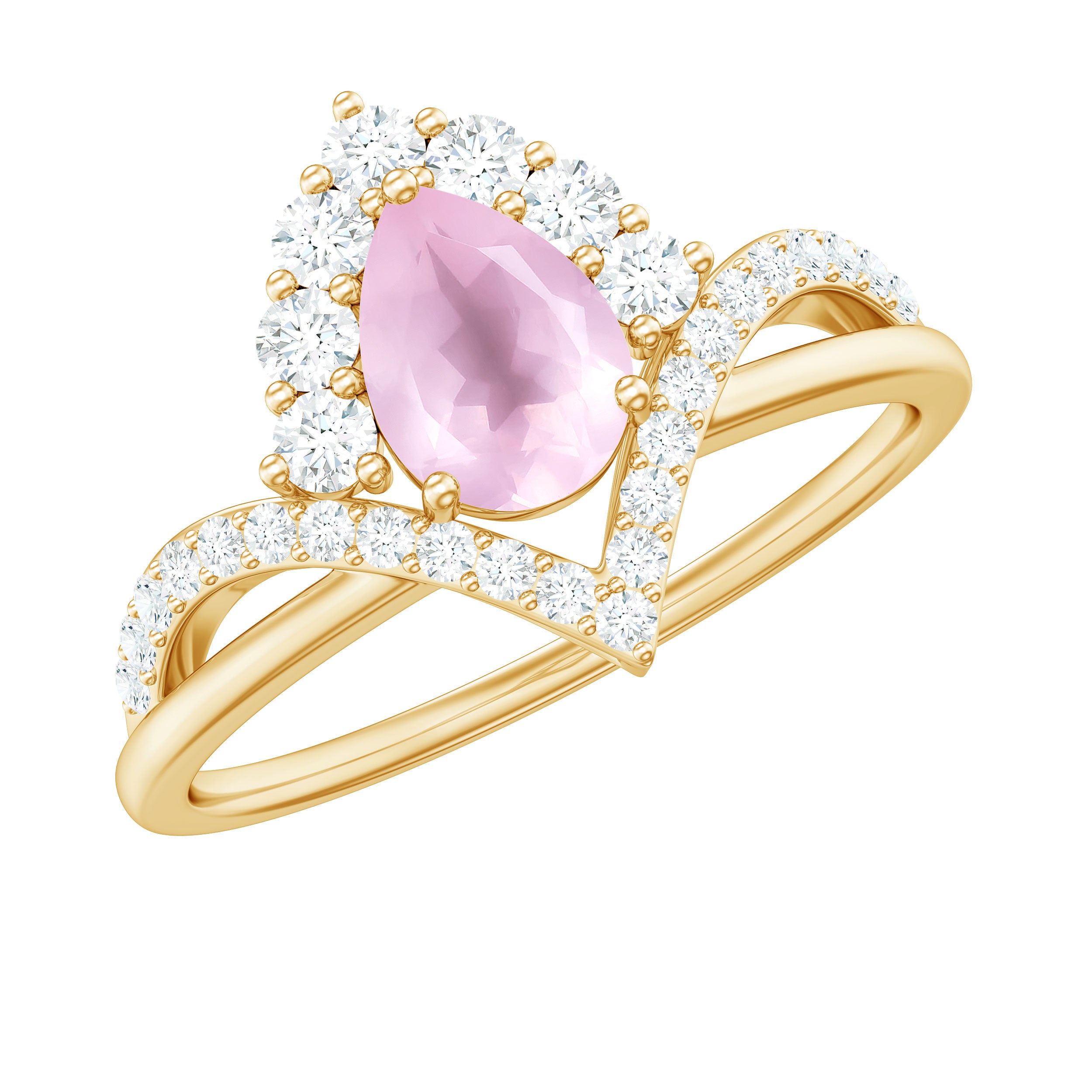 Grab this Designer Engagement Ring for your beloved one. Showcasing a Pear Shaped Rose Quartz secured by 3 Prong Setting, more Round Diamond studded on the unique shank. Adorn yourself with this Rose Quartz Ring or get it for loved ones as a birthday gift, anniversary gift, graduation gift, christmas gift and make them feel special.