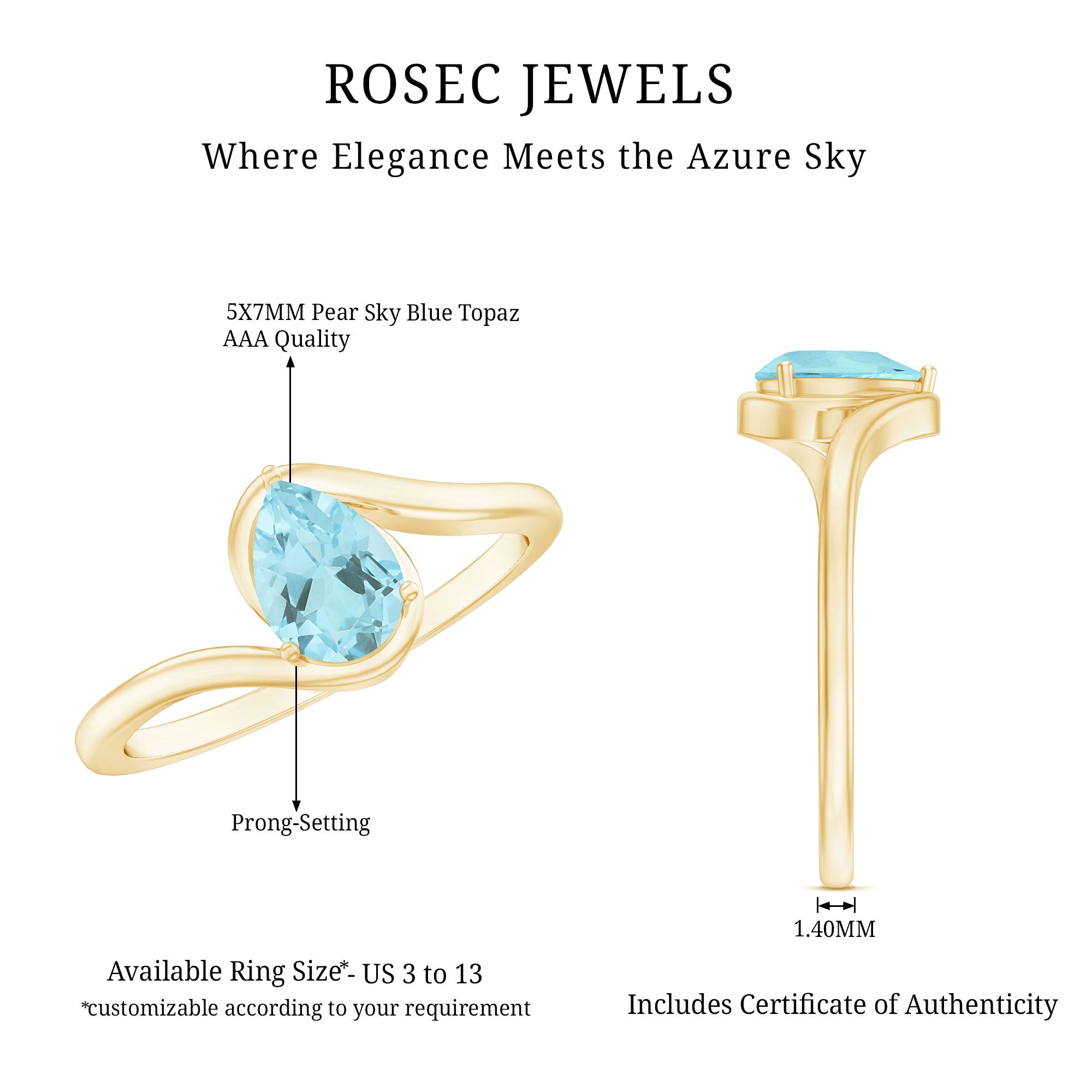 Radiating with brilliance and sparkle, this Solitaire Ring showcases a captivating Pear Cut Sky Blue Topaz in a secure Prong Setting, beautifully complemented by a graceful Bypass Shank design. This stunning ring is a true symbol of elegance and sophistication. With its mesmerizing beauty and timeless appeal, it makes for a beautiful addition to any jewelry collection. Whether as a gift for a loved one or a cherished piece to adorn your own finger, this Beautiful Ring is sure to capture hearts and leave a lasting impression.