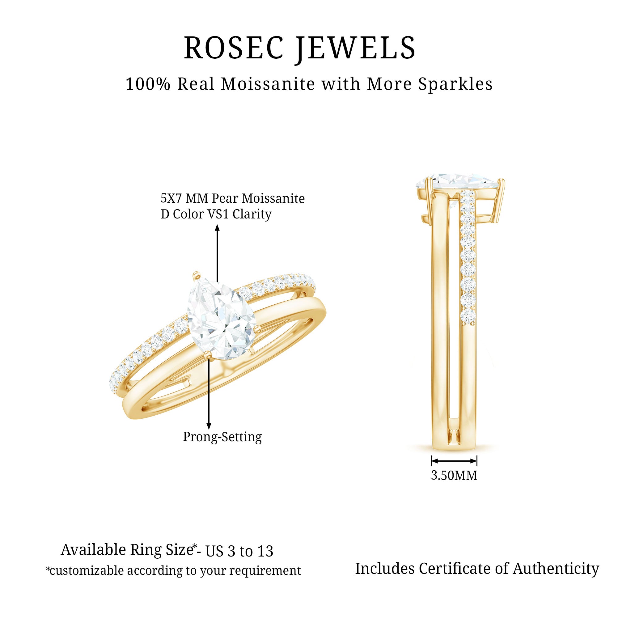 Stylish and graceful, this Pear Shaped Engagement Ring beautifully symbolizes love and commitment. At its core is a stunning 5X7 MM pear cut moissanite, securely held in prongs. To boost its charm, the double band is adorned with sparkling round moissanite stones that perfectly complement the center gem. This Double Band Engagement Ring features a sophisticated design, adding depth, flair, and a modern twist to a timeless look. This unique detail represents two hearts and two lives coming together as one, a meaningful and heartfelt symbol of your future together. The brilliance of the side stones enhances the center gem, making the entire Moissanite Engagement Ring shine with elegance and beauty. Each element is carefully handcrafted, highlighting the best in every stone and giving the ring a luxurious, polished finish. Perfect for proposals, anniversaries, or any special event, this Teardrop Ring goes beyond just jewelry, it is a timeless expression of love, promise, and devotion. Whether worn daily or on special occasions, it is a piece that will always catch the eye.