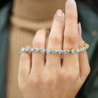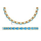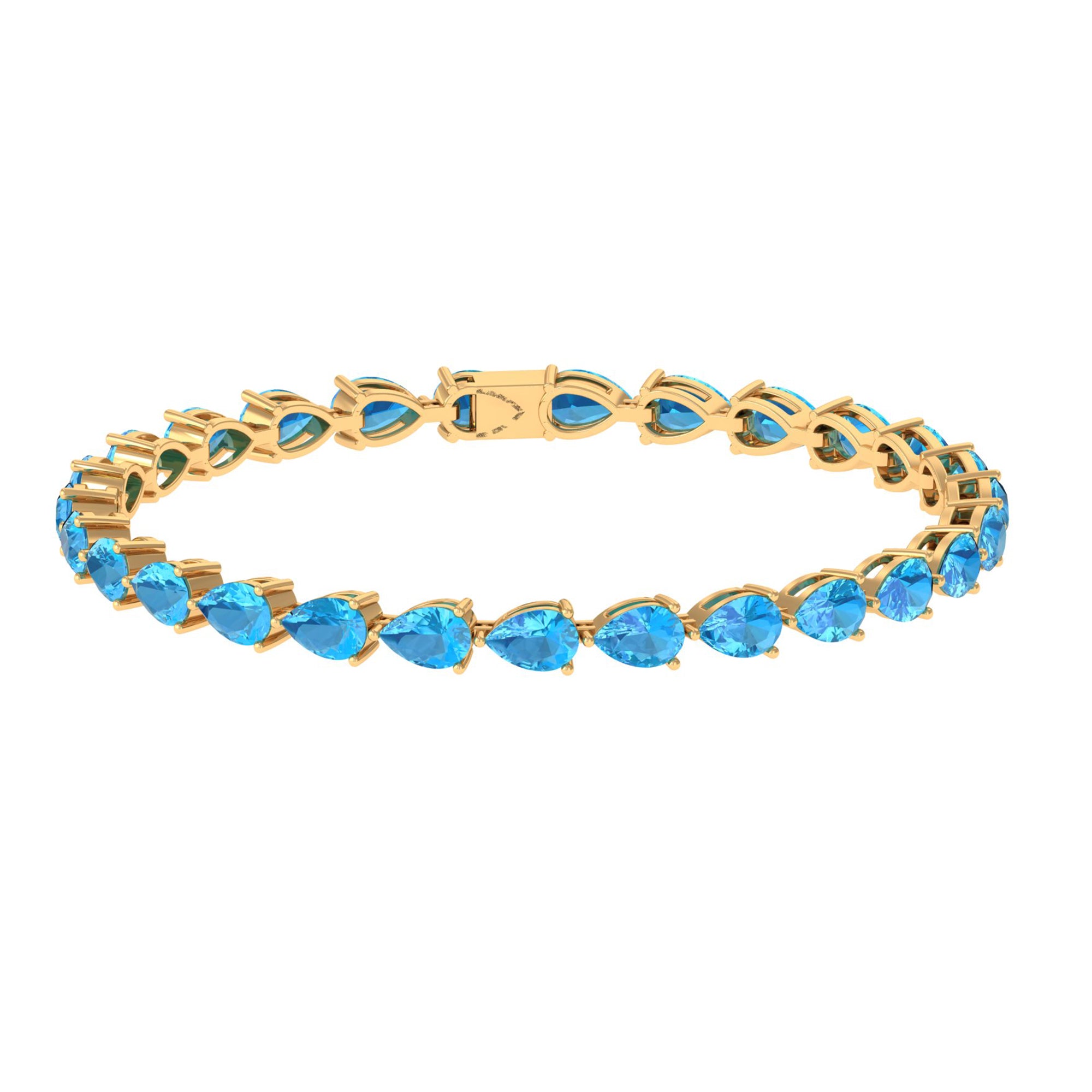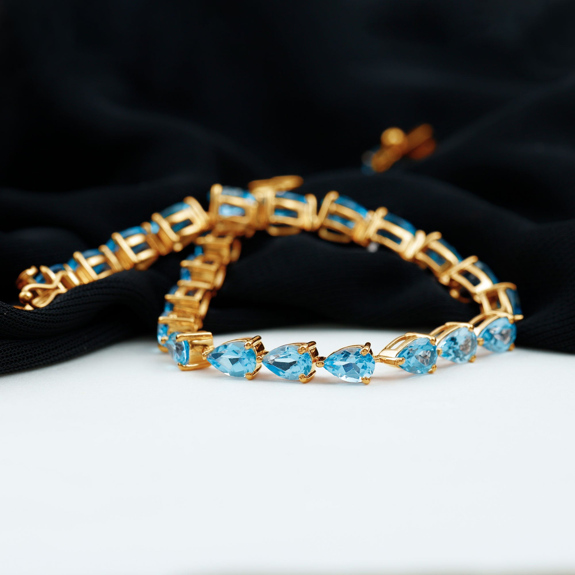 Classiness takes center stage with our East-West Tennis Bracelet featuring horizontal Pear Cut Swiss Blue Topaz gems secured in a sleek prong setting. The vivid Swiss Blue Topaz stones add a pop of color and charm, making this piece a versatile accessory suitable for any occasion.