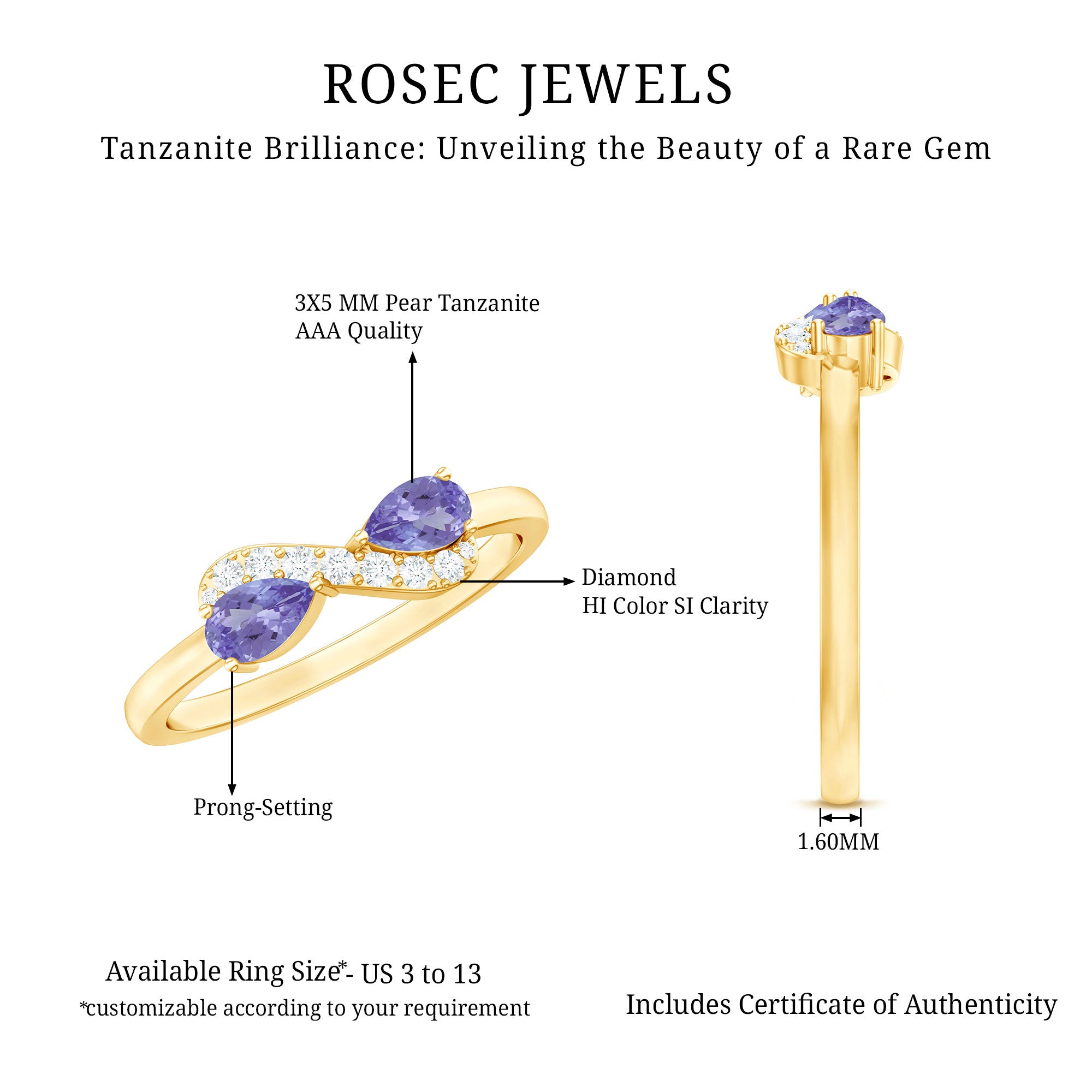 Your bond is symbolized in the Tanzanite and Diamond Infinity design of this precious finger ring. The elegant and classic design make it the perfect token of love. Adorned with Pear Cut Tanzanite in Prong Setting.