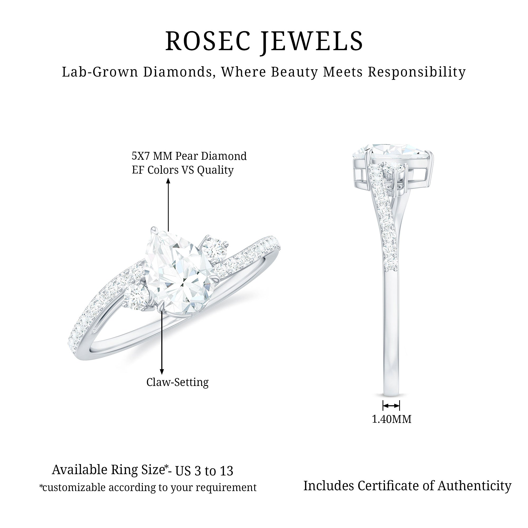 Bold and fashionable with a contemporary touch, this Teardrop Diamond Engagement Ring boldly expresses love and individuality. It showcases a breathtaking 5X7 MM Pear Shape Lab Grown Diamond set in Prong Setting, enabling the Solitaire Engagement Ring to reflect light from every angle, producing a sparkle that is just like your smile. Made with EF color VS clarity lab created diamonds, each facet radiates brilliance, clarity, and commitment in the most environmentally friendly way. The bypass shank, embellished with delicate stones, gives this Teardrop Ring its modern flair, symbolizing two lives coming together and choosing to journey as one. This Pear Cut Engagement Ring is more than just a piece of jewelry, it celebrates chemistry and connection. Thoughtfully packaged in a signature jewelry box and available in various sizes, this Bypass Engagement Ring is crafted to perfectly align with your love story. It is a ring that draws attention, sparks conversations, and makes unforgettable proposals even more magical.