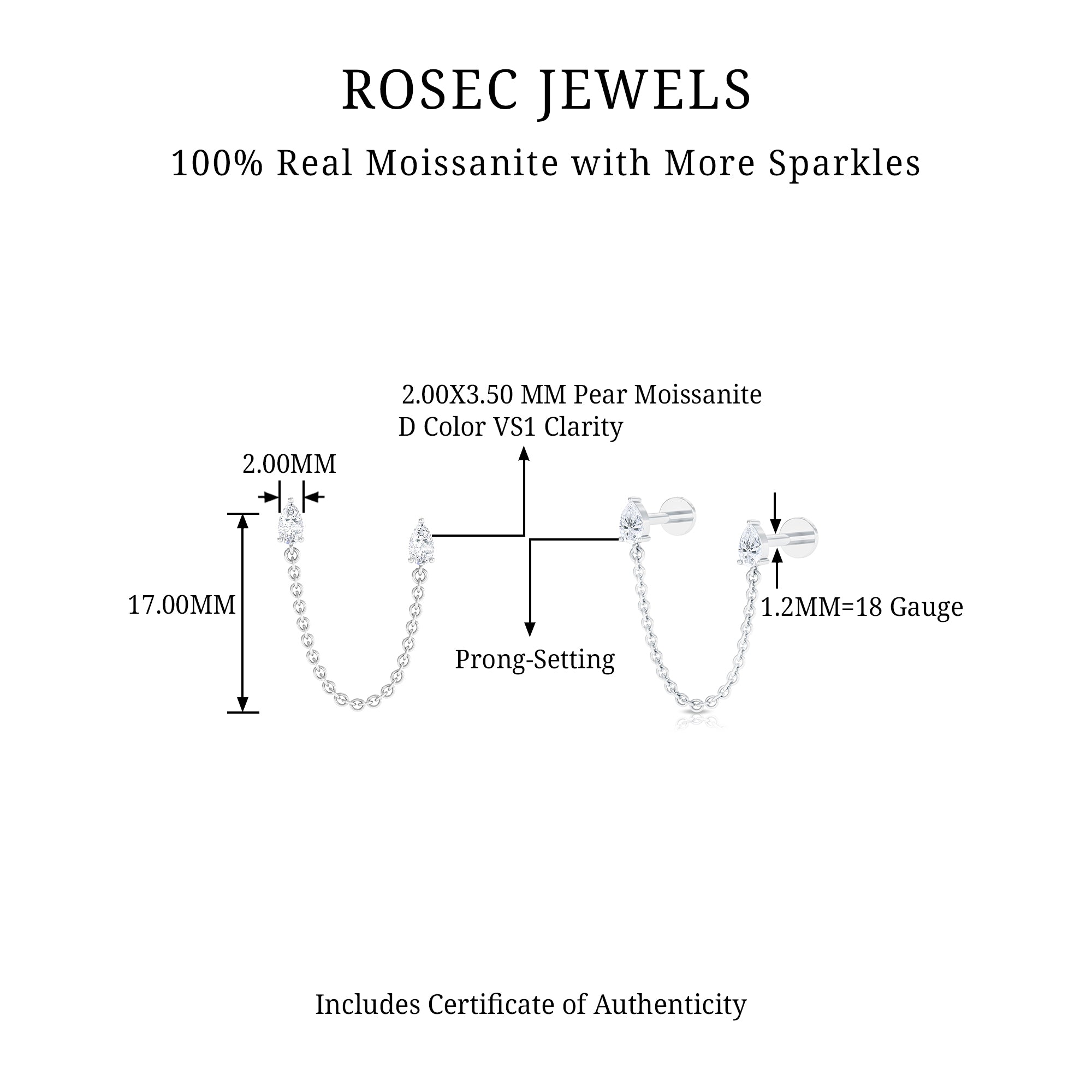 The simple Moissanite Dangle Chain Earring will instantly add glamour to any attire like nothing else. Featuring Pear Shaped Moissanite secured in Prong Setting while a dangling chain adds a touch of movement and elegance. Complete your look with this elegant Piercing Earring by wearing it in your Cartilage, Lobe, or Helix.