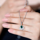Elevate your neckline with this Lab Grown Emerald Pendant Necklace, crafted with care using 14k white gold plated silver. The pendant features a 5X7 MM pear-shaped lab-created emerald at its heart, securely set in prong setting. Surrounding the center stone are delicate round cut moissanite stones that add just the right amount of sparkle to enhance your outfits charm without overshadowing the main gem, also creating a classic contrast look anyone will love to show off. This Designer Emerald Necklace shines with the timeless beauty of AAAA quality lab emerald and D color VS1 clarity Moissanites. It hangs from a sturdy yet simple cable chain, allowing it to sit elegantly on your neckline and complete your look. This Statement Pendant and Chain will come in a velvet pouch for safe, dust-free storage, along with a certificate of authenticity.