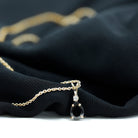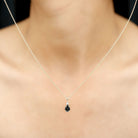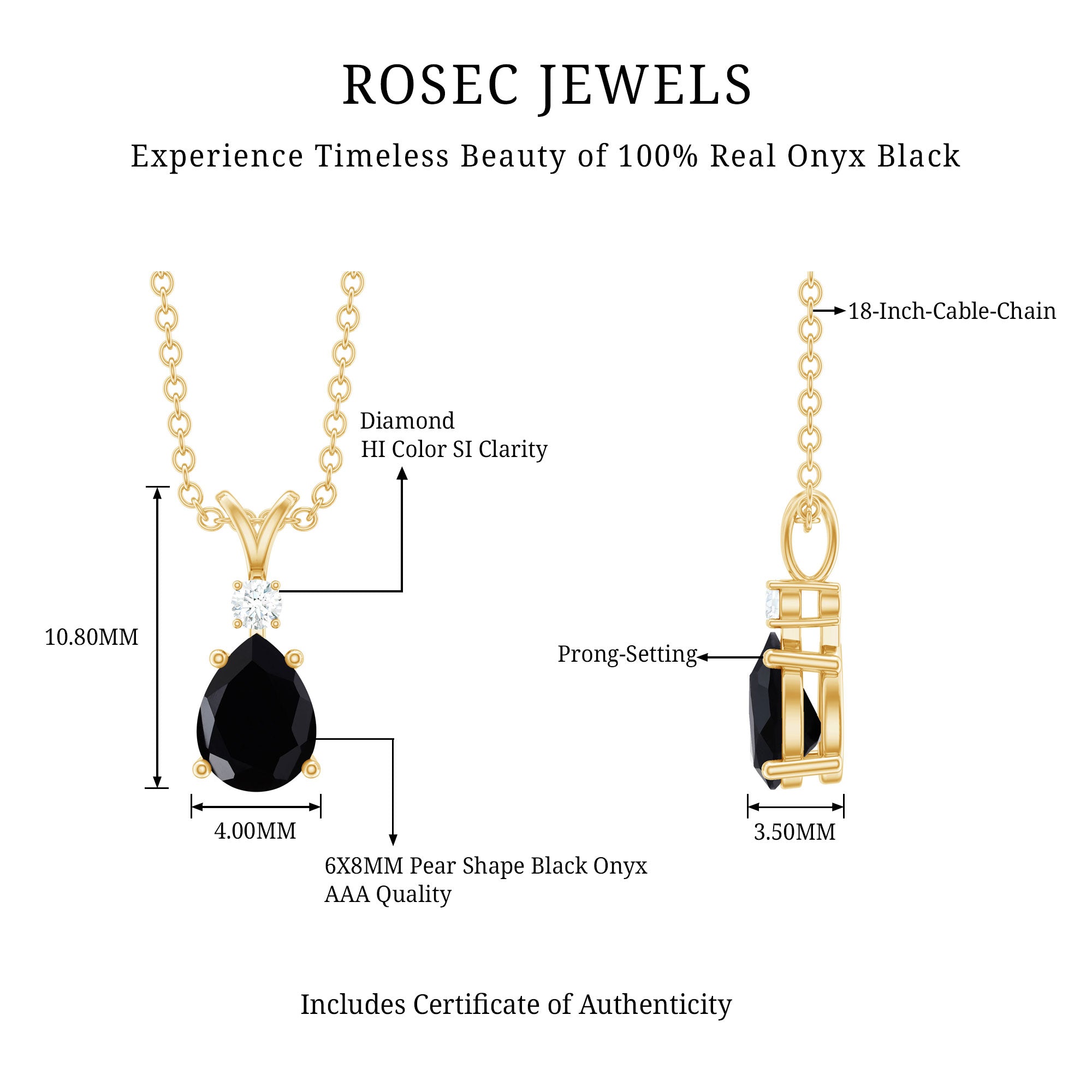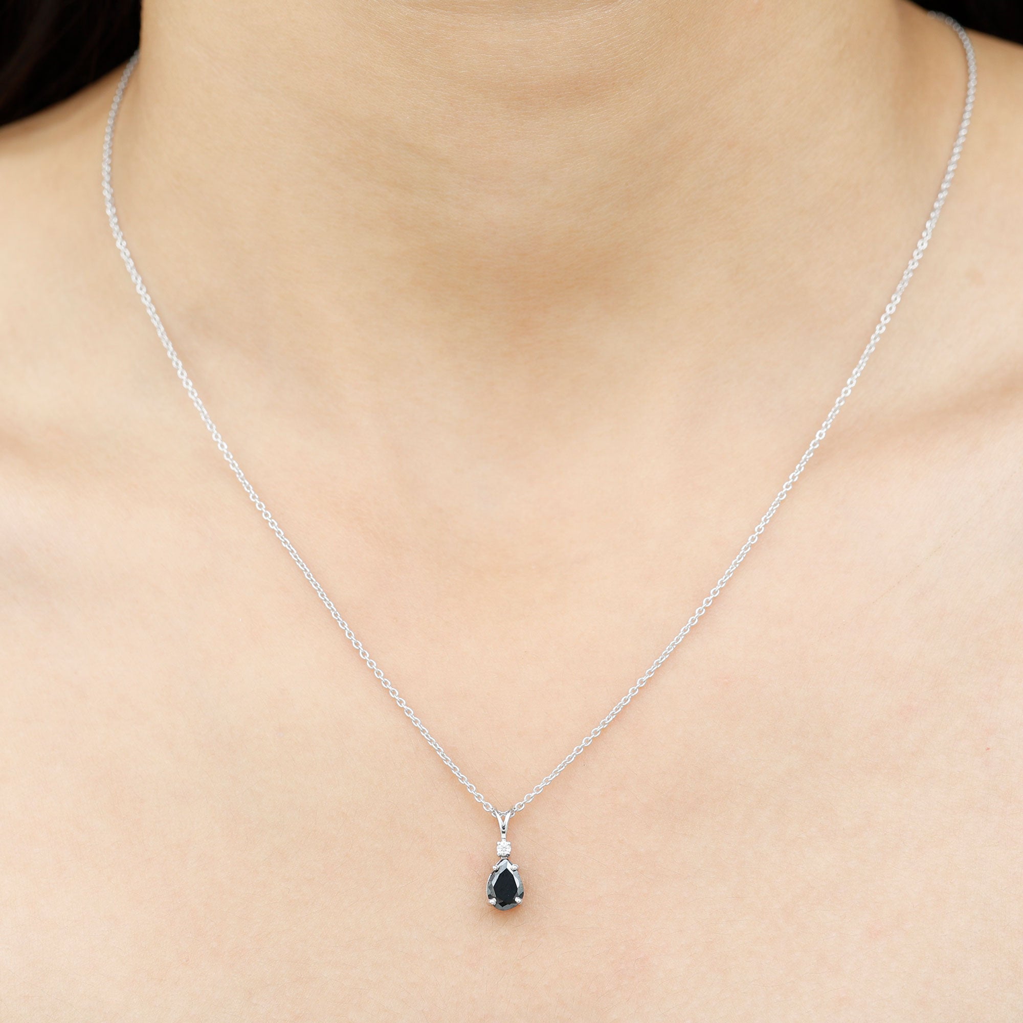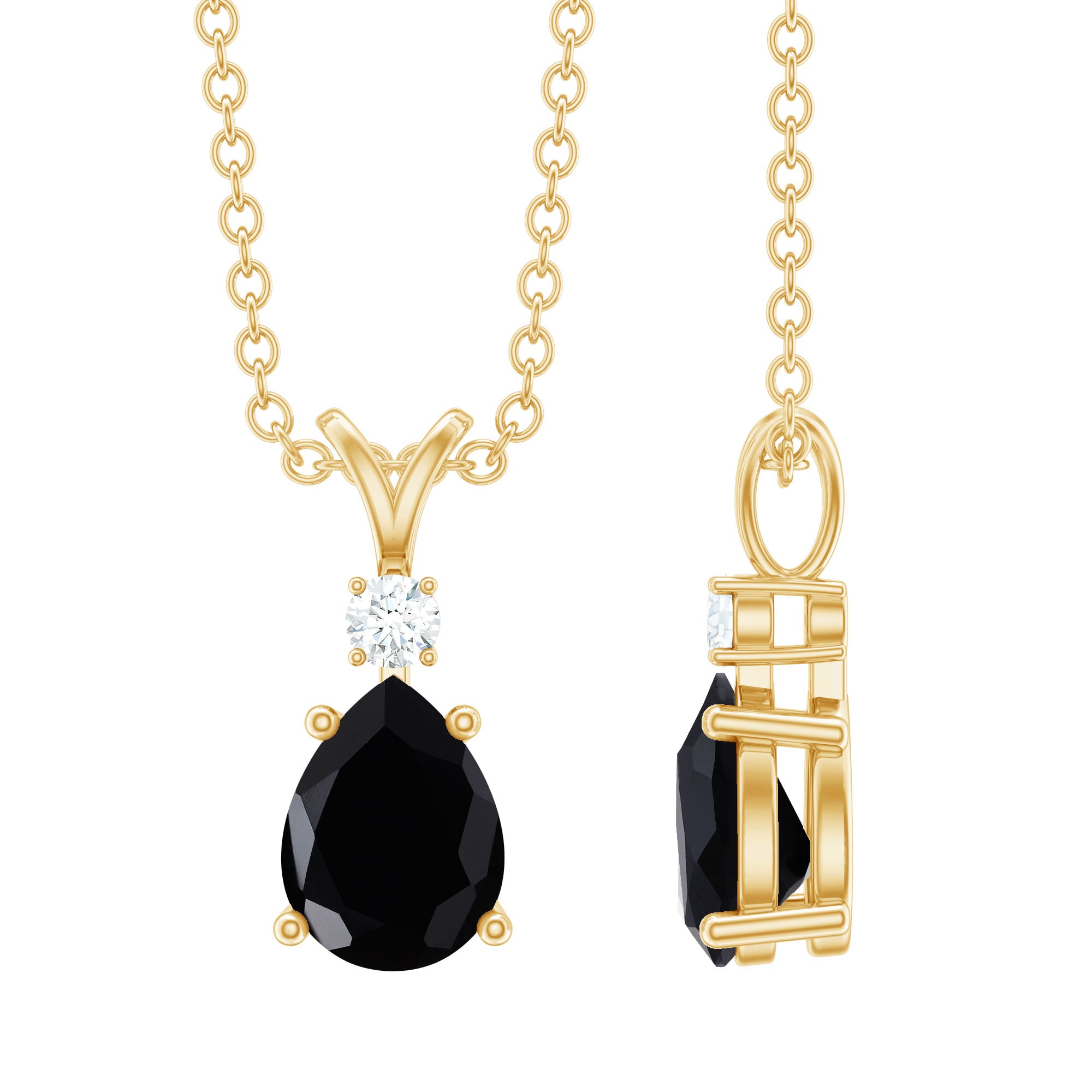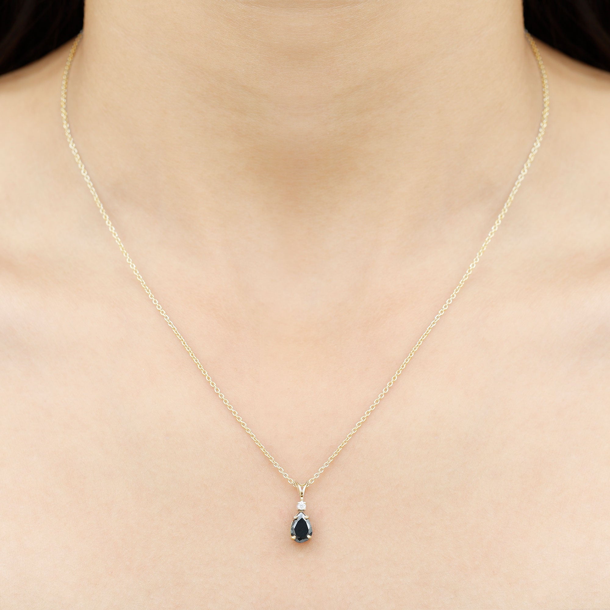 Discover timeless elegance in this solitaire pendant showcasing a pear-shaped black onyx, delicately held in a 4 prong setting. Enhancing its allure, brilliant round Diamond graces the apex of the onyx. The designs simplicity holds immense appeal, offering a touch of sophistication. This onyx pendant is customizable with an array of metal choices, and its refinement is accentuated by a lustrous rabbit ear bail, adding a final touch of finesse.