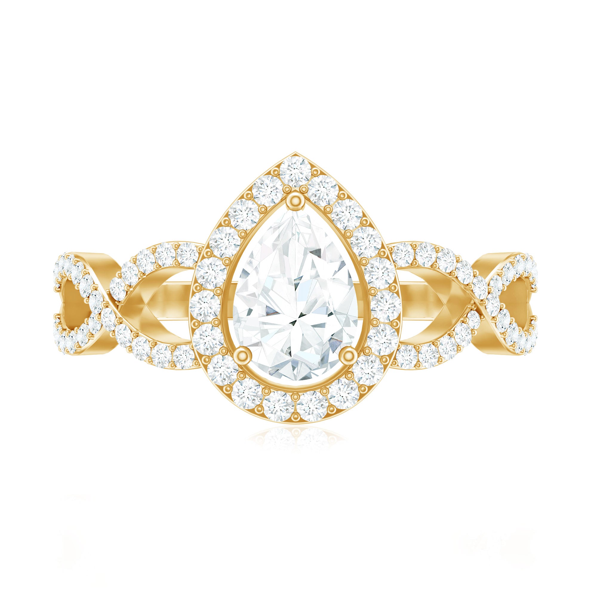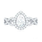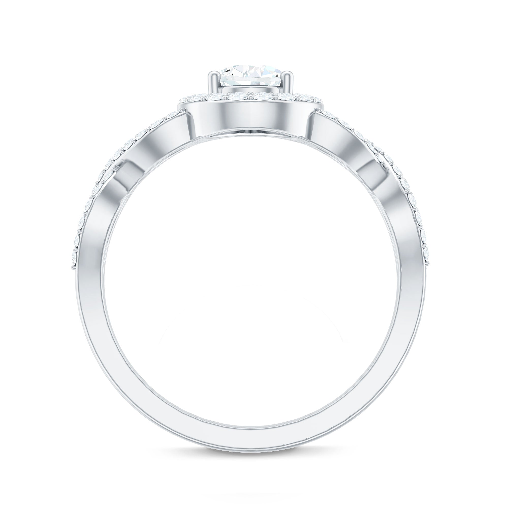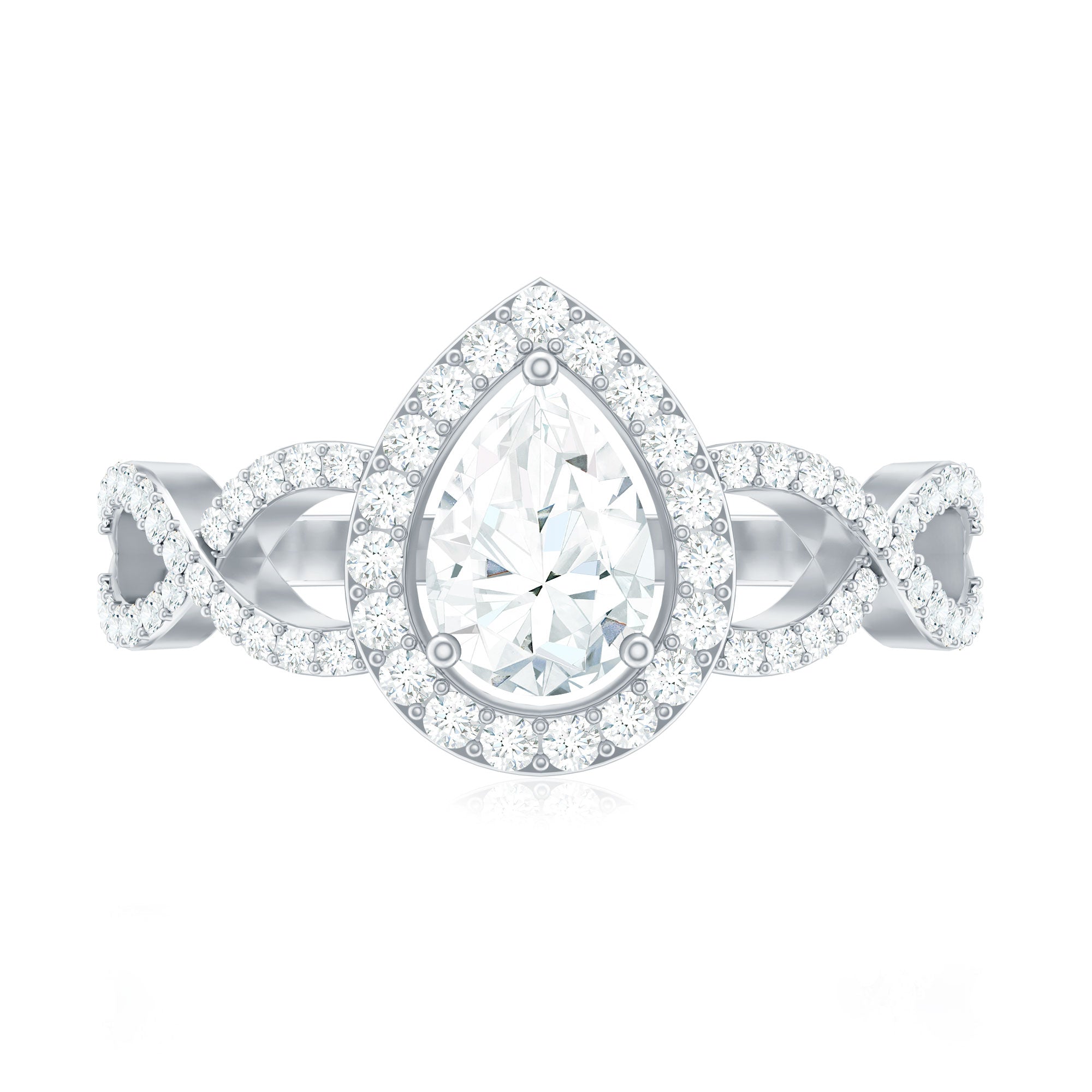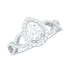 This exquisite Engagement Ring features a 5X7 MM Pear Shape Lab Grown Diamond encircled by sparkling Halo. Set in a graceful teardrop design over the Crossover Shank, the Simulated Diamond sparkles with timeless elegance. With its captivating beauty, this ring is a symbol of your commitment to your partner. Celebrate your love story with this unique engagement ring.