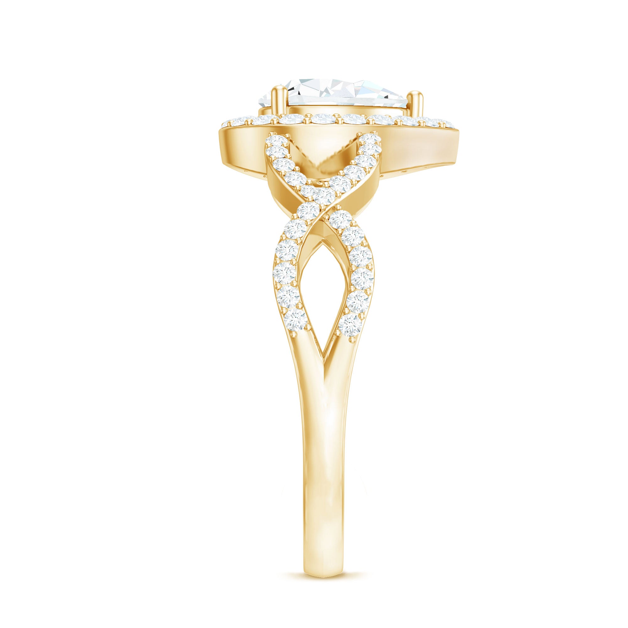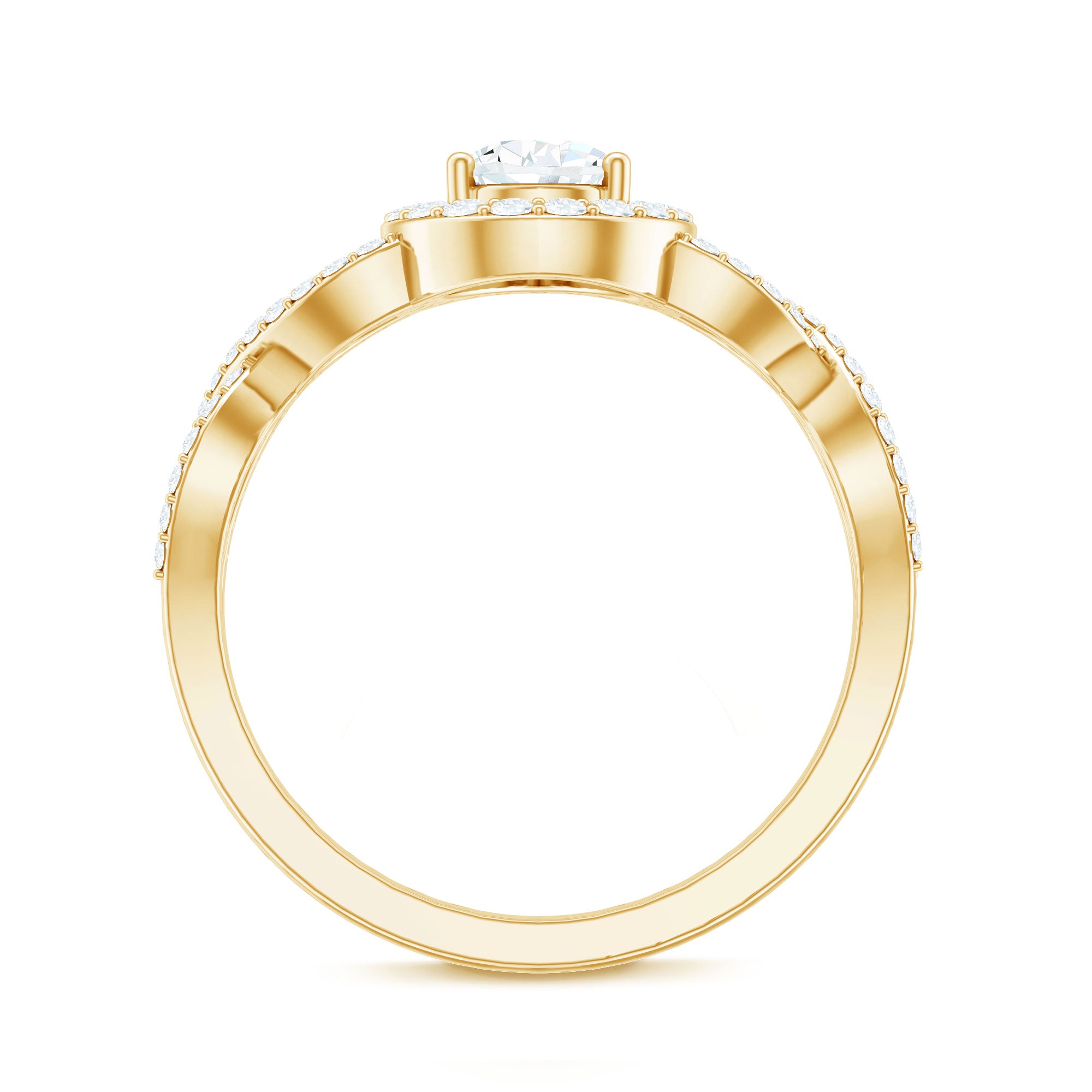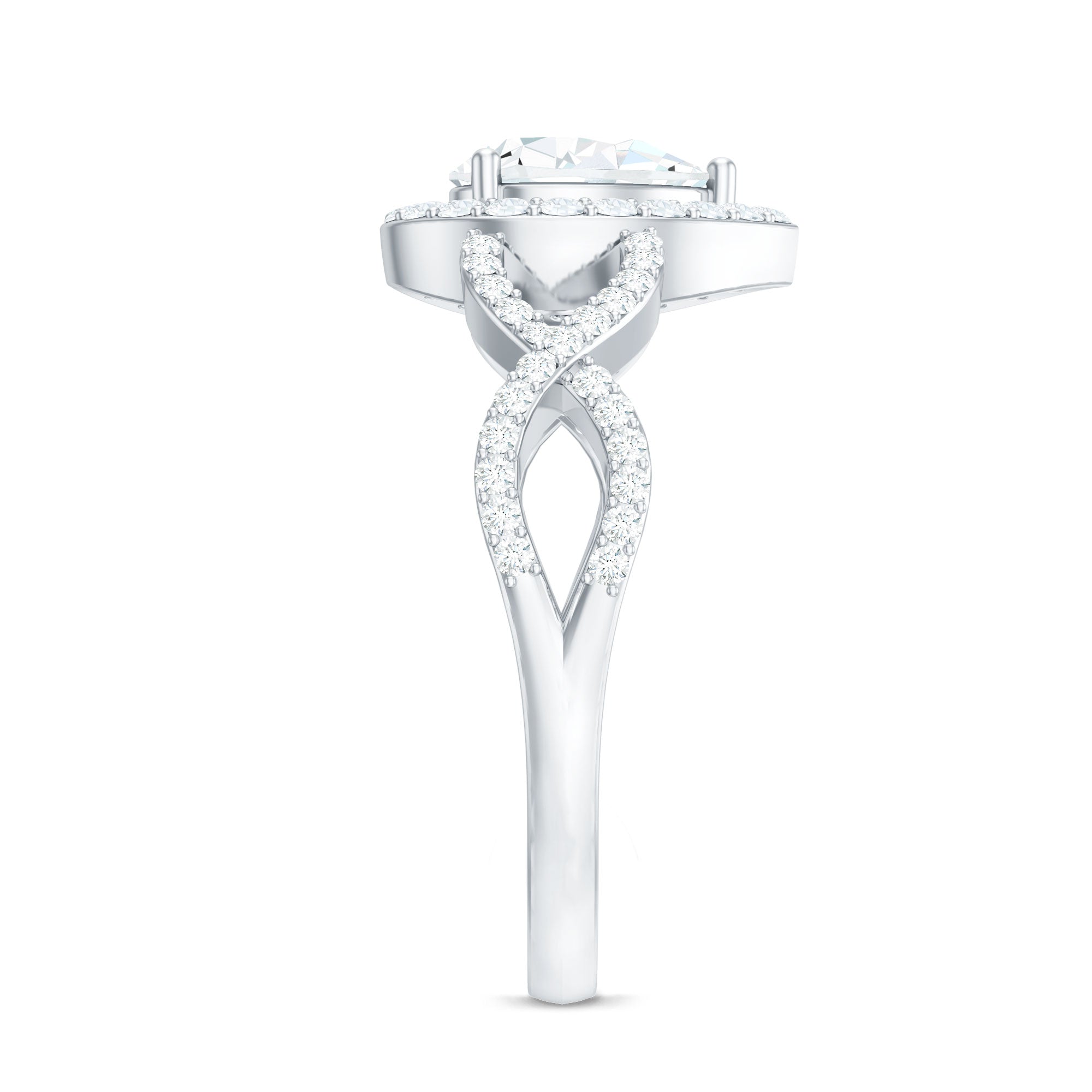 This exquisite Engagement Ring features a 5X7 MM Pear Shape Lab Grown Diamond encircled by sparkling Halo. Set in a graceful teardrop design over the Crossover Shank, the Simulated Diamond sparkles with timeless elegance. With its captivating beauty, this ring is a symbol of your commitment to your partner. Celebrate your love story with this unique engagement ring.