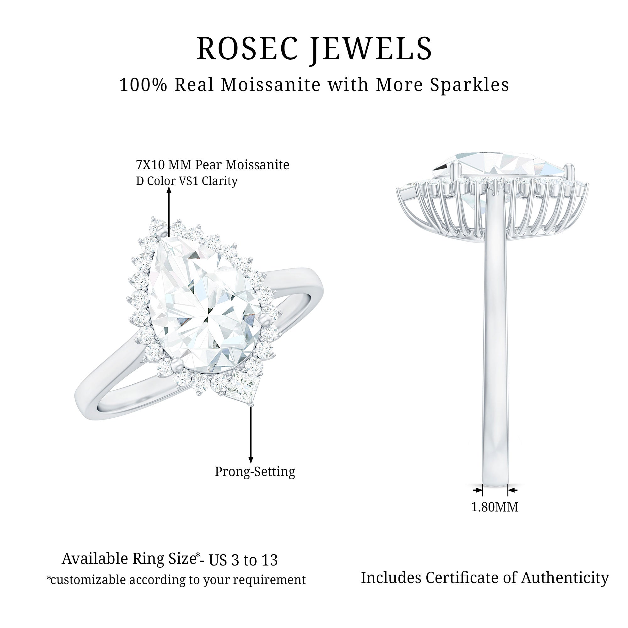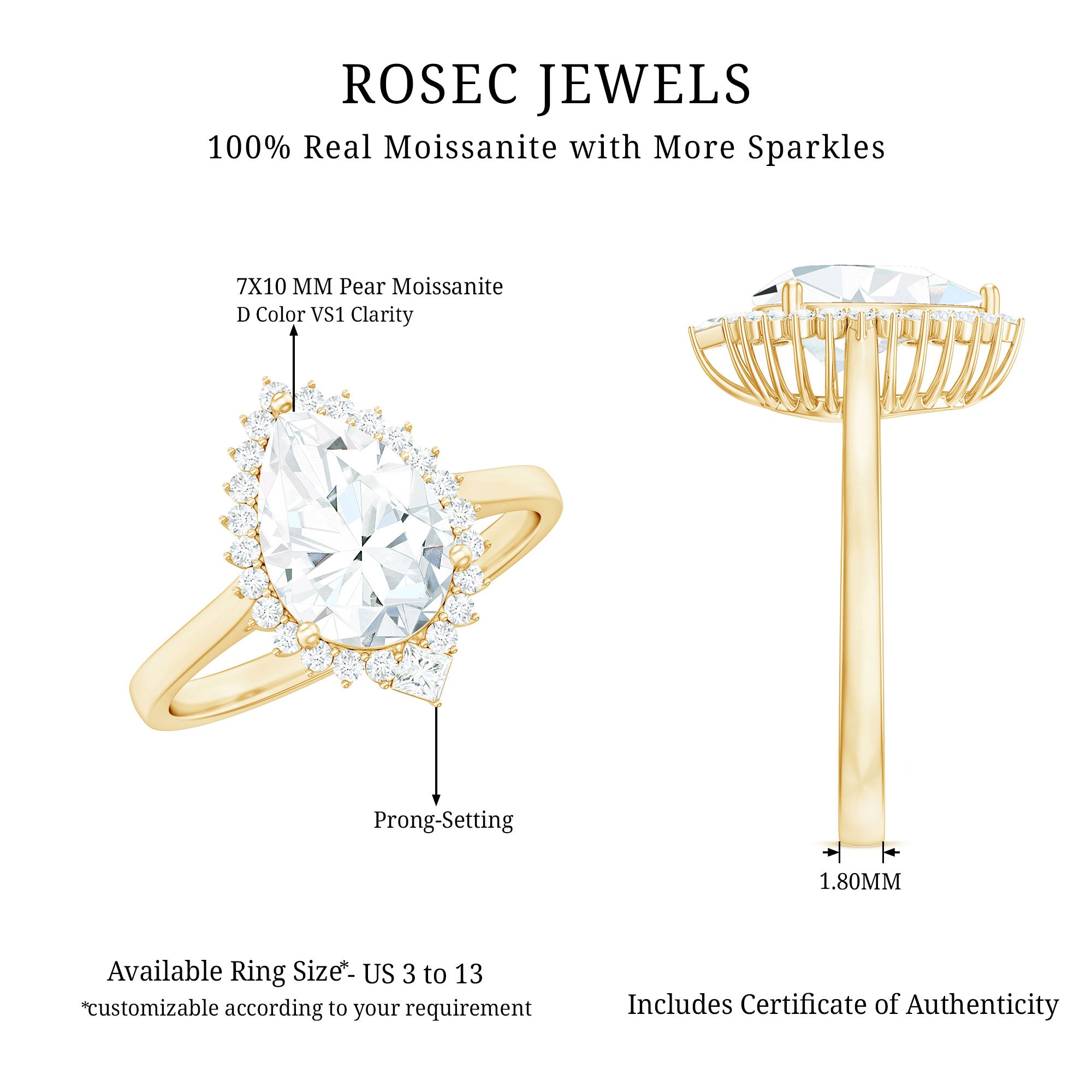 A sparkling powerhouse, this Huge Moissanite Engagement Ring lights up the room with its fiery brilliance and striking size. Carefully handcrafted, it showcases a prong set 7X10 MM pear cut moissanite (D-VS1 quality) at its heart, surrounded by a breathtaking halo of round and princess cut moissanites. This exquisite piece of jewelry captures timeless beauty and deep emotions, designed for you to create a memorable impression. Available in US ring sizes 3 to 13, this Halo Engagement Ring ensures a perfect fit for every hand and every love story. This Statement Engagement Ring is ideal for cocktail parties, engagements, weddings, anniversaries, or any special event. Let it be the sparkle that marks the beginning of your forever and stays with you through every unforgettable moment. If you are looking for something that is both classic and conscious, timeless yet trendy, this 2 Carat Moissanite Ring for Women is the perfect pick - bold, proud, and full of heart. Our Large Engagement Ring comes in a premium box that can also serve as jewelry storage when not in use, and is available in a variety of metal color options.