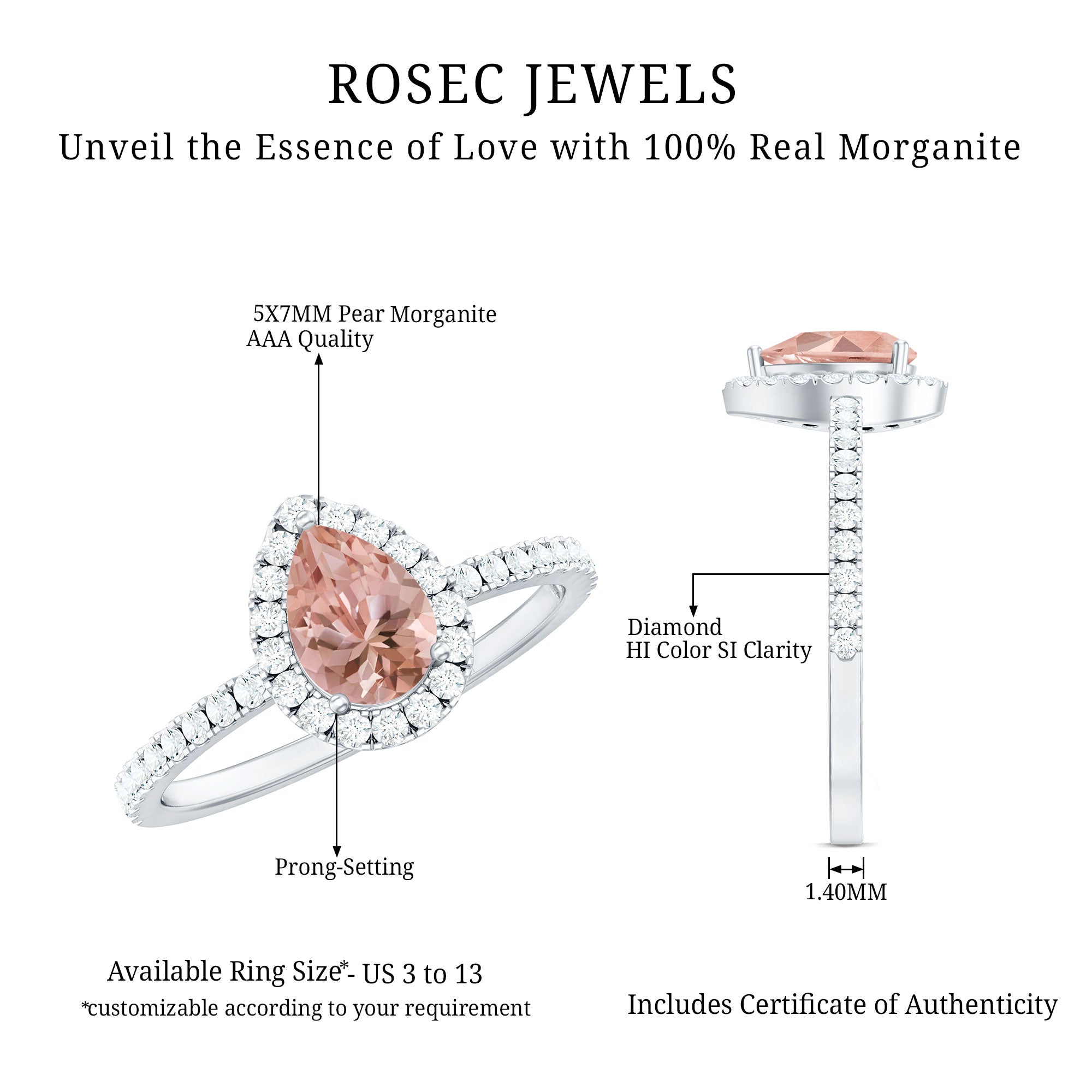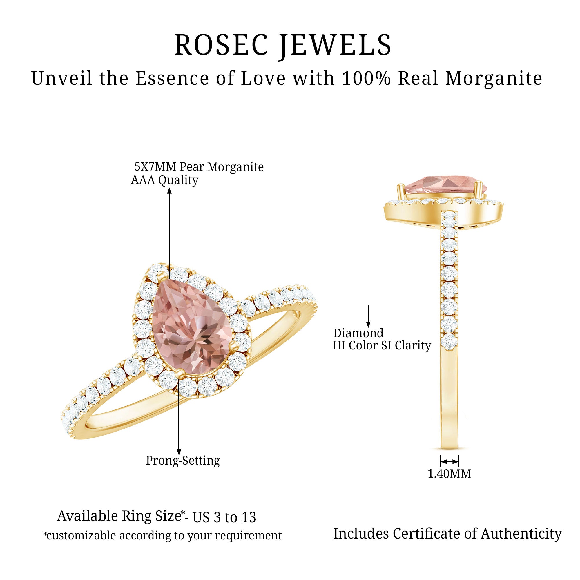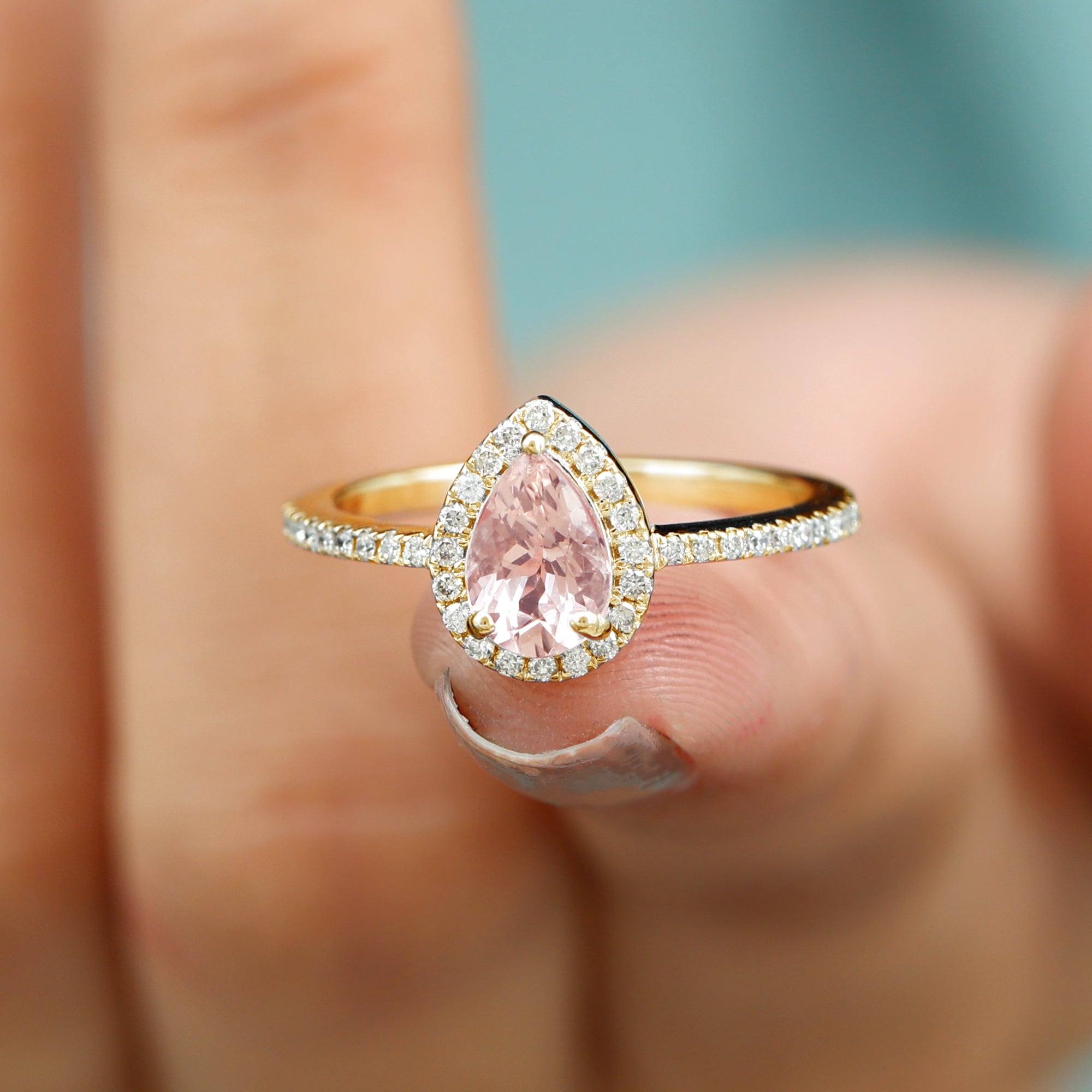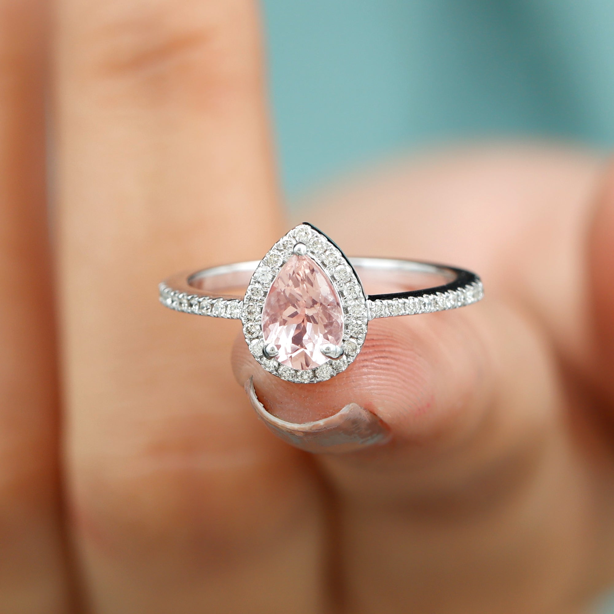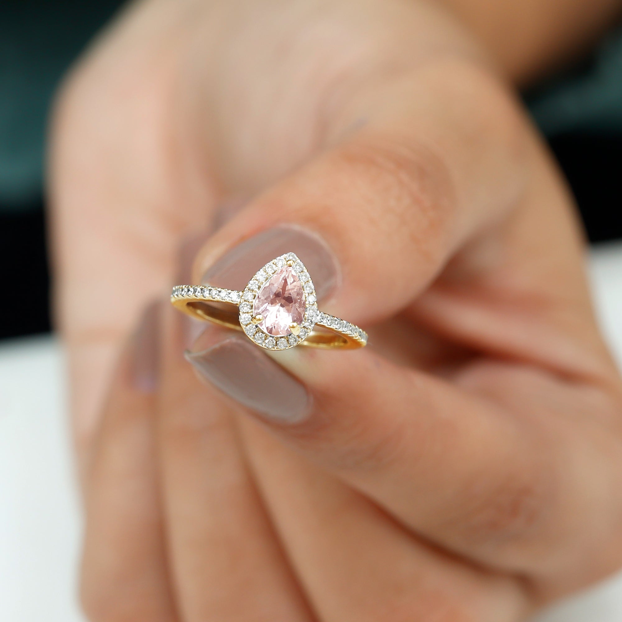 Embrace timeless beauty with this Engagement Ring, a symbol of love, passion, and your unique style. Embellished with Pear-Shaped Morganite elegantly set in the center surrounded by a halo of Diamonds. Additional Diamond adorned on the shank adds an extra touch of elegance and sophistication. The fascinating hue of this Morganite Ring makes this piece an absolute beauty. With AAA Quality Morganite, the Teardrop Ring ensures incredible durability and unmatchable brilliance. Get this Halo Ring for the love of your life and make every moment unforgettable with her.