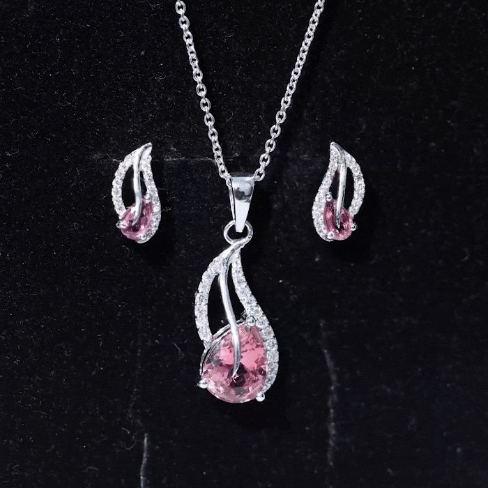 Surprise your wife on your anniversary with this stunning Jewelry Set featuring a Leaf Pendant and Earrings adorned with Pear Shape Pink Tourmaline and Round Shape Diamond gemstones. This one-of-a-kind design is sure to make her feel special and cherished.