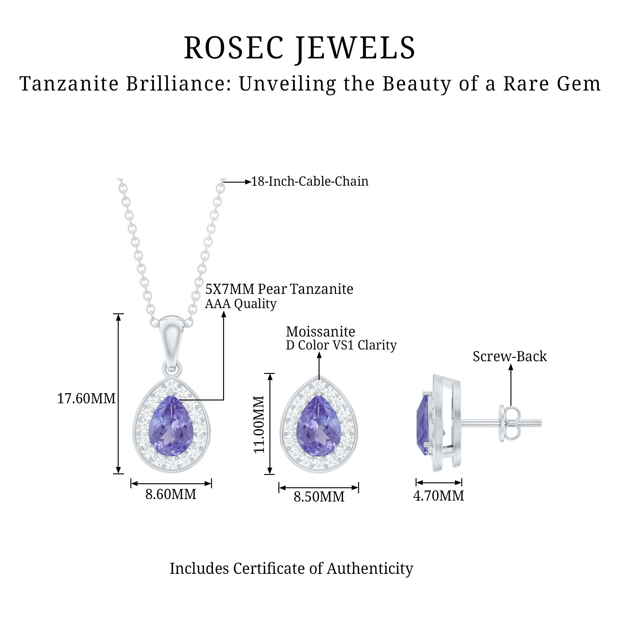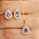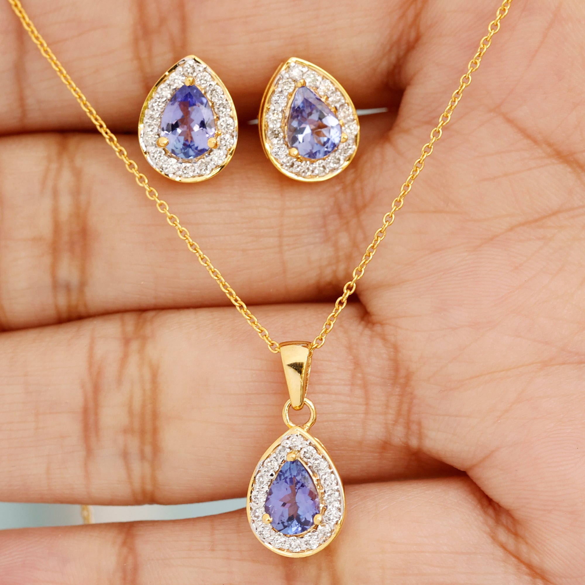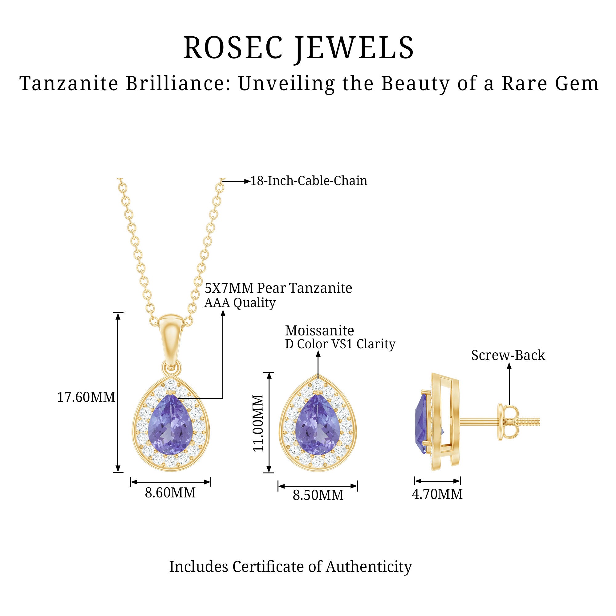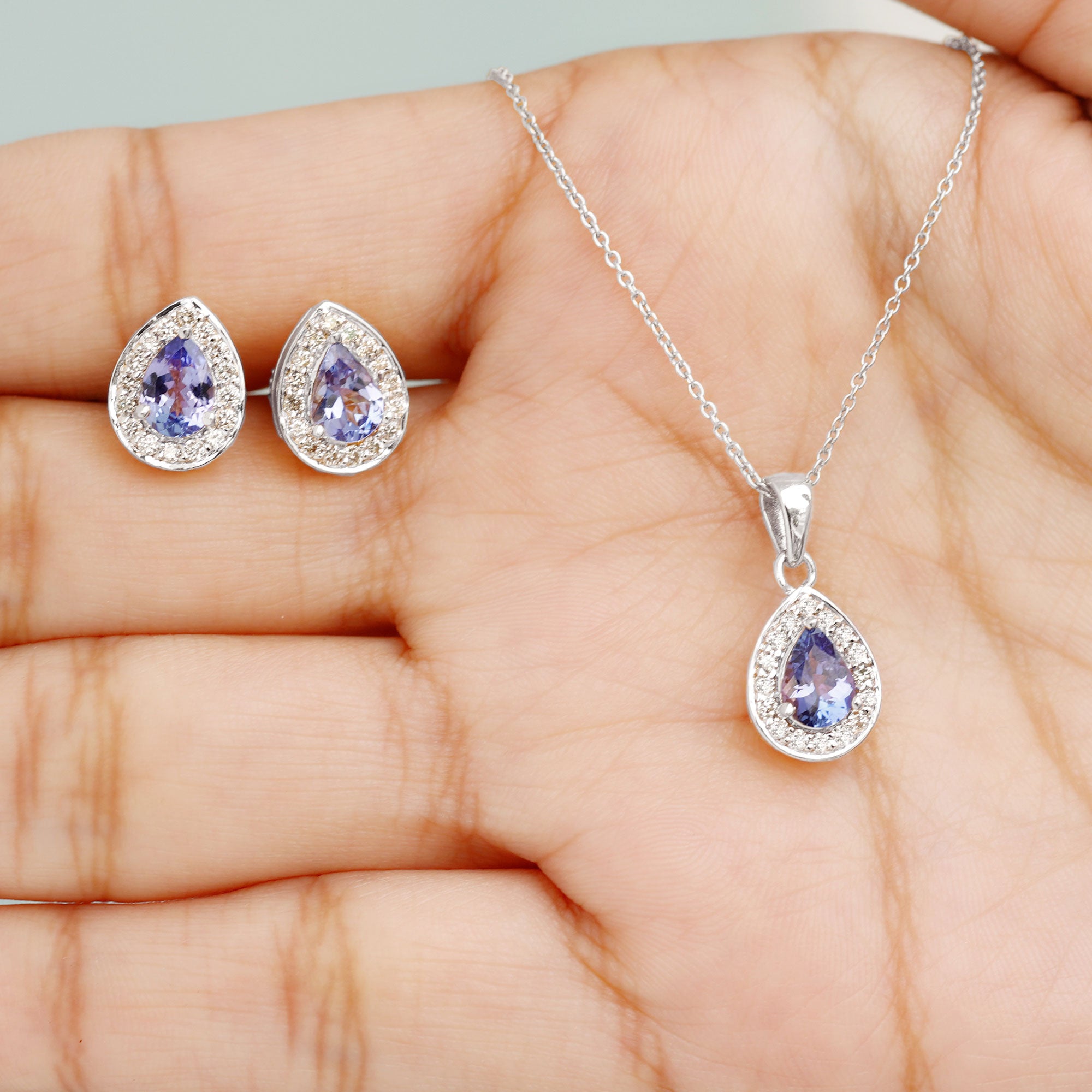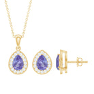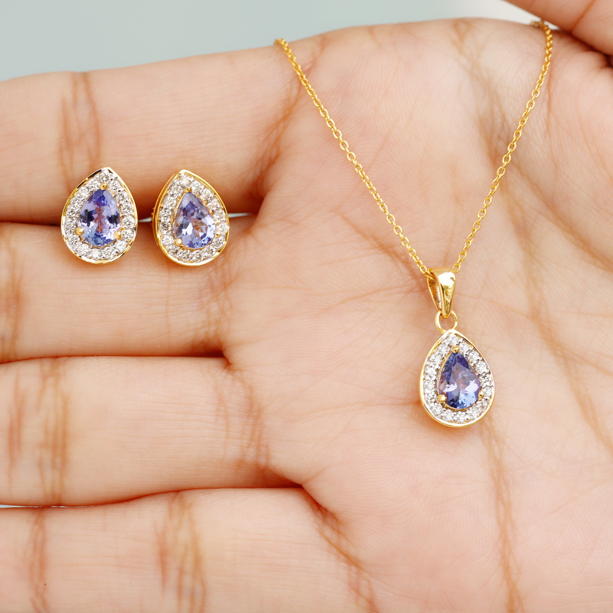 Elevate your elegance with this Pear Shape Tanzanite Teardrop Jewelry Set, complemented by Moissanite Halo—a captivating ensemble that exudes grace.