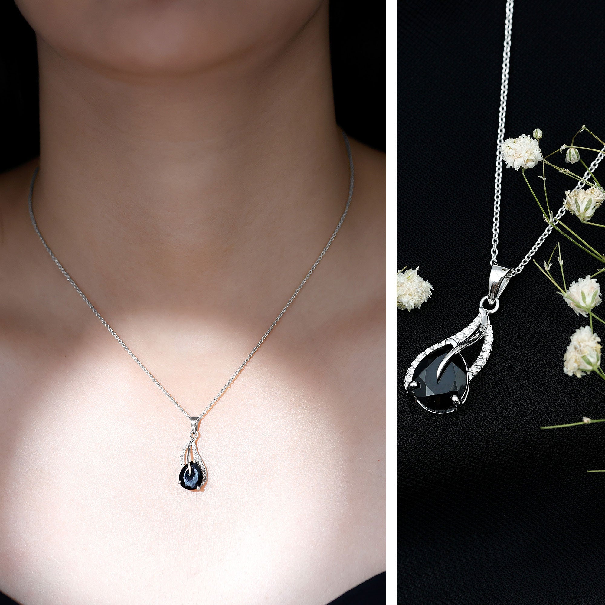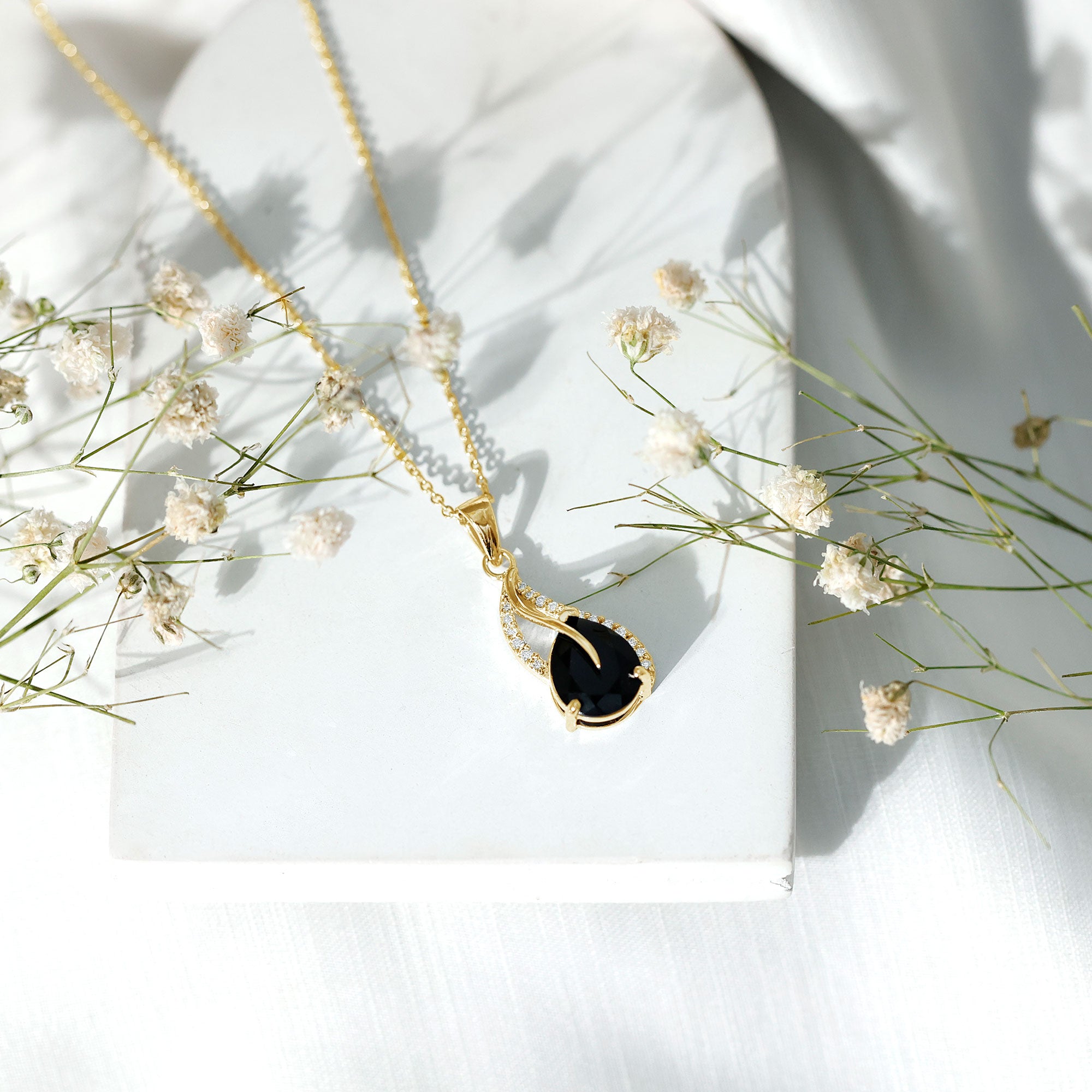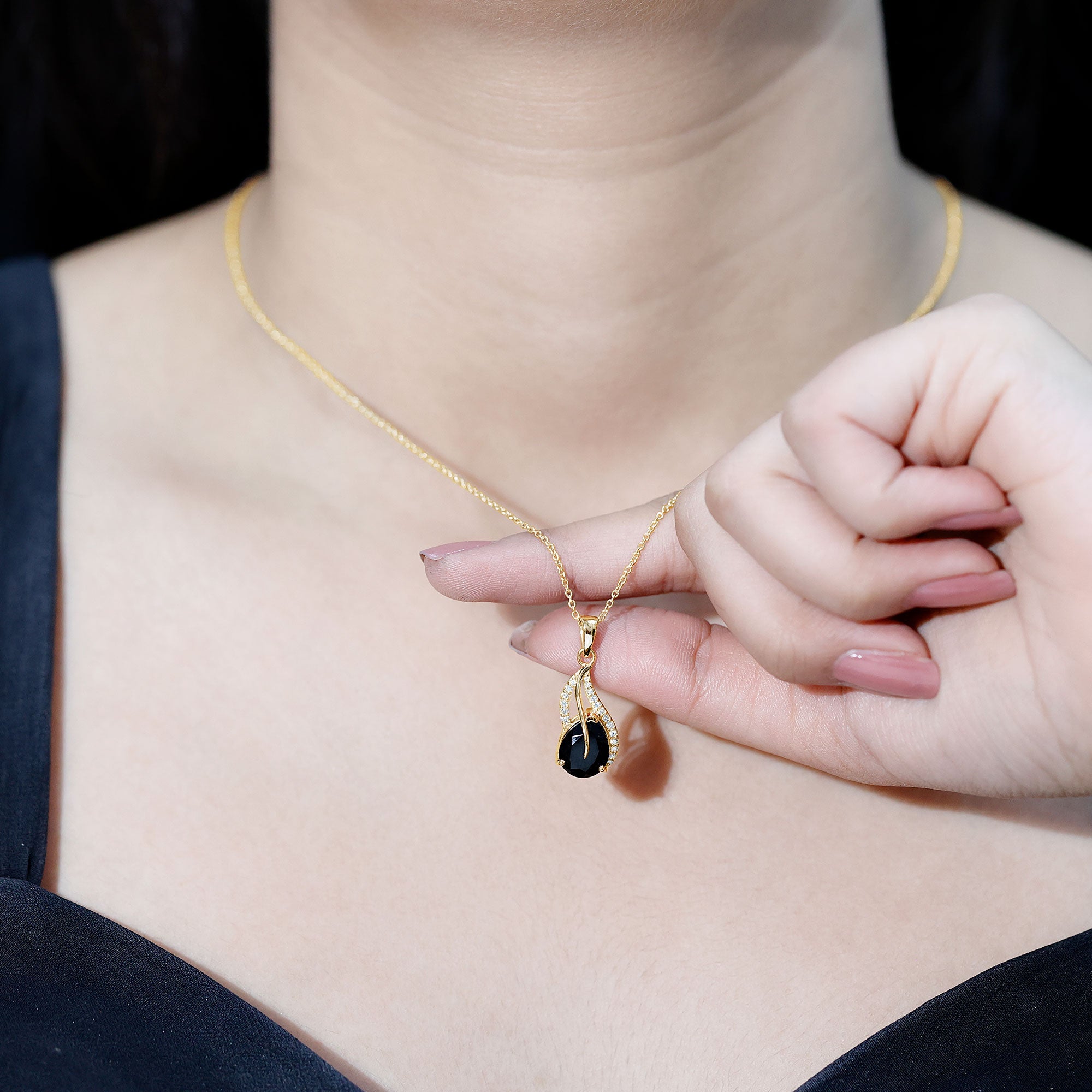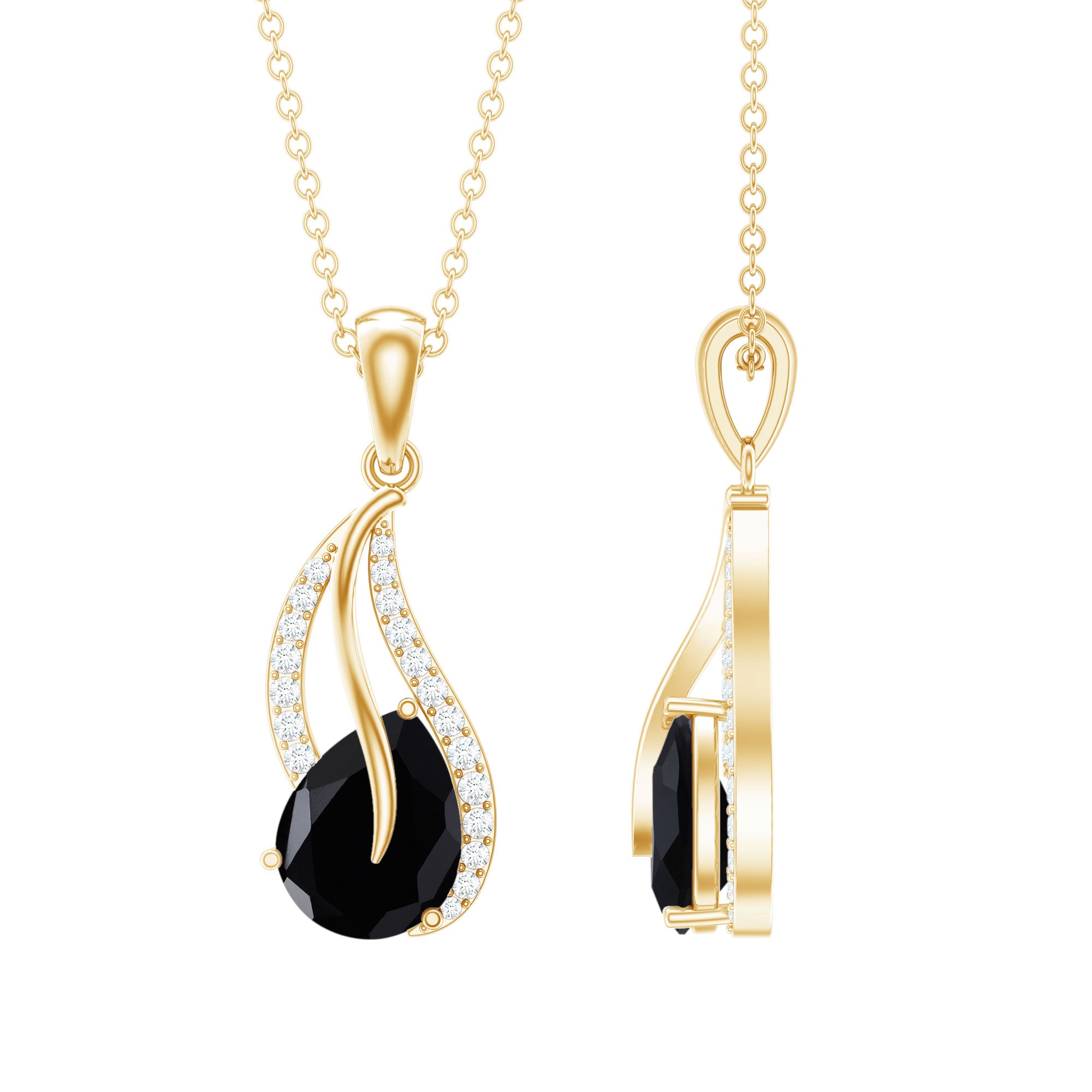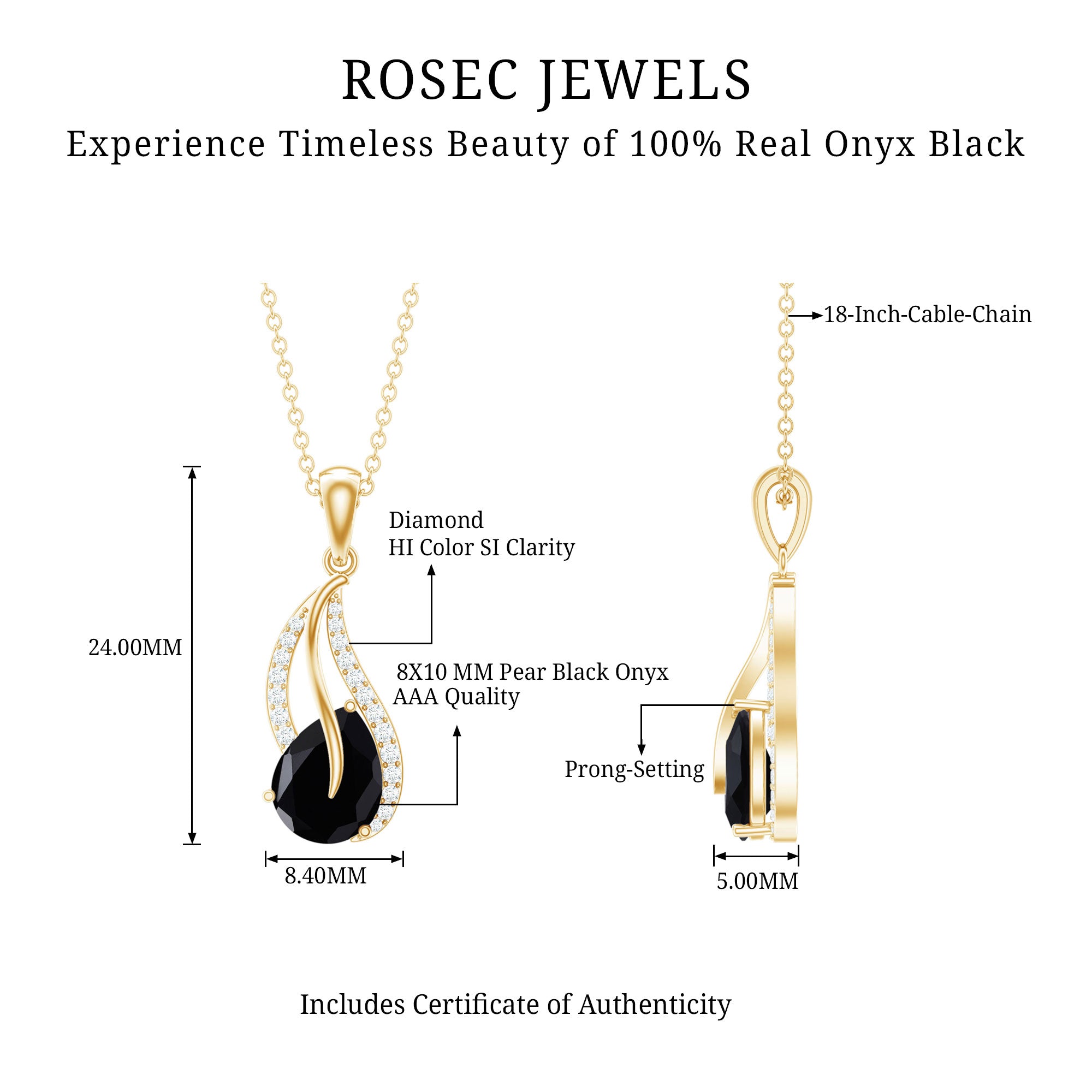 Add a touch of elegance to your everyday look with this beautiful Leaf Pendant Necklace, crafted from high quality and adorned with a shimmering 8X10 MM Pear Cut Black Onyx as the Solitaire, accented by Diamond gems. This charming piece of jewelry is the perfect accessory to elevate any outfit and is sure to make you feel stylish and sophisticated. Transform your appearance with the breathtaking combination of a rich black color and brilliant sparkle, making this Onyx and Diamond Necklace an exquisite accessory for any memorable event. Delight in the enchanting sophistication of this beautiful Black Onyx Necklace that dangles from a chain, drawing eyes with its delightful design. This stunning piece is an excellent option for both daily use and special occasions, owing to its enduring charm that will be cherished for many years ahead. Elevate your ensemble with this timeless piece featuring AAA quality black onyx and HI-SI quality diamonds, exuding brilliance.