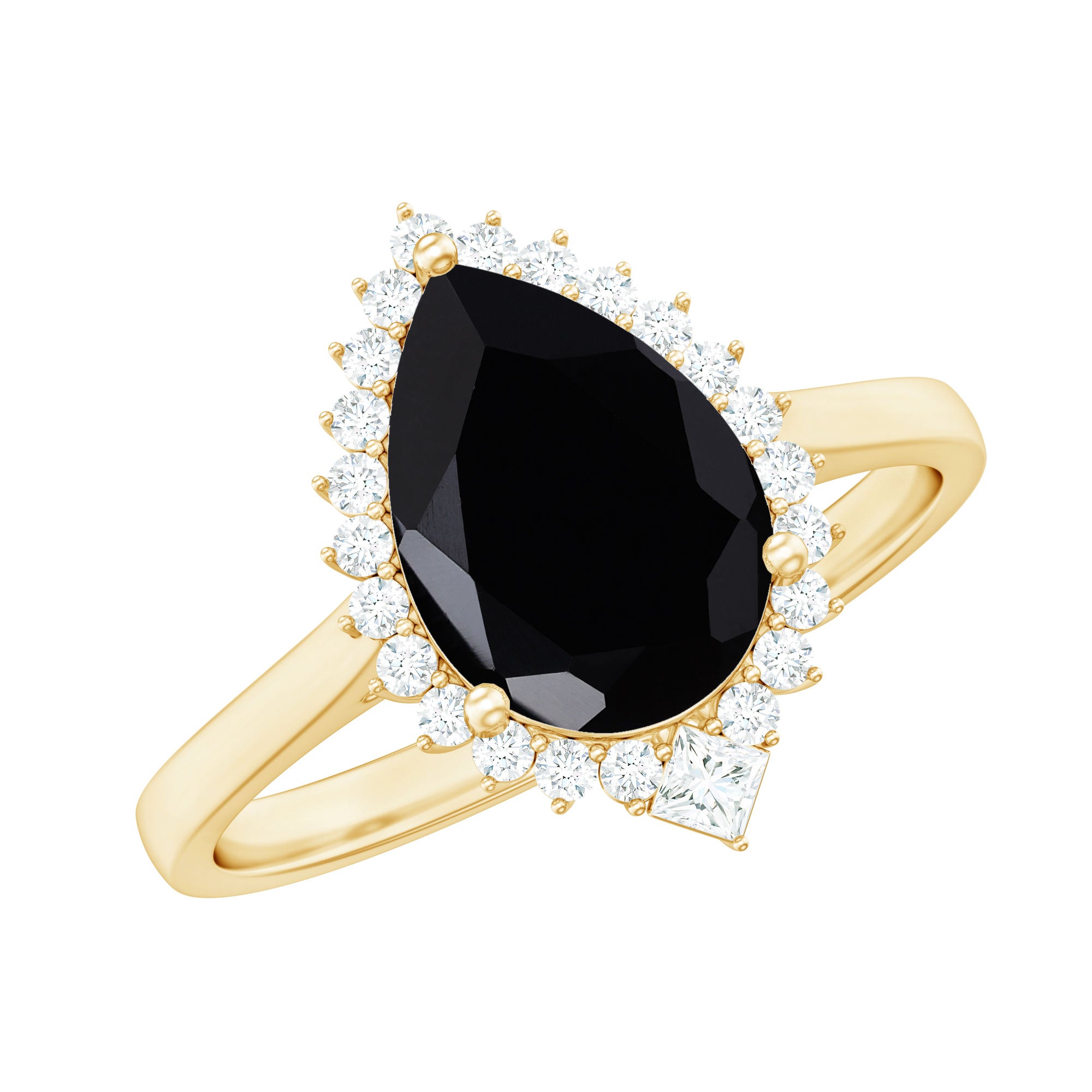 Yes, the ring features a pear-shaped black onyx center stone accented by a diamond halo.