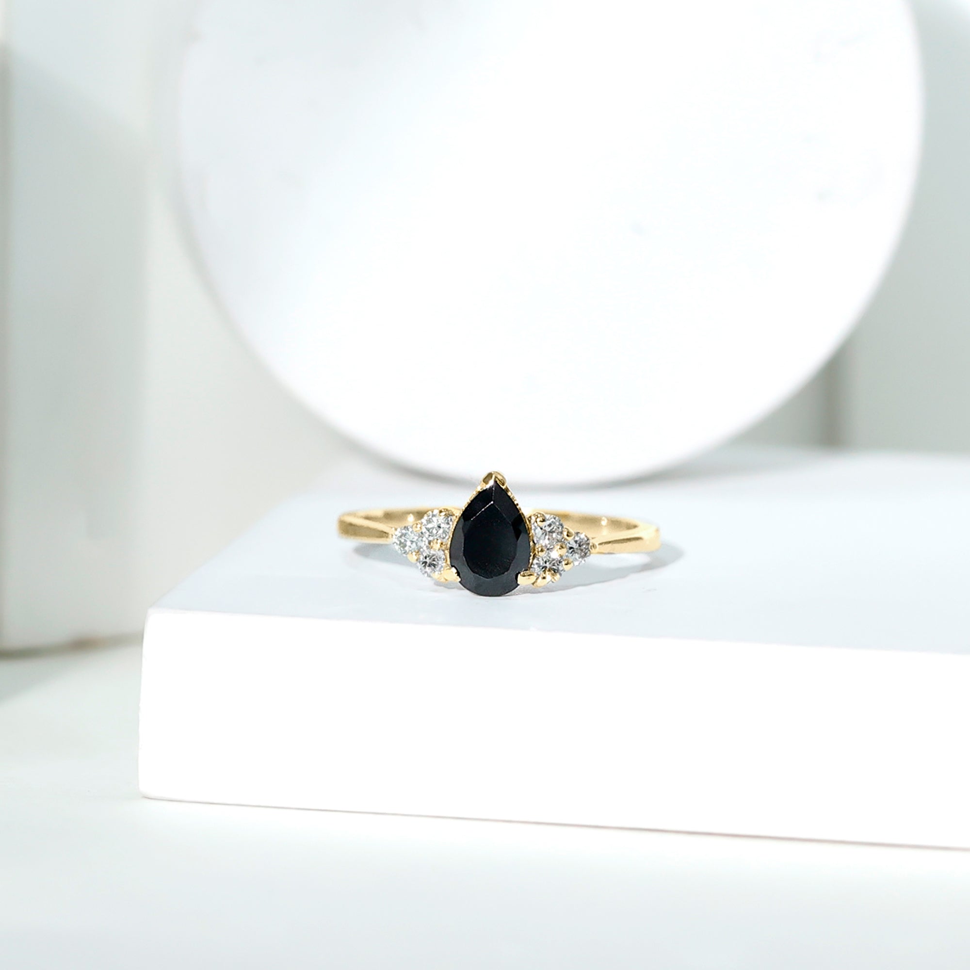 When bold meets beautiful, you get a ring that speaks louder than words. This Black Onyx Engagement Ring is a timeless piece of jewelry. Designed for the woman who owns her style and is not afraid to stand out, this Teardrop Engagement Ring brings together elegance and timeless charm in one stunning piece. It is embellished with a striking 6X8 MM pear cut black onyx, set in secure claw setting. On either side of the center stone, you will find a cluster of three sparkling diamonds that add the perfect touch of shine without stealing the spotlight from the main gem. Whether you are getting engaged, marking a special moment, or simply treating yourself, this Pear Shaped Onyx Ring is designed to make you feel confident and unforgettable. The pear shape of the onyx draws attention, while the diamond trio gives it that extra sparkle you will love every time the light hits. It is perfect for women who appreciate understated glamour with a twist. This Onyx and Diamond Ring is not just about the look, it is about how it makes you feel. Packaged in a beautiful box, it is ready to be gifted or to become your new favorite piece. Because you deserve a ring that is as bold and brilliant as you are.
