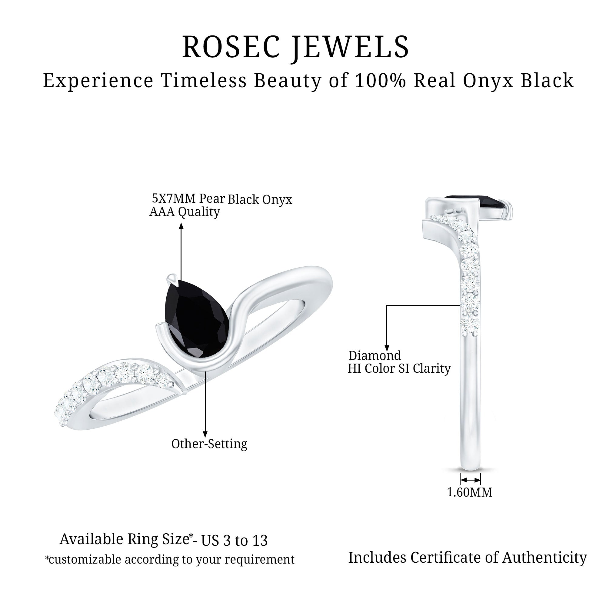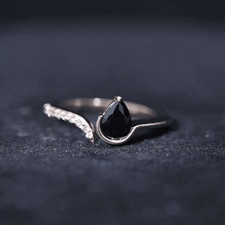 Celebrate simplicity and style with this sleek Black Onyx Promise Ring, designed for women who love modern elegance. The Open Cuff Ring features a 6X8 MM pear shaped Black Onyx of AAA quality, set on one end. On the opposite side, a delicate row of sparkling round diamonds adds a graceful touch, creating a beautiful contrast that makes this piece stand out. The open cuff design gives the Teardrop Ring a unique and contemporary look, making it easy to wear alone or stacked with other rings for a personalized style. Its slim band adds to the minimalistic charm, perfect for everyday wear or special occasions. Black Onyx is the birthstone for December and is known for its protective qualities and ability to bring strength and calm to the wearer. This makes the Black Onyx Ring a meaningful gift, especially for those born in December, or anyone who appreciates stones with special significance. This Onyx and Diamond Ring is not only stylish but also comes with a certificate of authenticity, ensuring the quality of the stones. It also includes a secure box for safekeeping when not worn. Whether you are marking a special promise or simply want a graceful accessory, this Proposal Ring blends elegance with meaning.