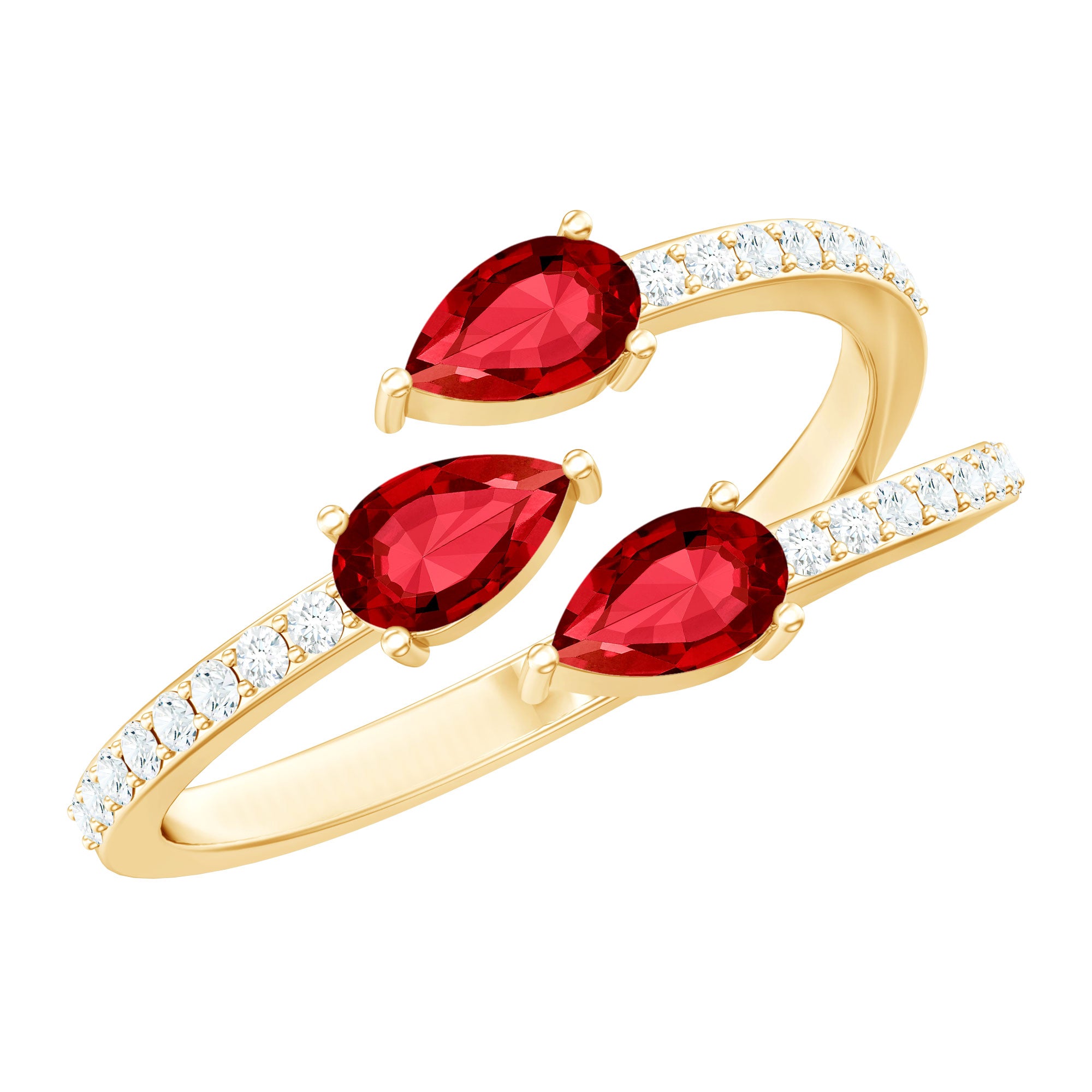 Turn heads without even trying with this bold and beautiful Lab Created Ruby Cocktail Ring. Designed to break away from traditional styles, this unique piece features three 4X6 MM pear shaped lab grown rubies placed horizontally in east west style. While shimmering diamond stones studded along the wrap-style band add the perfect sparkle to elevate the entire look. What makes this Ruby Three Stone Ring even more special is the wrap design that flows smoothly around your finger. It is not just stylish, it also represents connection, unity, and the beauty of a bond that keeps growing stronger. Whether you are heading to a fancy dinner, a cocktail event, or just want a standout piece in your everyday jewelry, this Ruby and Diamond Ring makes sure you shine with confidence. Crafted with care and high quality materials, it is made to last just like the meaning behind it. The combination of AAAA quality lab created rubies and sparkling HI-SI quality diamonds makes it a real showstopper. This Wrap Ring for Women is a great gift if you want to treat yourself or someone special, something that feels thoughtful, stylish, and full of personality. To make the experience even better, your Lab Created Ruby Ring comes tucked inside a premium signature jewelry box, making it instantly ready for gifting.