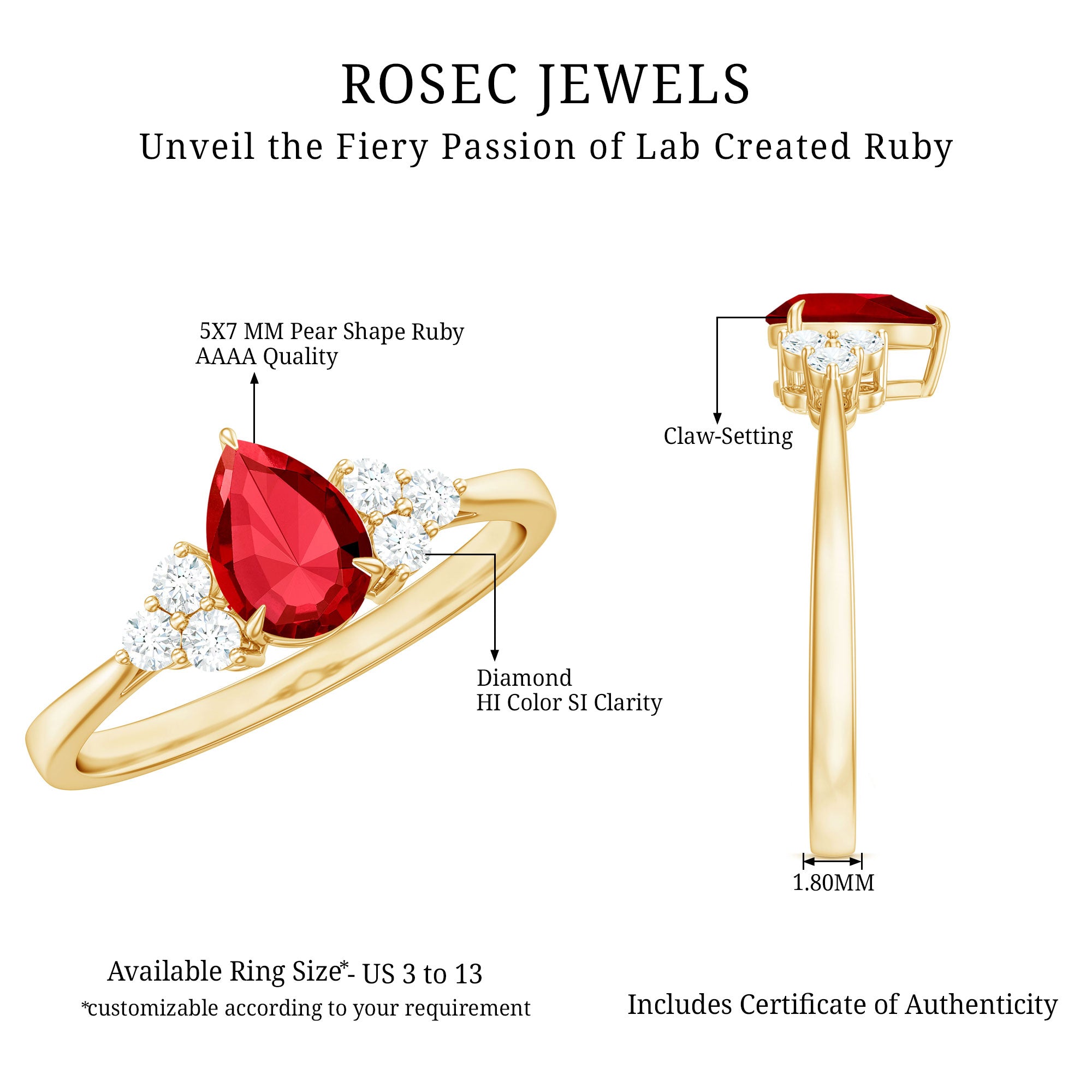 Make a statement with this Lab Grown Ruby Engagement Ring, designed for those who value both beauty and sustainability. At its center sits a stunning 5X7 MM pear shaped lab grown ruby, set in claw setting for a secure look. The centerpiece is beautifully enhanced by a trio of sparkling round cut diamonds, carefully set to highlight the ruby’s brilliance and create a striking contrast. The diamonds add sparkle and elegance, complementing the vibrant hue of the AAAA quality ruby while maintaining a refined and timeless look. This Ruby and Diamond Ring is the perfect combination of bold design and graceful elegance. Its pear shaped ruby makes it stand out from traditional solitaire styles, while the trio of diamonds adds a modern and glamorous touch. Crafted with lab grown ruby, the Teardrop Engagement Ring is an ethical and environmentally friendly choice, allowing you to celebrate love in a conscious and meaningful way. Ideal for a proposal or as a special gift, this Lab Created Ruby Ring symbolizes not just commitment, but the beauty of shared moments and lasting memories. Its striking design, rich color, and sparkling accents ensure it will be admired for years to come.