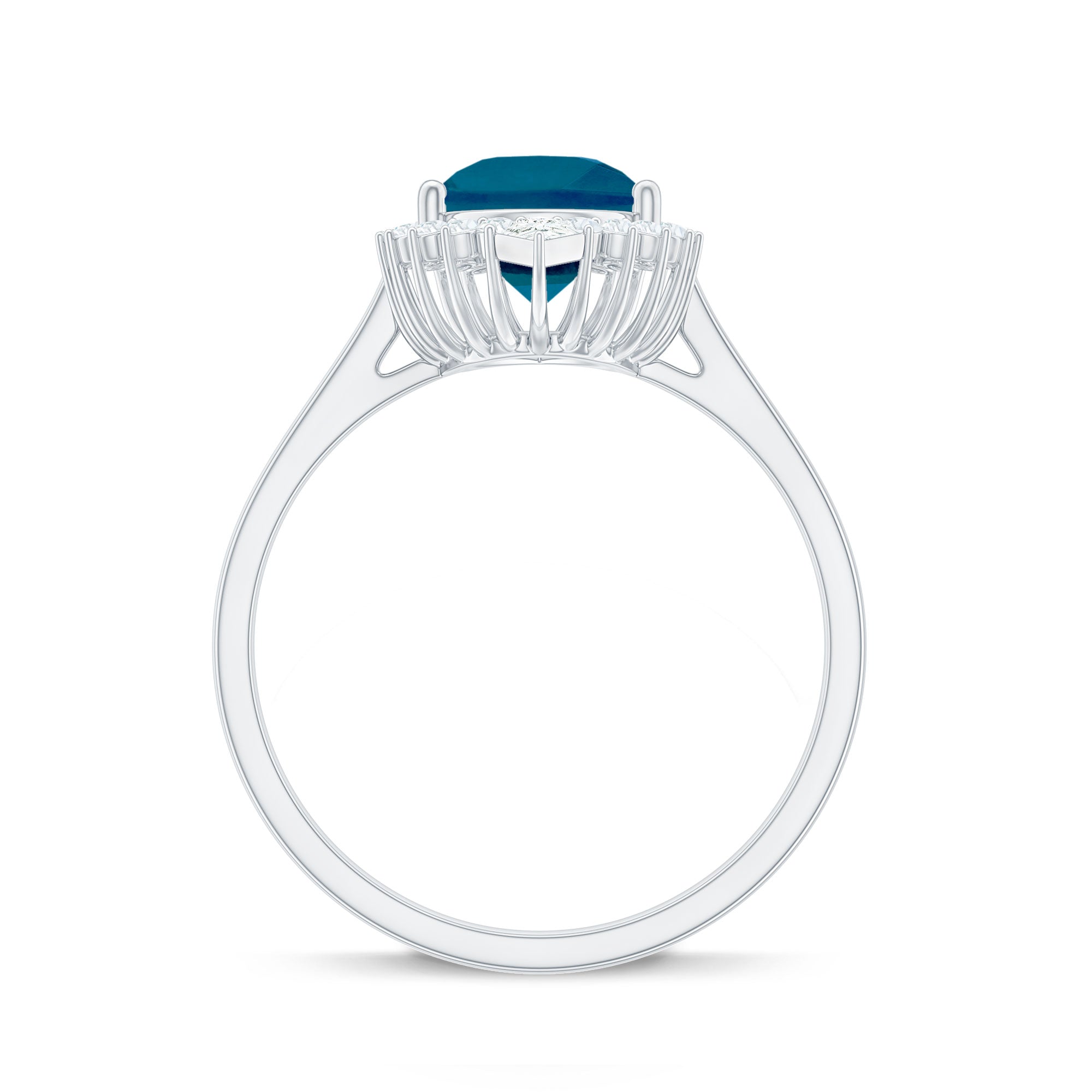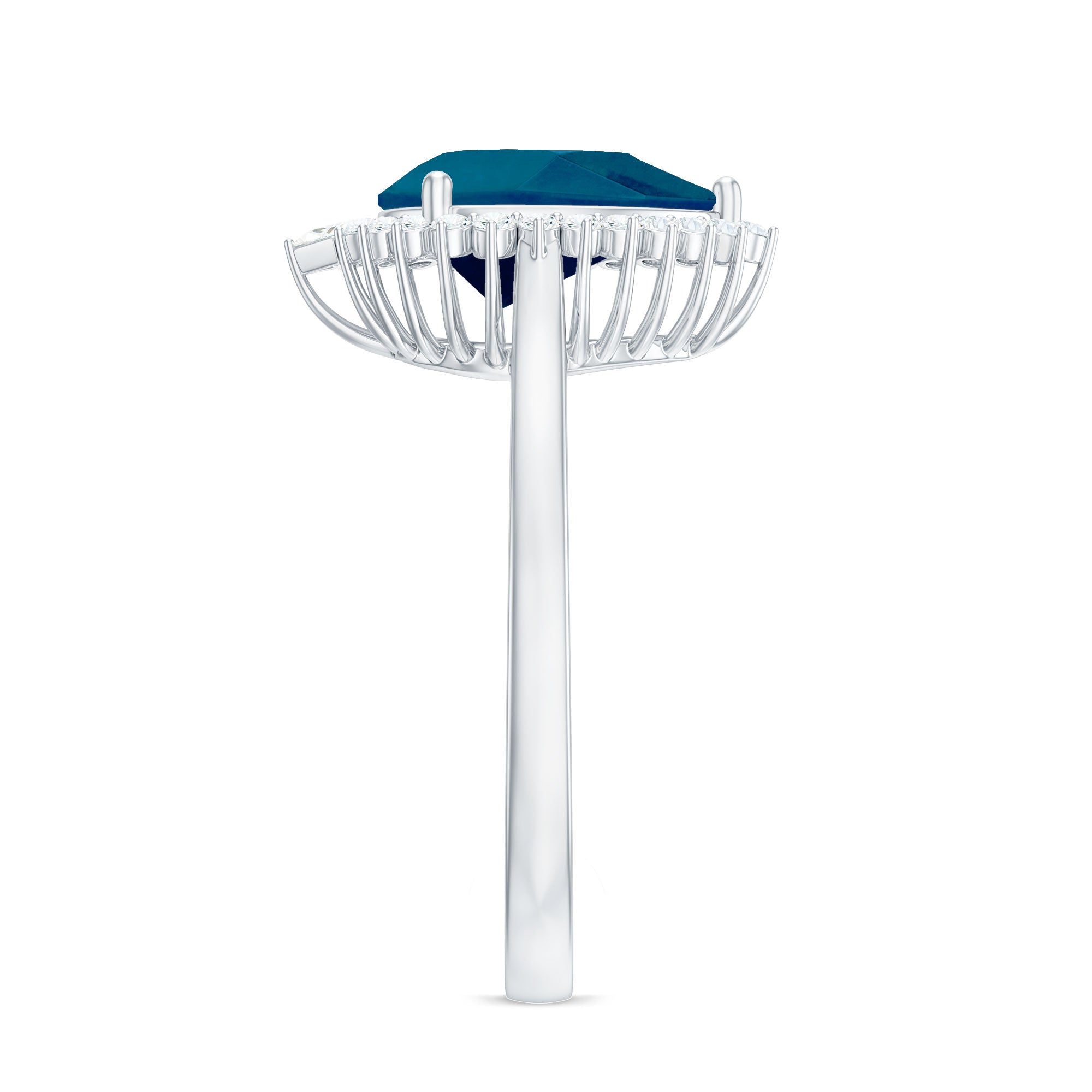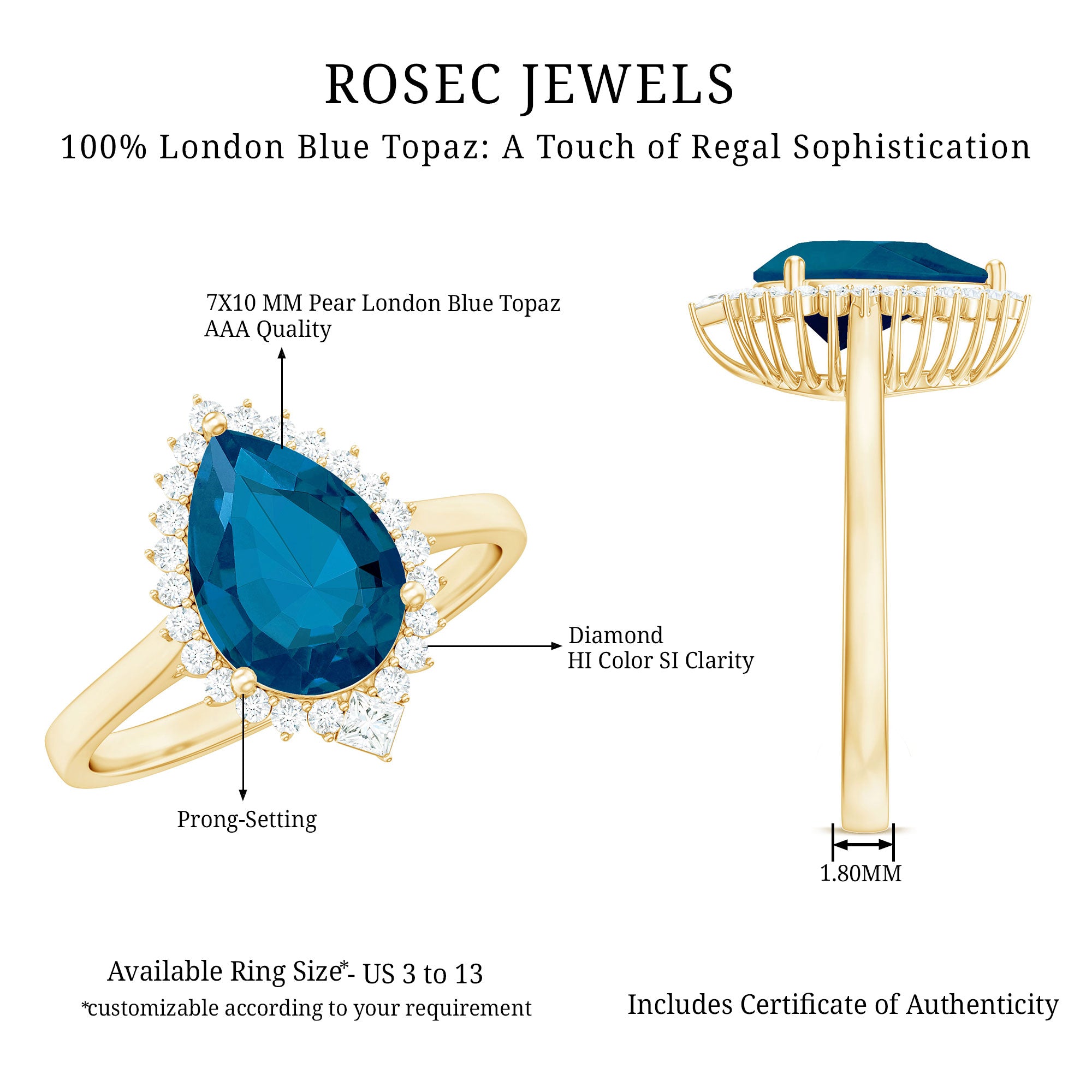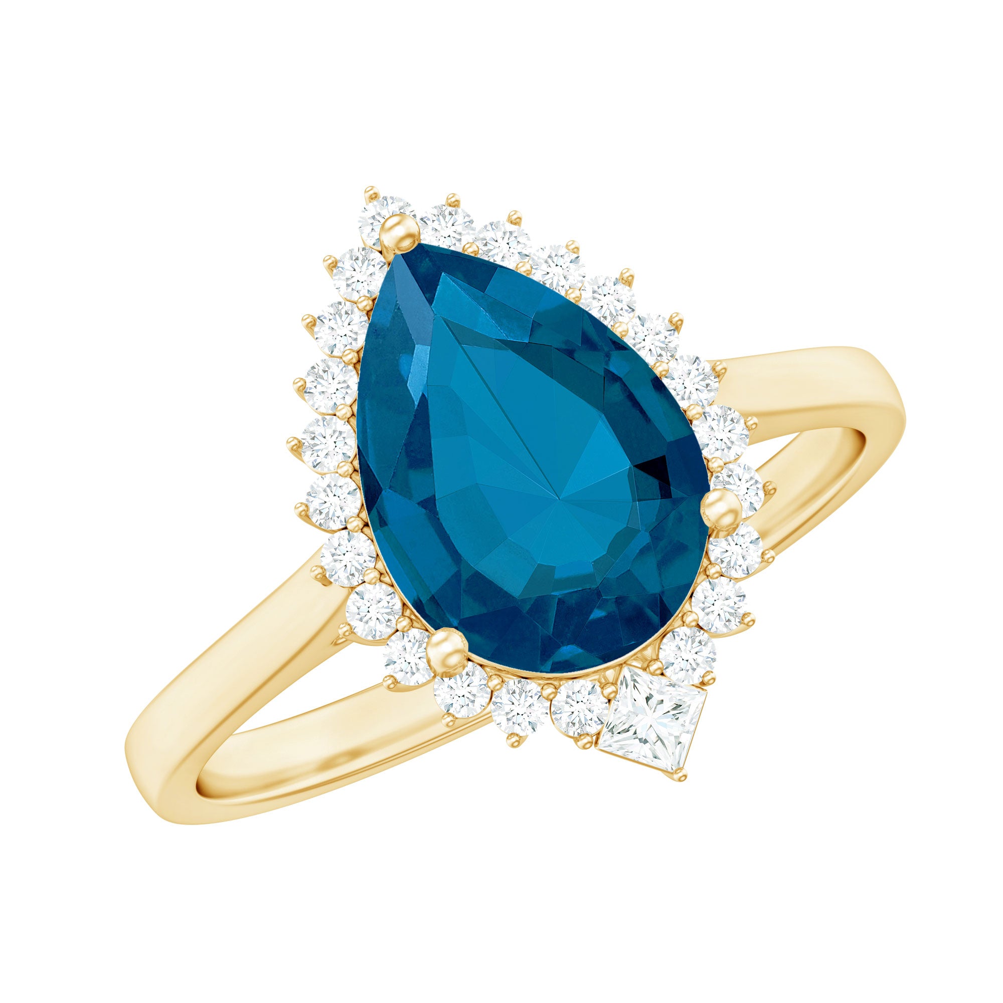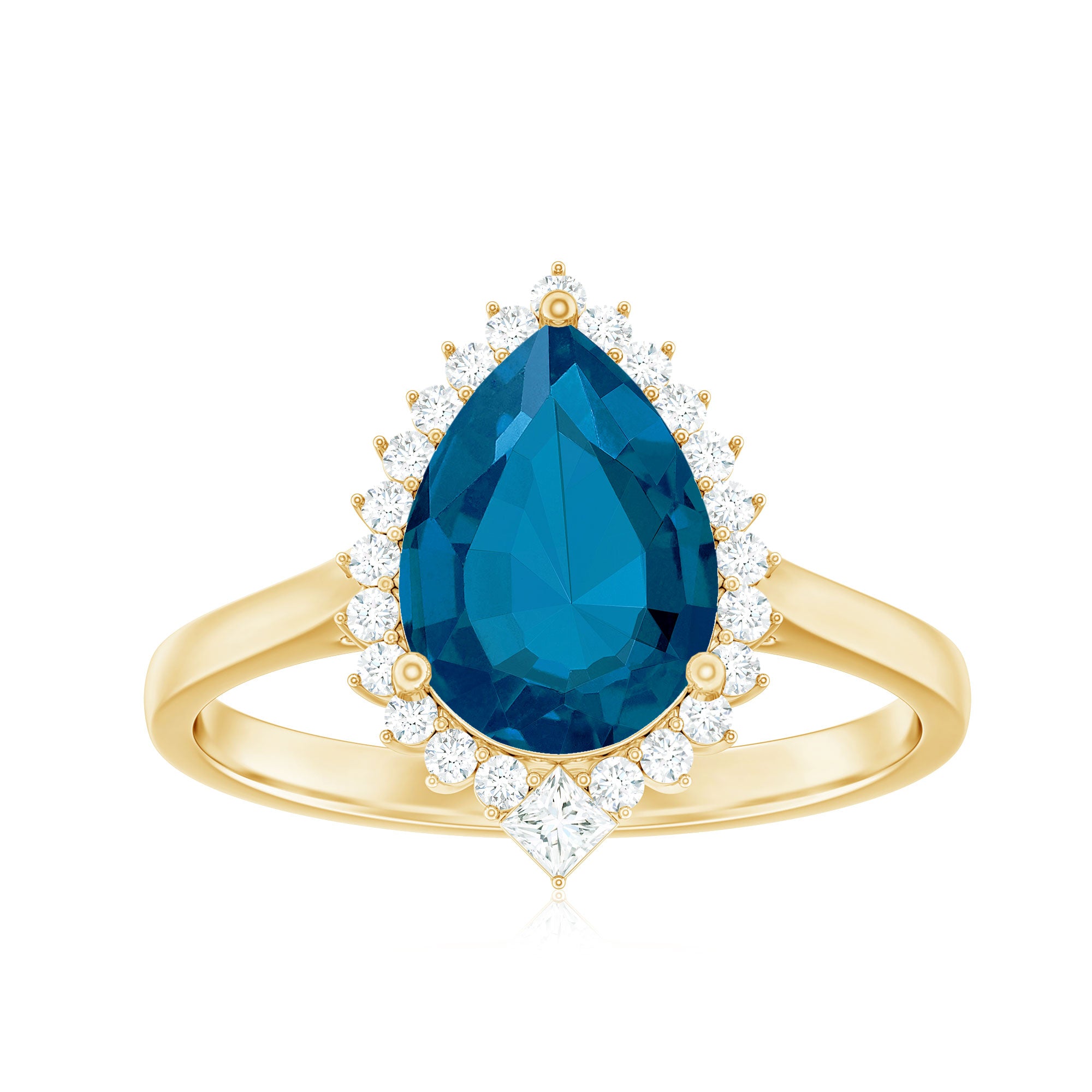 Turn heads with a ring that is made to shine from every angle. This eye catching Blue Topaz Statement Ring is perfect for someone who loves elegant design with a bold twist. At the center is a stunning 7X10 MM pear shaped London Blue Topaz of AAA quality. The gemstone is held securely in prong setting, allowing its beauty to take center stage. Surrounding the topaz is a halo of round cut HI-SI quality diamonds that bring just the right amount of sparkle. Adding a special detail, a single princess cut diamond is placed at the bottom of the halo, an elegant and thoughtful touch that adds a hint of vintage charm to the modern design. The band is kept smooth and simple, making the design stand out even more. This balance gives the London Blue Topaz Engagement Ring a timeless feel while still making a strong, stylish statement. Whether you are dressing up for an evening event or adding a bit of luxury to your everyday look, this Pear Shaped Blue Topaz Ring is a stunning choice. Designed with care and available in a range of sizes, this Blue Topaz and Diamond Engagement Ring fits comfortably while offering a luxurious look. Whether it is a gift for someone special or a treat for yourself, this Statement Ring for Women is a beautiful way to show personality, confidence, and grace, all in one piece.