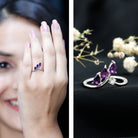 Add a graceful twist to your ring stack with this beautifully designed Engagement Ring Guard, perfect for giving your solitaire or engagement ring a stylish upgrade. Made with care in white gold plated silver, this enhancer is thoughtfully crafted to complement and elevate your existing ring, making it look even more elegant and full of character. The band features a unique chevron shape that wraps smoothly around your center ring, adding both structure and visual interest. On one end, you will find pear shaped amethysts, set securely in prongs to resemble soft, curved leaves. To add just the right touch of brilliance, a round brilliant cut lab grown diamond is set at the center of the Amethyst Stackable Ring. This Wedding Ring Enhancer is made to fit comfortably on your finger while holding your engagement ring securely in place. The smooth band makes it perfect for everyday wear, while the eye-catching details give it that special occasion flair. The combination of AAA quality Amethyst and EF-VS quality lab grown diamond ensures you are wearing something both beautiful and responsibly sourced. Whether you are celebrating an anniversary, upgrading your bridal set, or just want something new to love in your collection, this Chevron Ring adds the perfect touch.