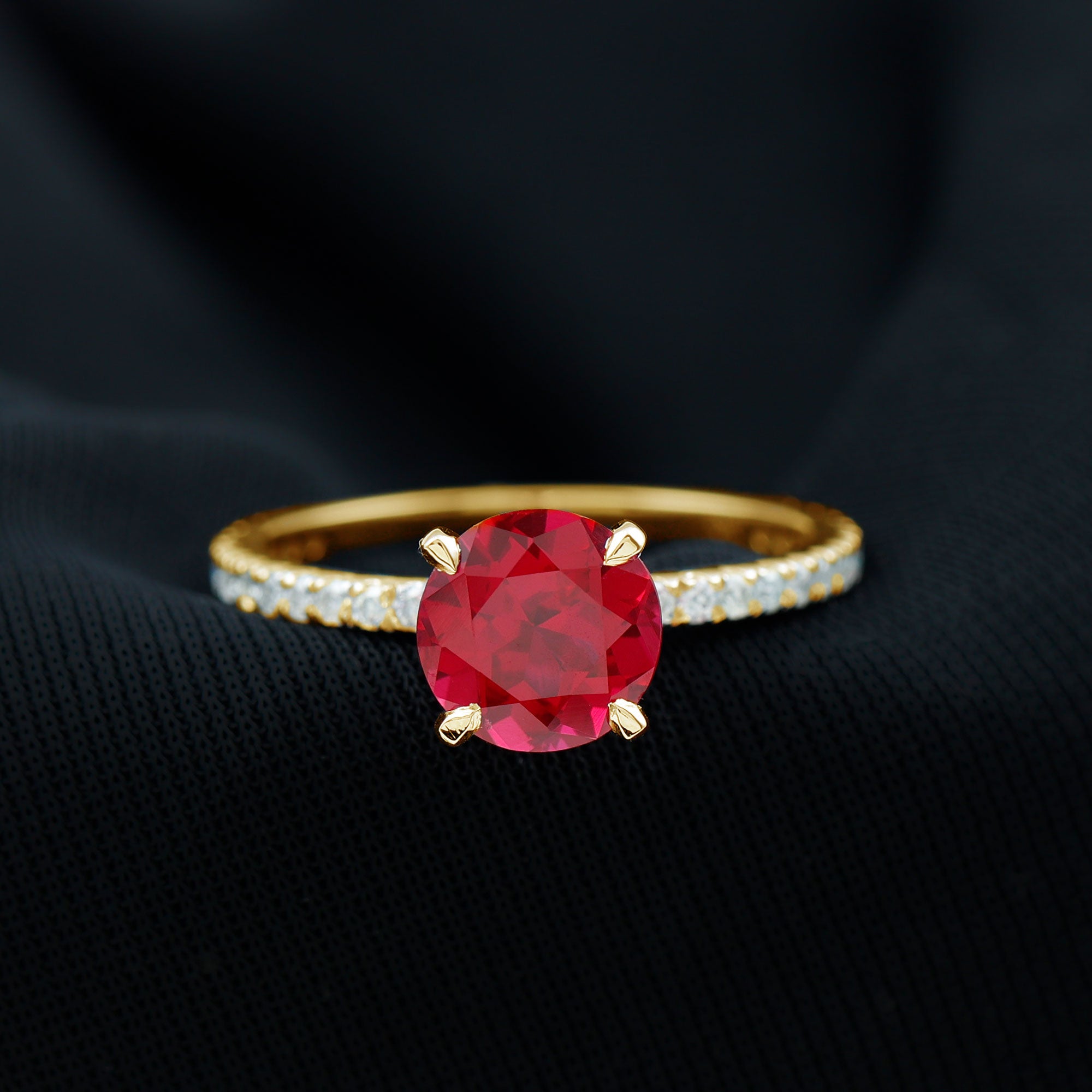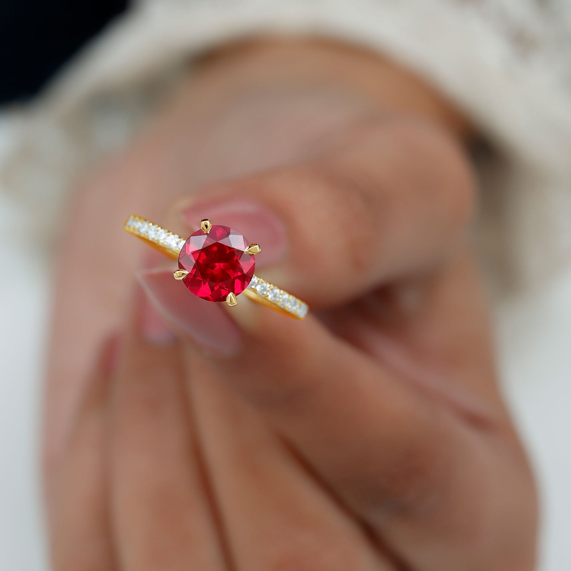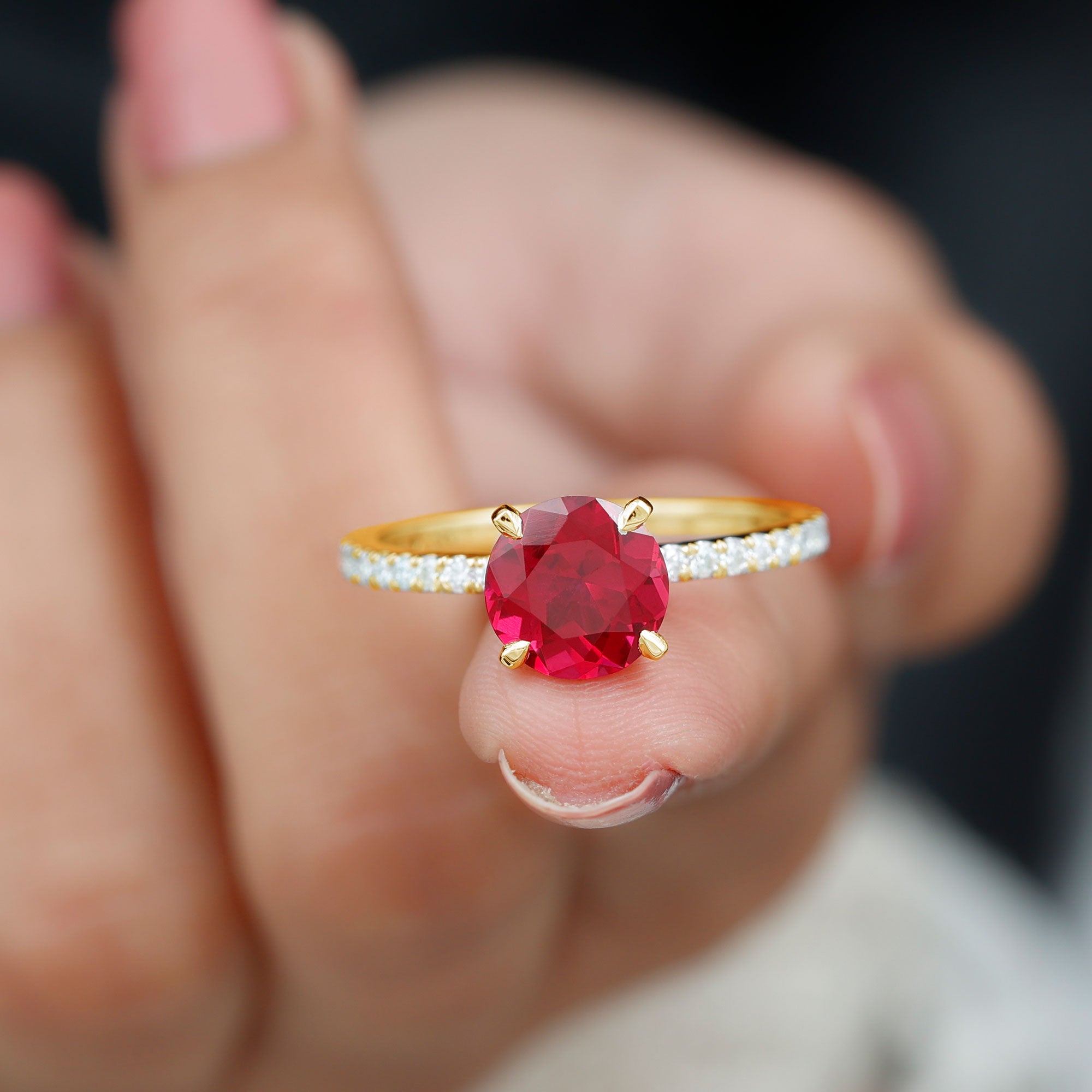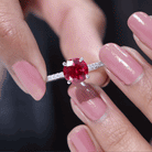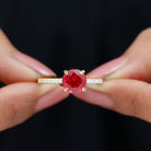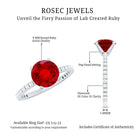 This Engagement Ring features captivating Created Ruby and Diamond stones. The Round shape Created Ruby takes center stage in a Peg Head Setting, complemented by Round shape Diamond side stones. This Solitaire Ring promises eternal sparkle.
