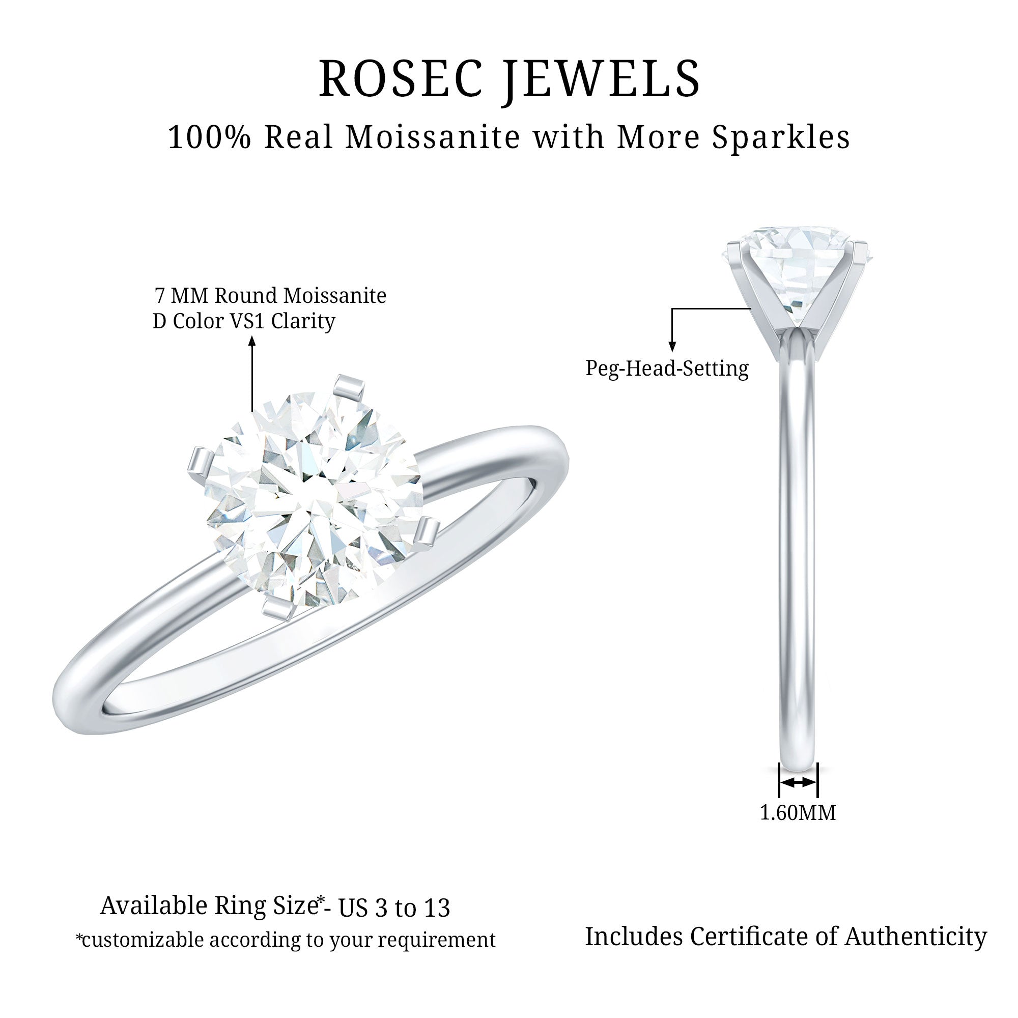Simply elegant, this Round Moissanite Engagement Ring is the perfect way to honor your love story. At the center of this beautiful Solitaire Ring is a 7 MM round moissanite, set in peg head setting that lifts the stone to catch the light from every angle. With its brilliant sparkle, the solitaire design never goes out of style. This Round Engagement Ring is a great choice for anyone who loves timeless beauty with a modern twist. The moissanite offers incredible shine and clarity, similar to a diamond but with a more affordable and ethical appeal. Designed for comfort and everyday elegance, the sleek band feels smooth on the finger and pairs beautifully with other rings if you would like to stack or add a wedding band later. It is available in US sizes 3 to 13, so you can find the perfect fit. Every detail of this 1 Carat Moissanite Ring is carefully crafted, from the sparkle to the secure setting that keeps it in place. It comes in a signature jewelry box, making it ready to gift for an unforgettable moment. For anyone who appreciates classic style with meaningful beauty, this Moissanite Solitaire Engagement Ring is a thoughtful and stunning choice.