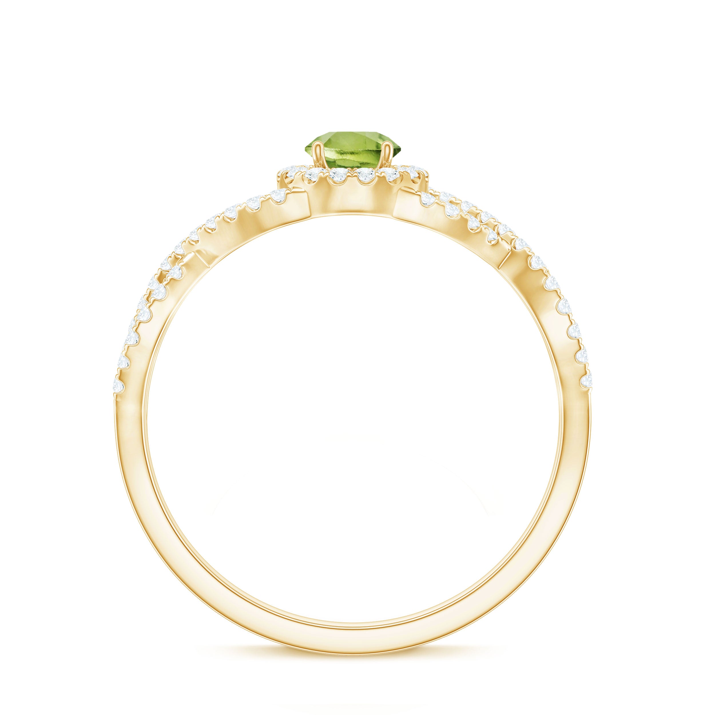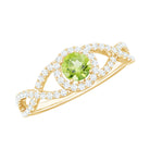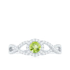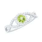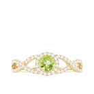In this exquisite engagement ring, a stunning round Peridot takes center stage, held securely in a classic prong setting. The shank of the ring features a crisscross design embellished with sparkling Diamond stones, adding a touch of luxury and allure. This peridot engagement ring exudes enchanting beauty and elegance.