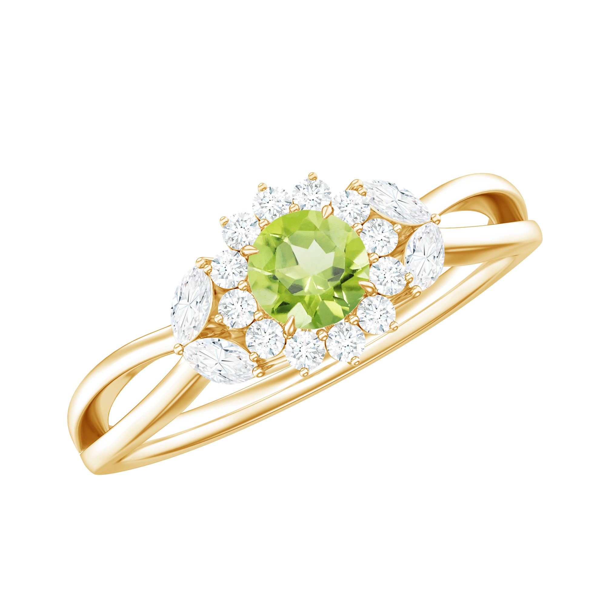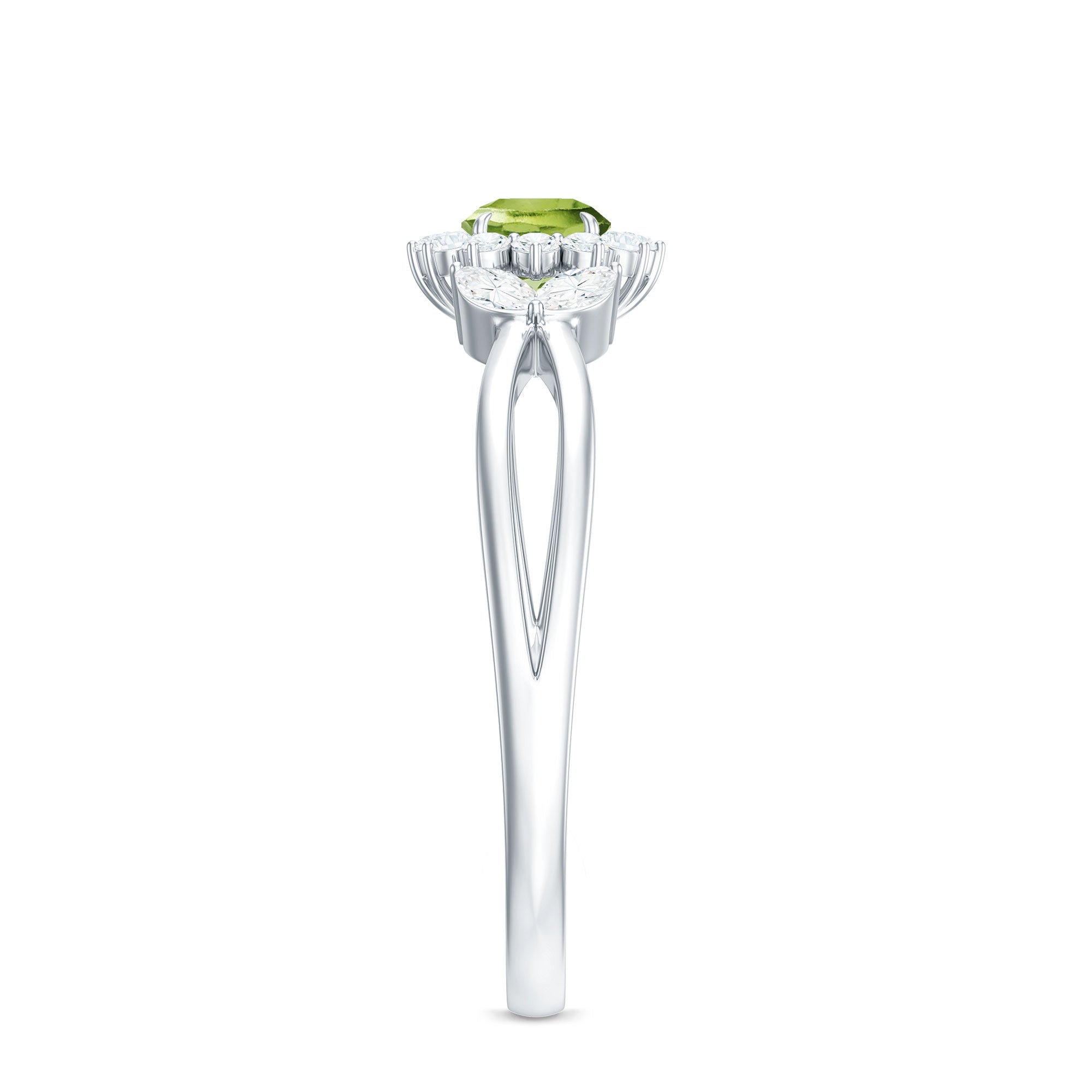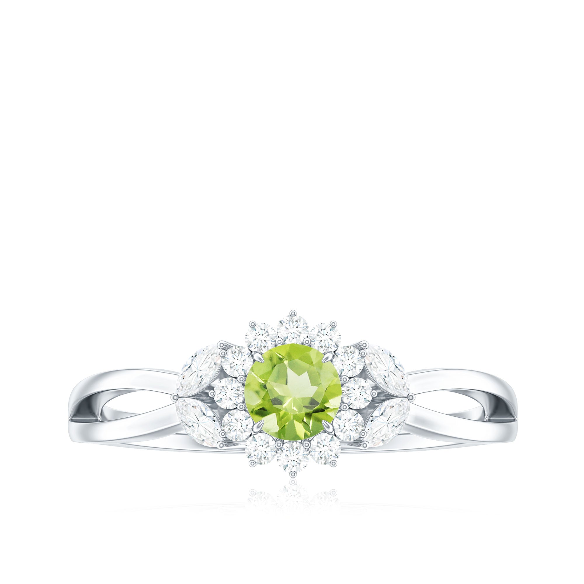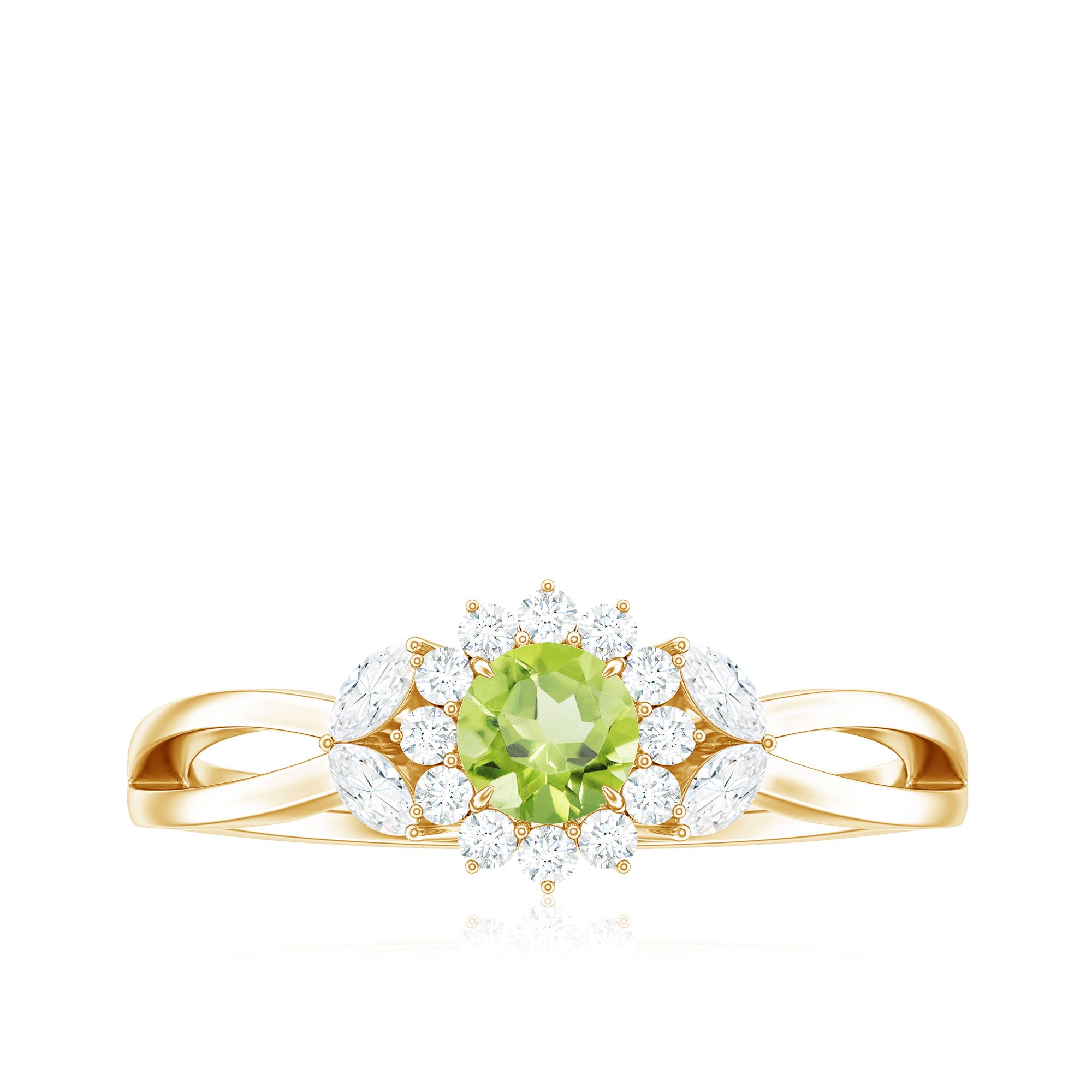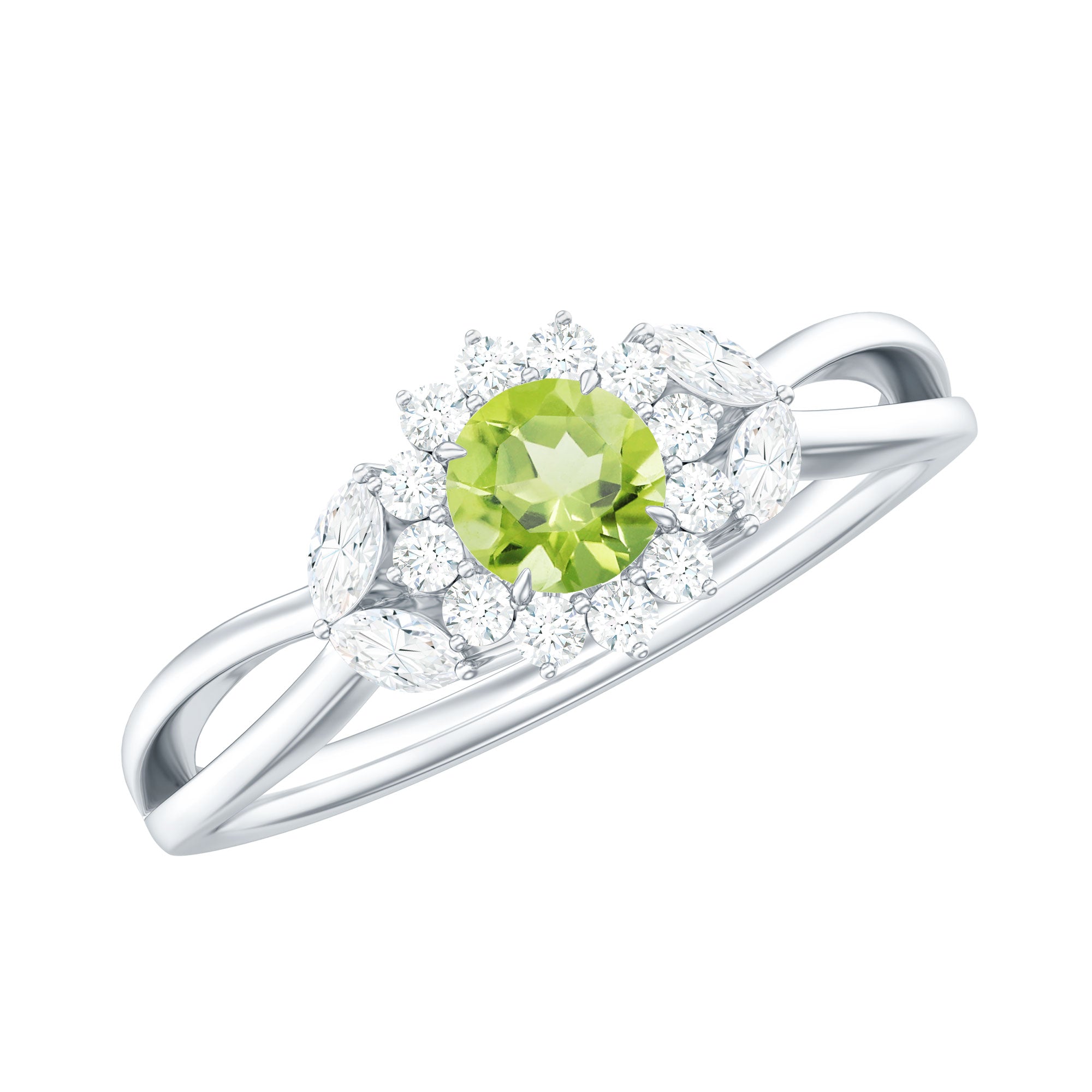 The Floral Ring is featuring a Round Peridot, held in Claw Setting, and a Halo of Round Diamond along with Marquise Cut Diamond. This Peridot Engagement Ring is an alluring piece of fine jewelry, it has a split shank to give it a captivating touch.