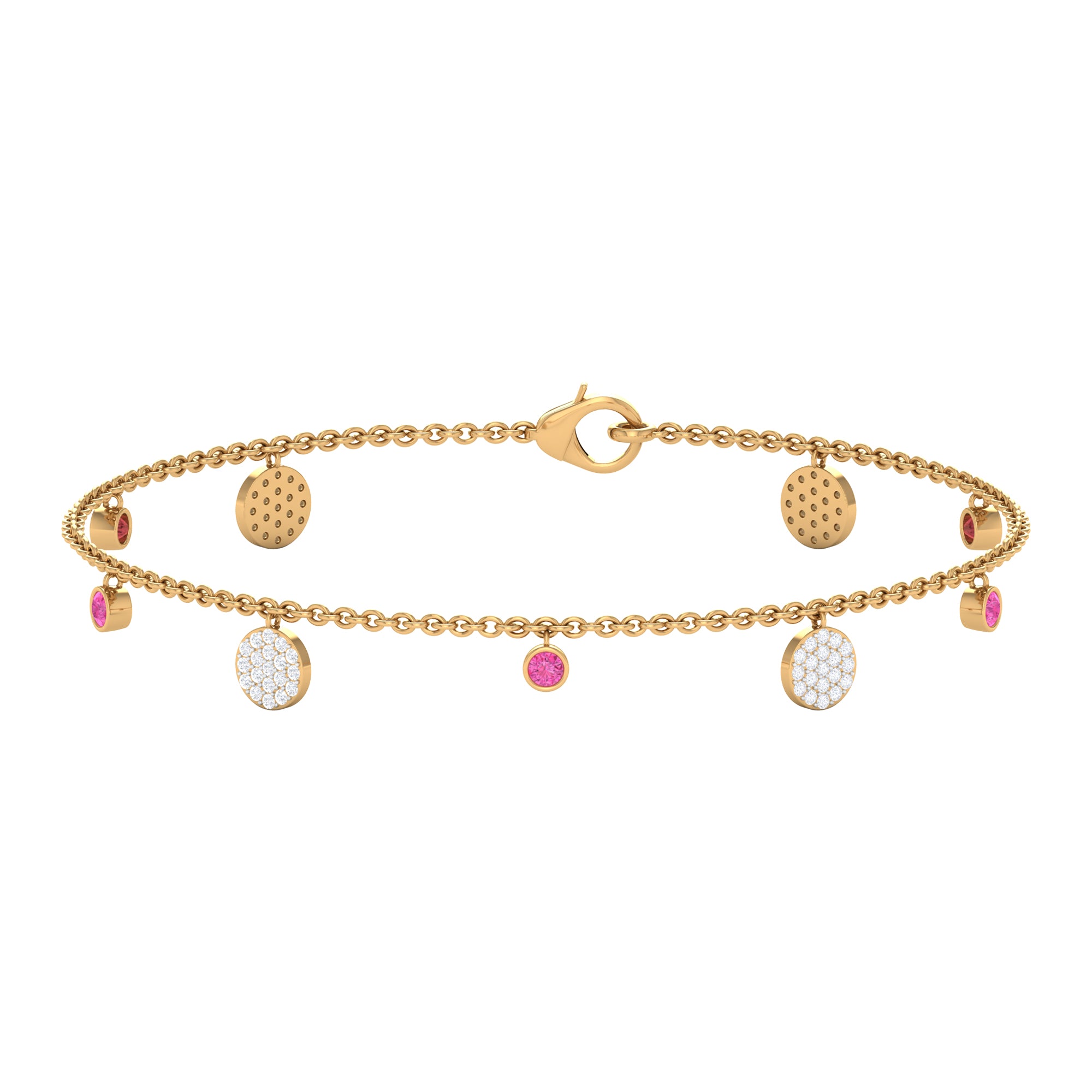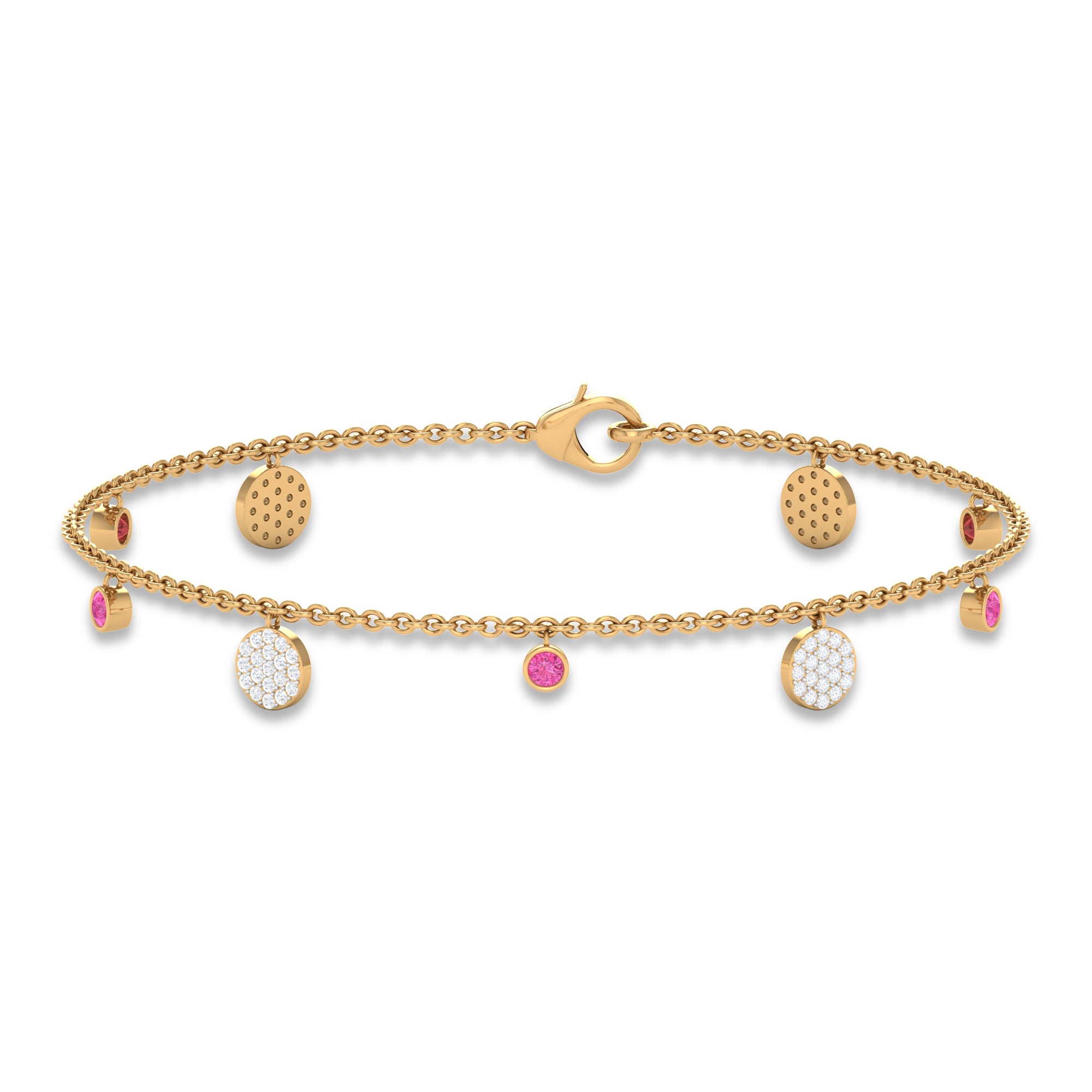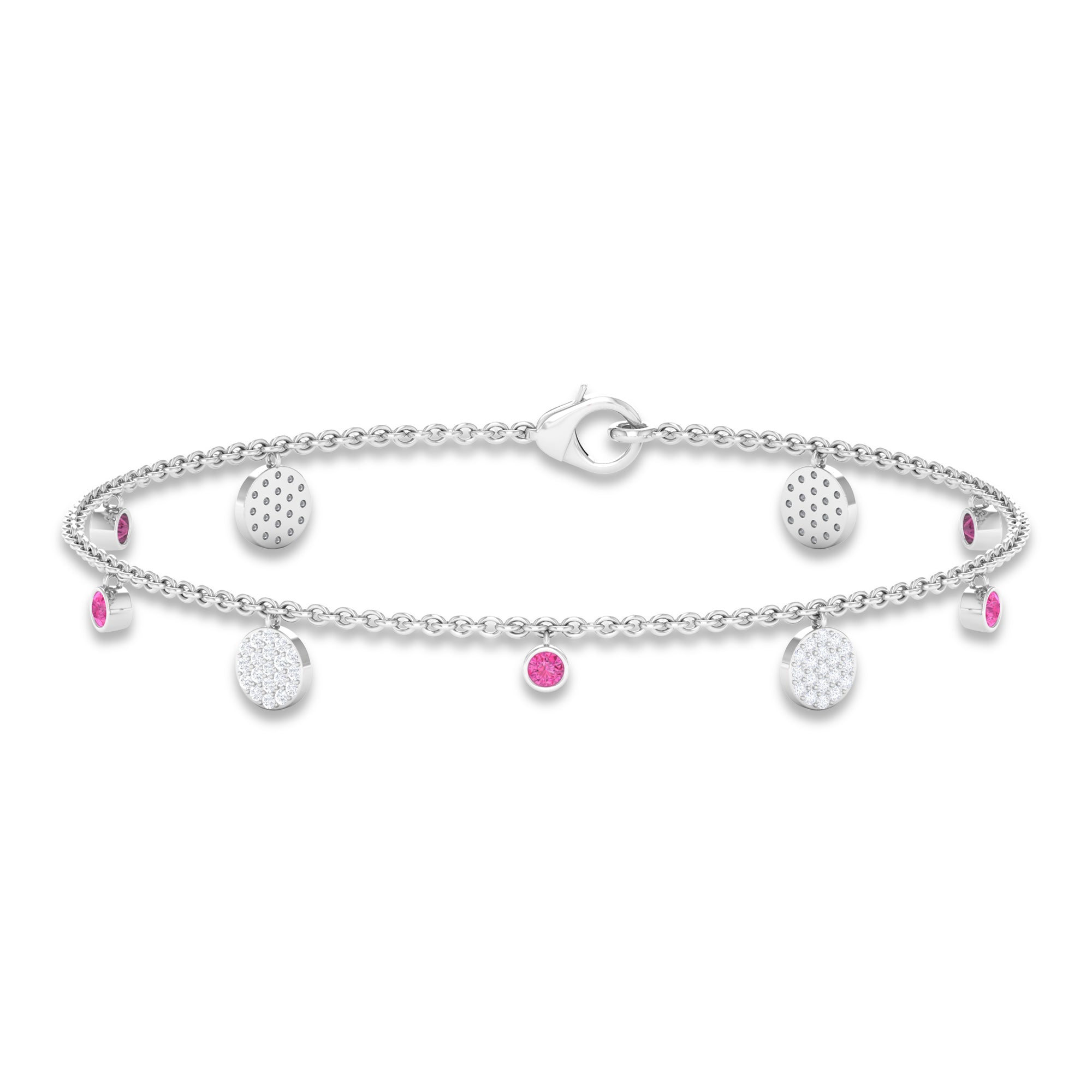Embrace elegance with our Chain Charm Bracelet, embellished with Round Pink Sapphires set in Bezel Setting, interspersed with diamond-encrusted round discs. This Station Chain Bracelet is equipped with a Lobster Claw clasp, enabling you to complement your preferred attire and radiate a celestial charm on your special occasion, appearing utterly captivating. The high-quality jewelry packaging ensures that the jewelry remains safeguarded throughout shipping and delivery, making it perfect for significant occasions such as birthdays, International Womens Day, Mothers Day, Valentines Day, graduations, and Thanksgiving. This Disc Charm Bracelet features a reliable lobster clasp, with a secure and comfortable fit. It represents love, strength, and inner brilliance, making it a considerate gift for yourself or a loved one. Its lightweight and versatile design offers the ideal amount of sparkle without being excessive. You can wear this Layering Bracelet alone for a minimalist appearance or combine it with another bracelet for a striking statement; in either case, it will provide you with the perfect style to shine in any occasion.