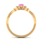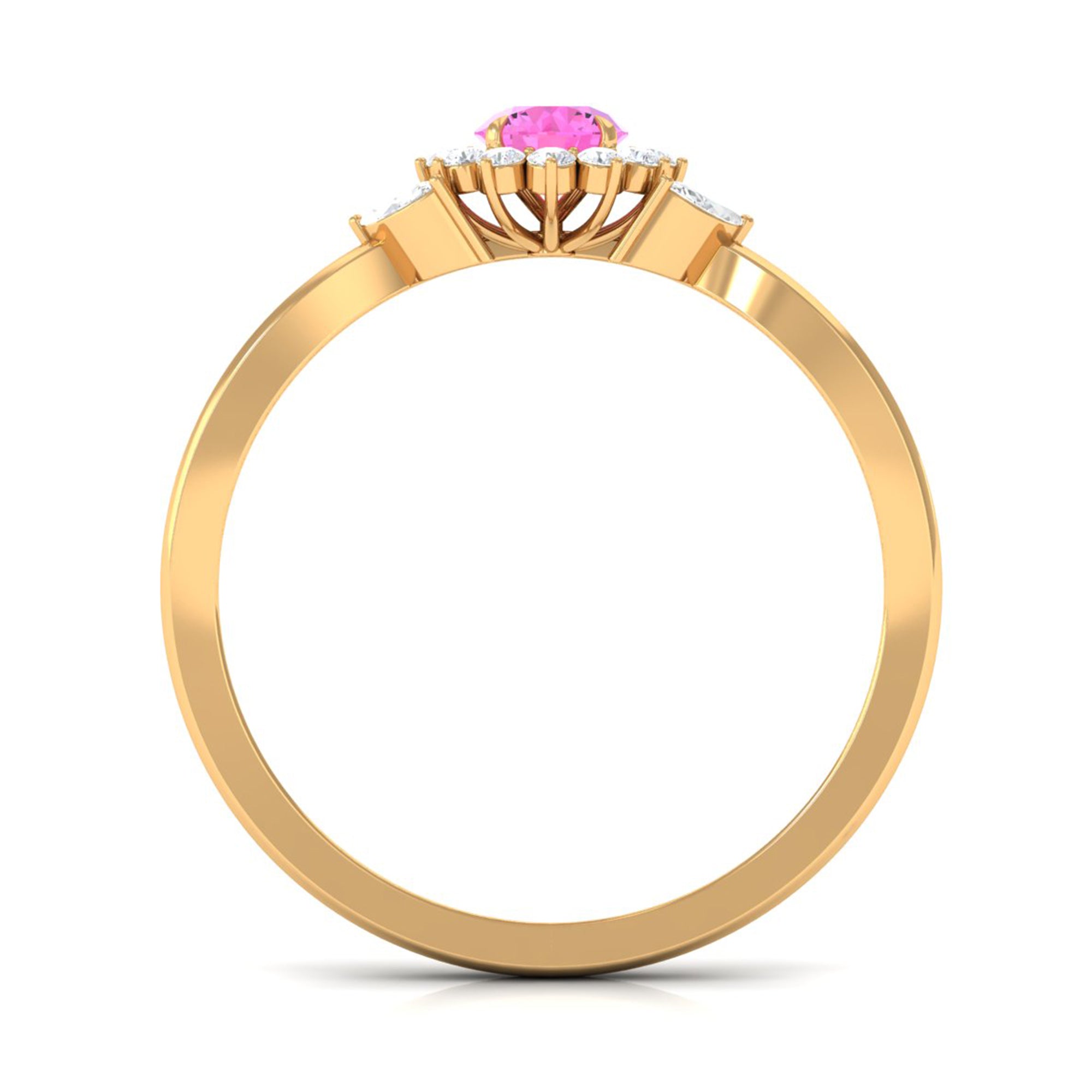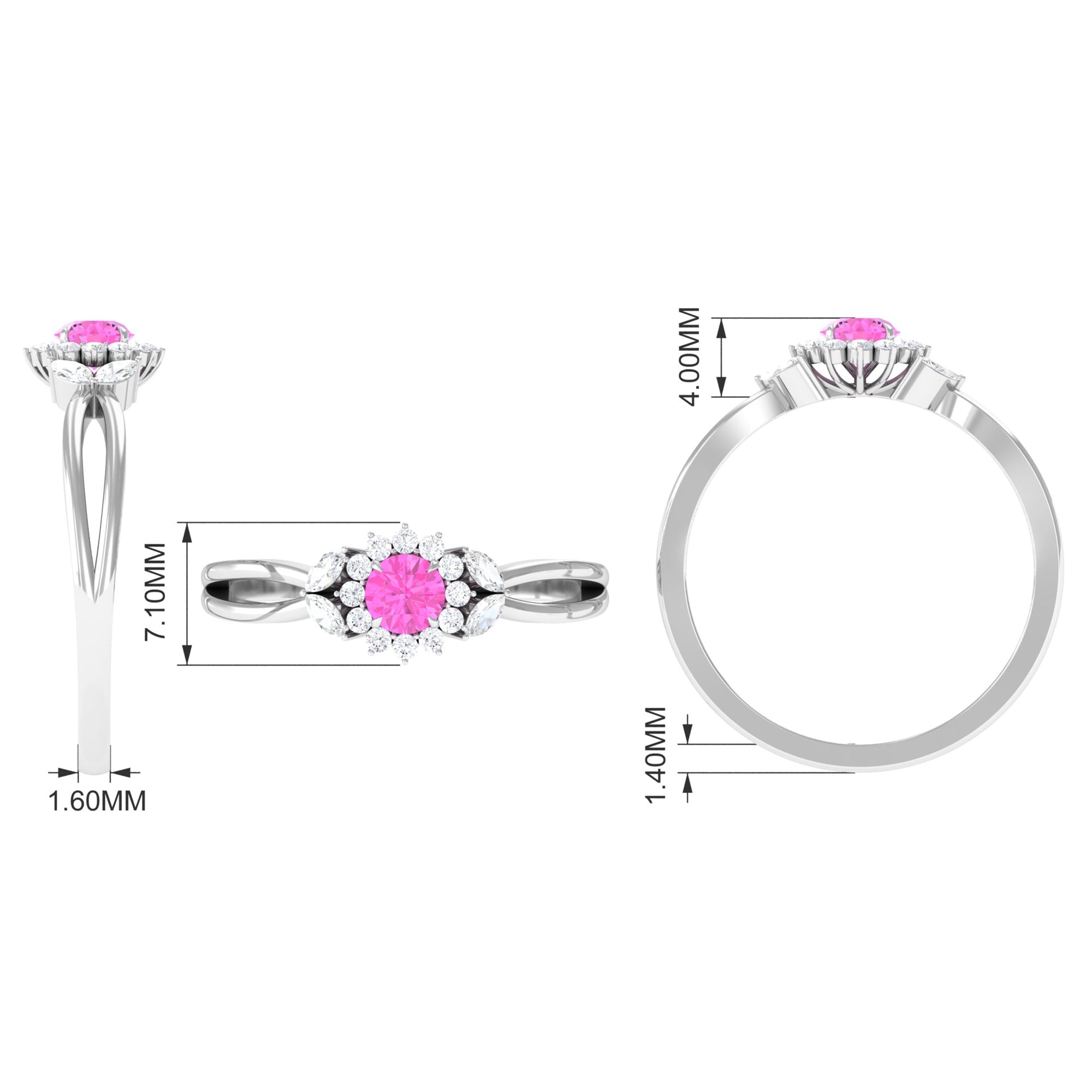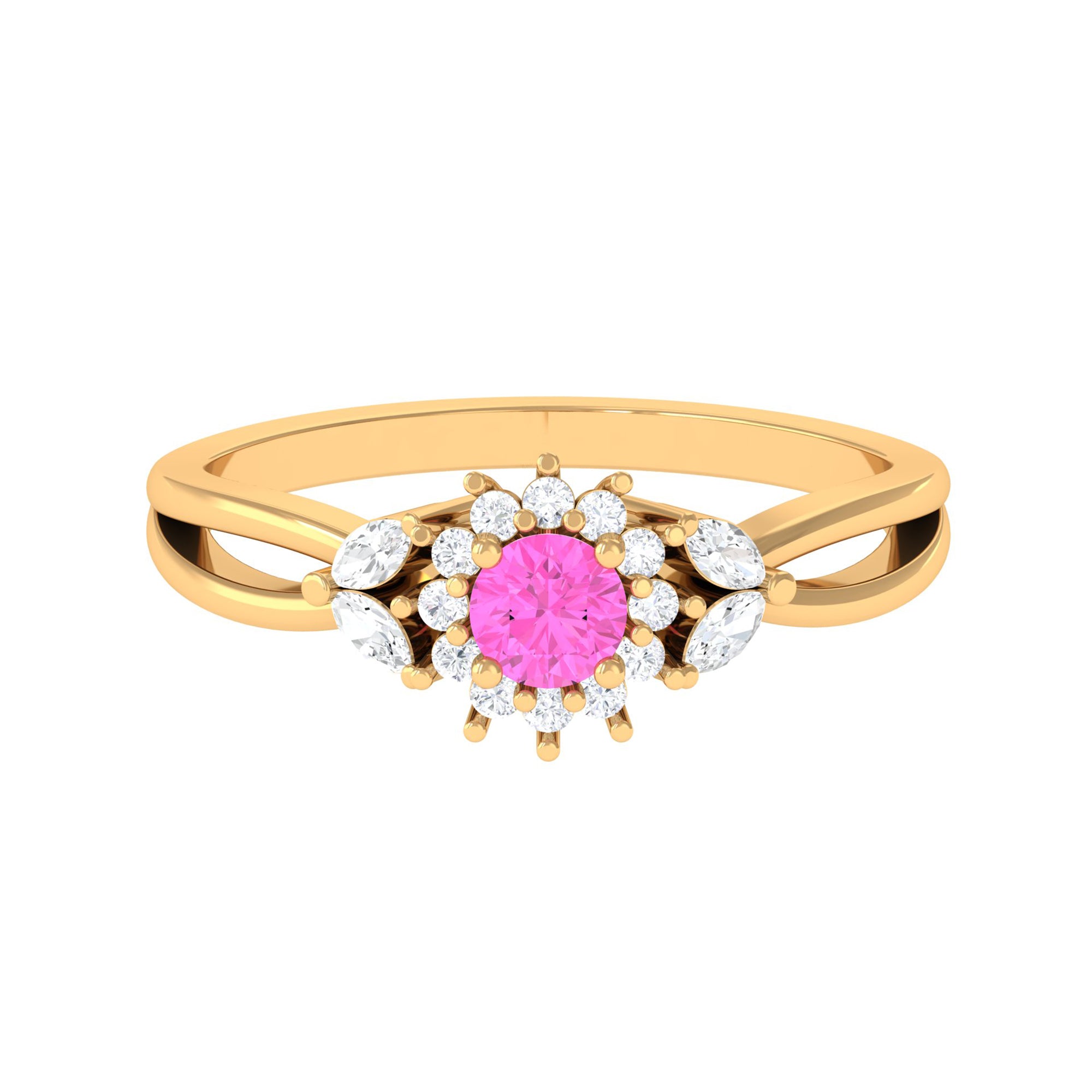 The Floral Ring is featuring a Round Pink Sapphire, held in Claw Setting, and a Halo of Round Diamond along with Marquise Cut Diamond. This Pink Sapphire Engagement Ring is an alluring piece of fine jewelry, it has a split shank to give it a captivating touch.
